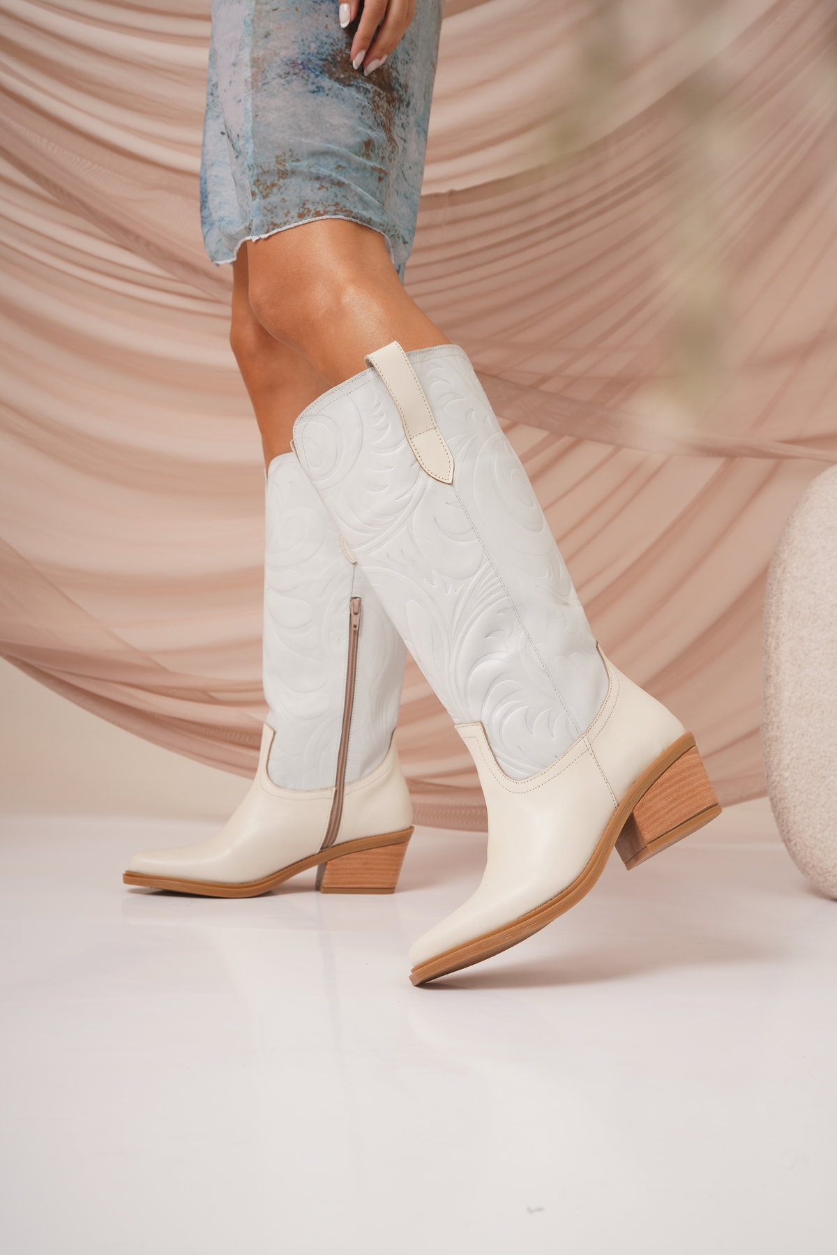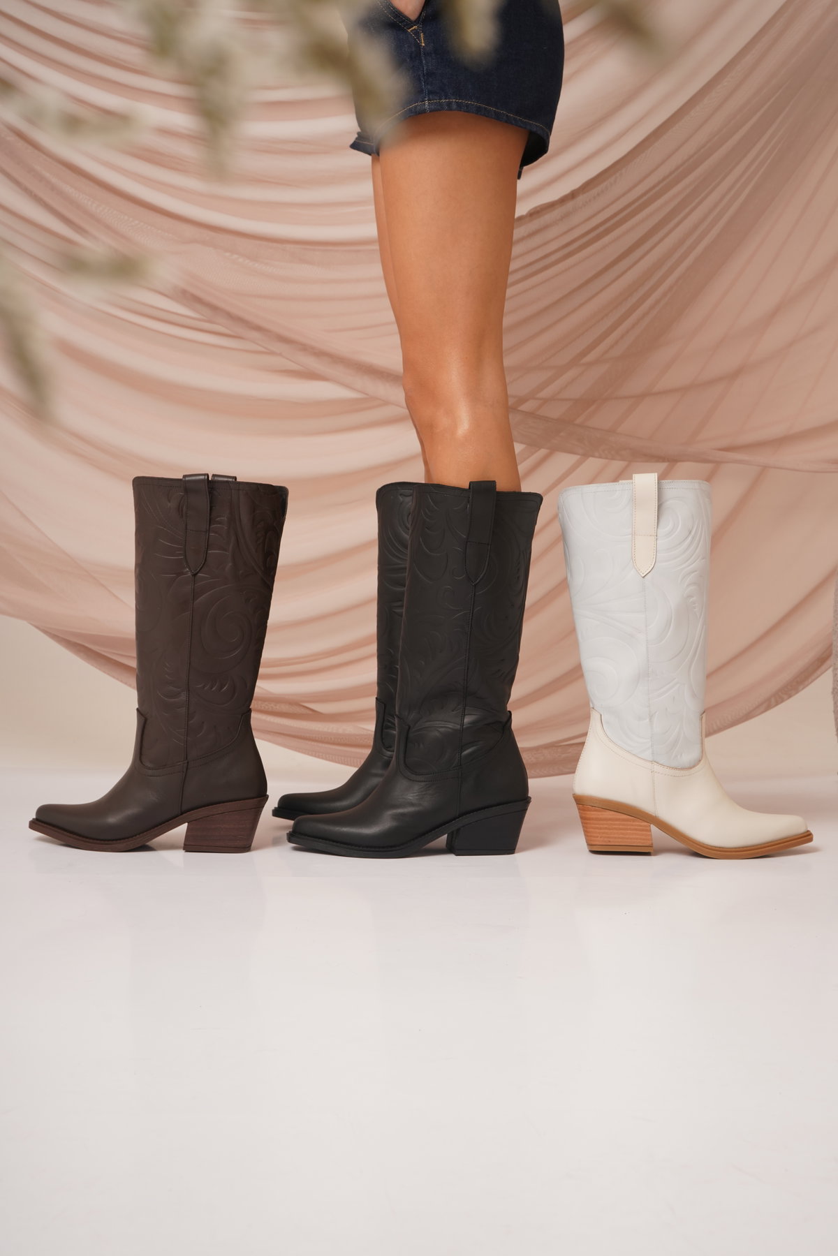 Bota caña alta estilo texana, un clásico que no pasa de moda. Su diseño limpio y elegante estiliza la pierna y levanta cualquier look, desde jeans hasta vestidos. Un modelo versátil, cómodo y con mucha presencia. Taco aprox 5 cm.