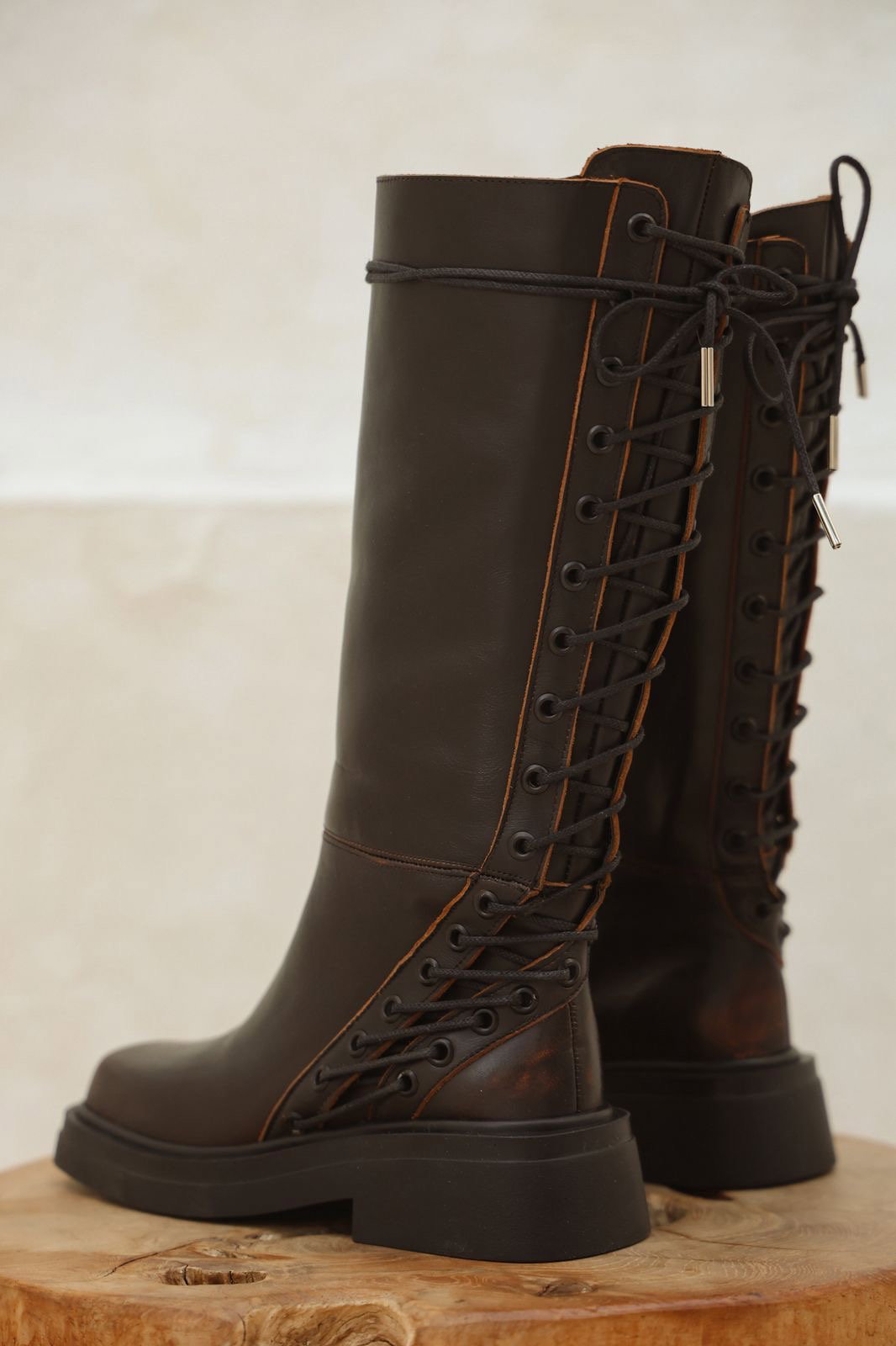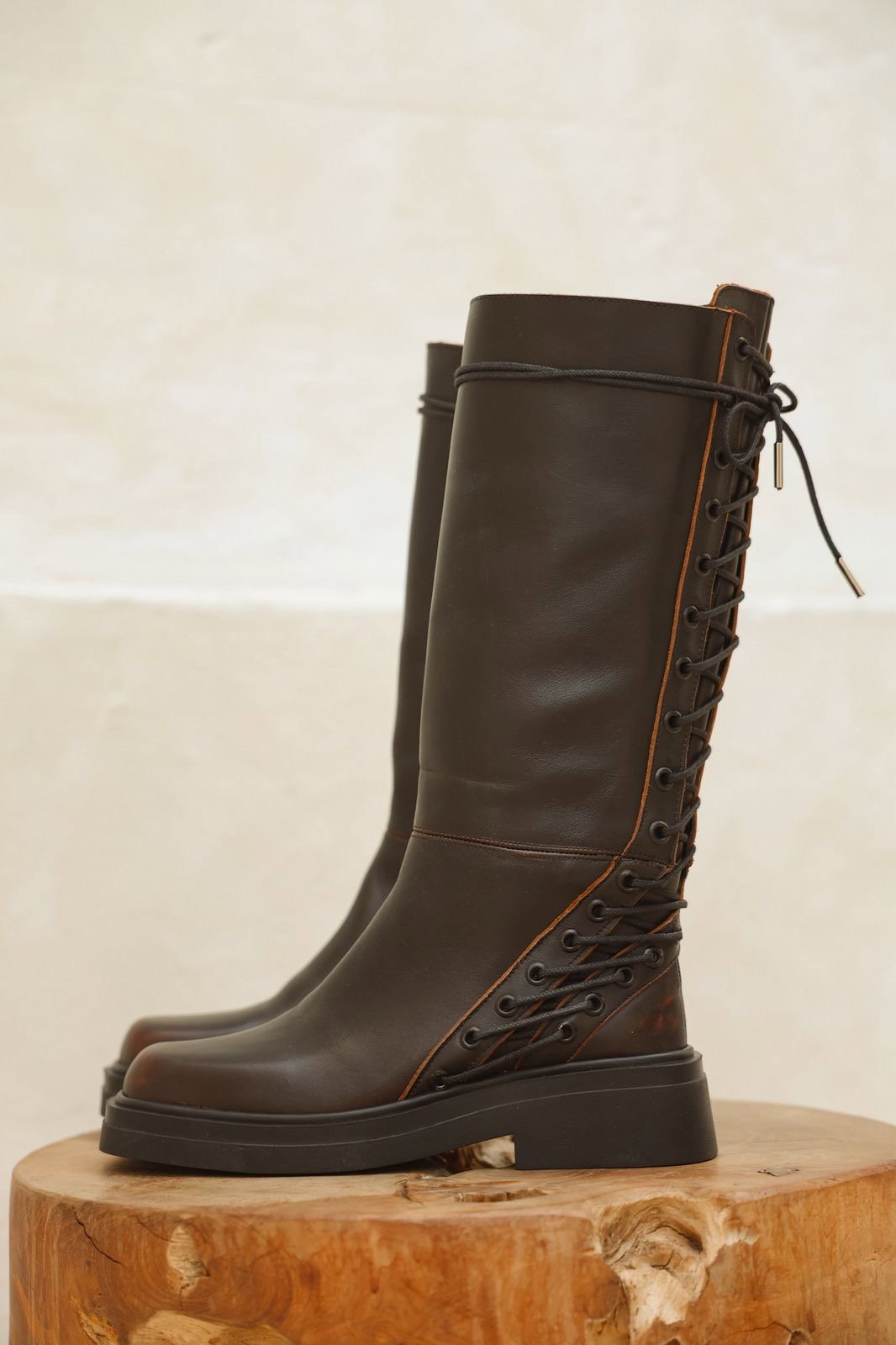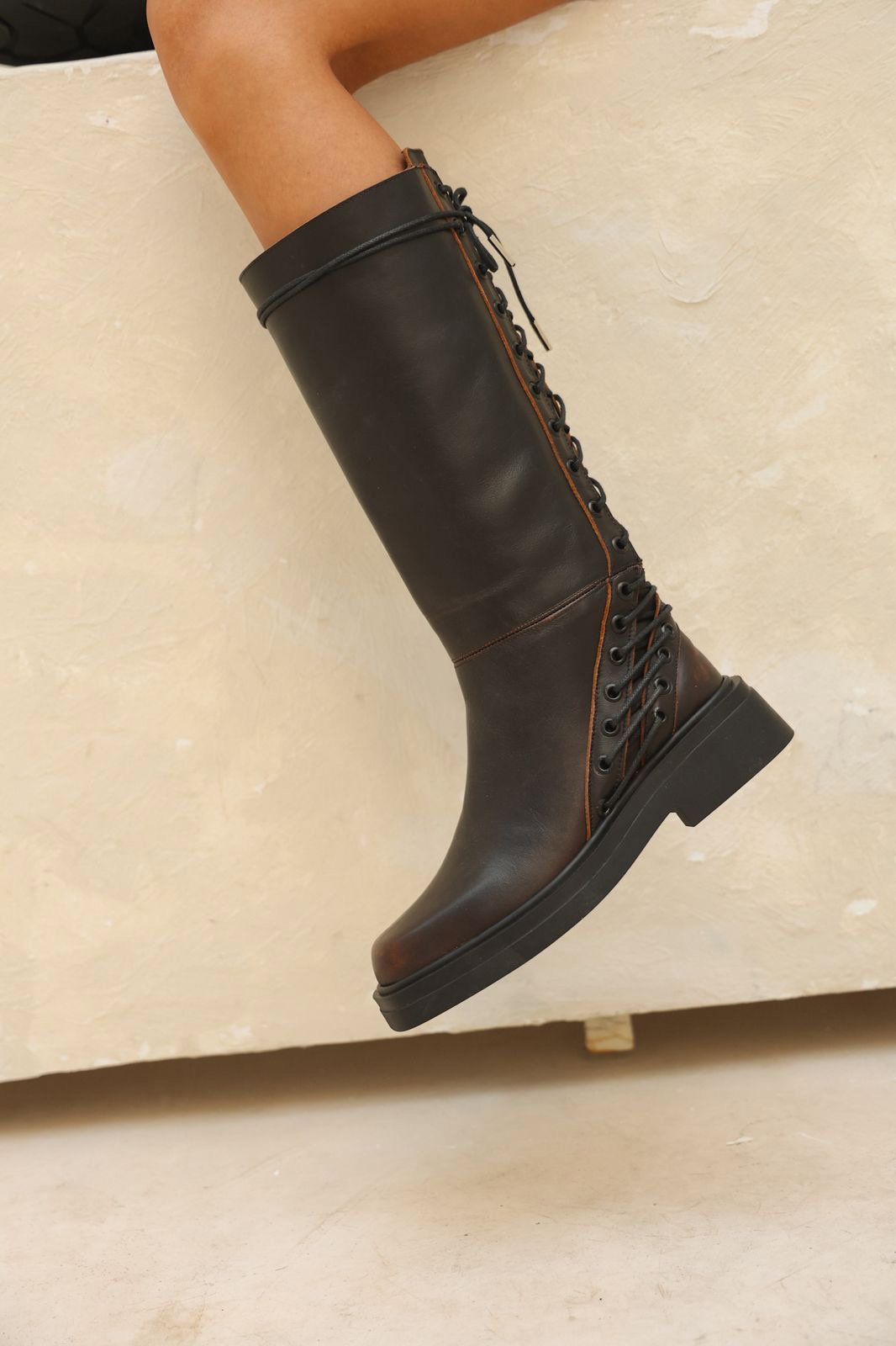 BORCEGO caña alta de cuero con diseño moderno y actitud. El detalle acordonado le suma carácter y la hace único, mientras que su base robusta aporta comodidad y presencia. Ideal para elevar cualquier look con un toque urbano y canchero.