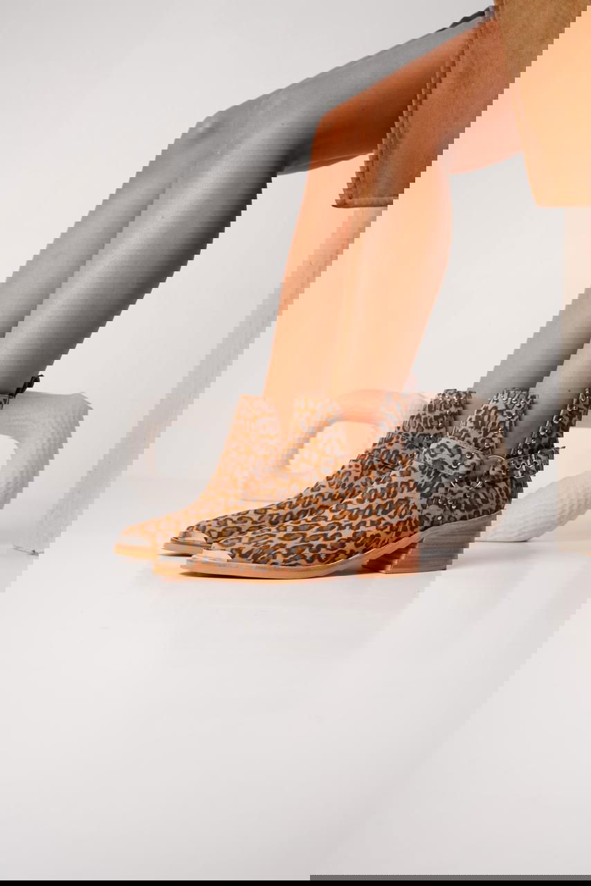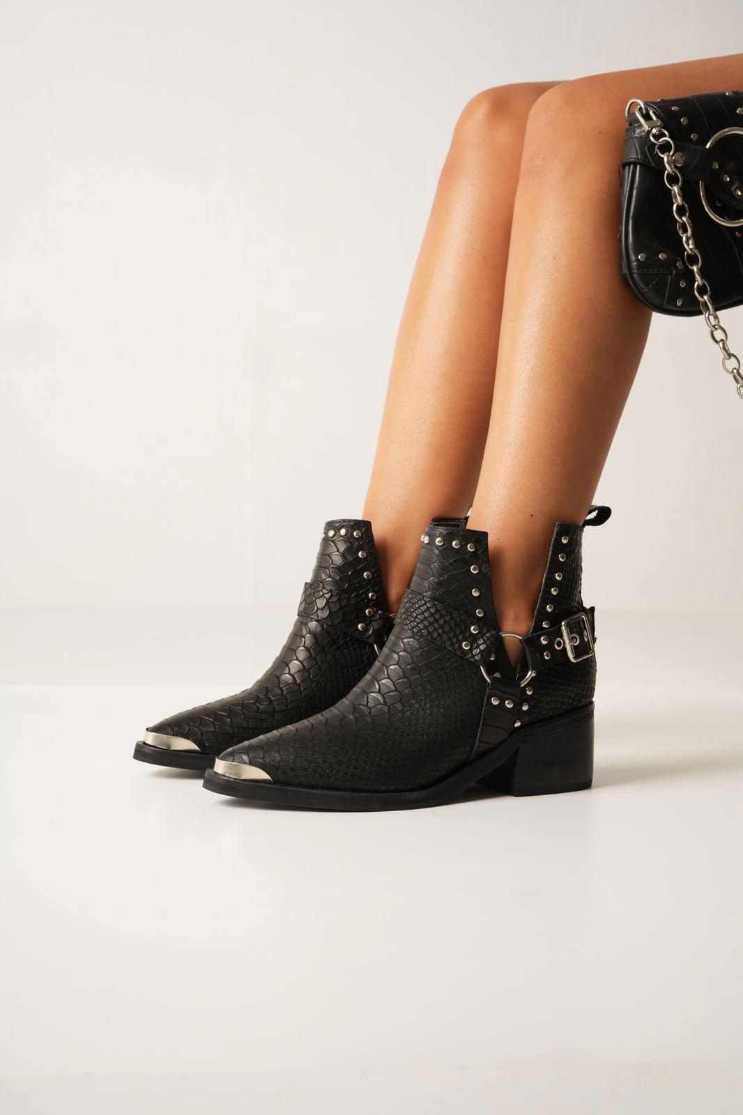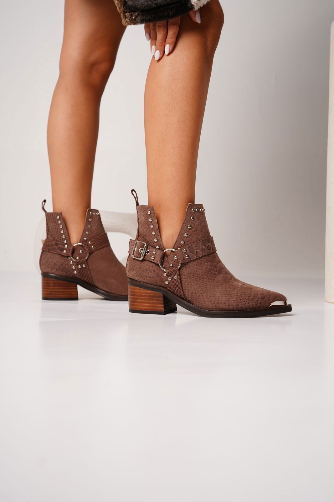 Botas cortas de cuero vacuno con textura grabada, diseño estilo western urbano y detalle de tachas metálicas que recorren el contorno. Cuentan con tira envolvente con hebilla regulable y aro metálico, logrando un look fuerte y canchero, ideal para elevar cualquier outfit de día o de noche.