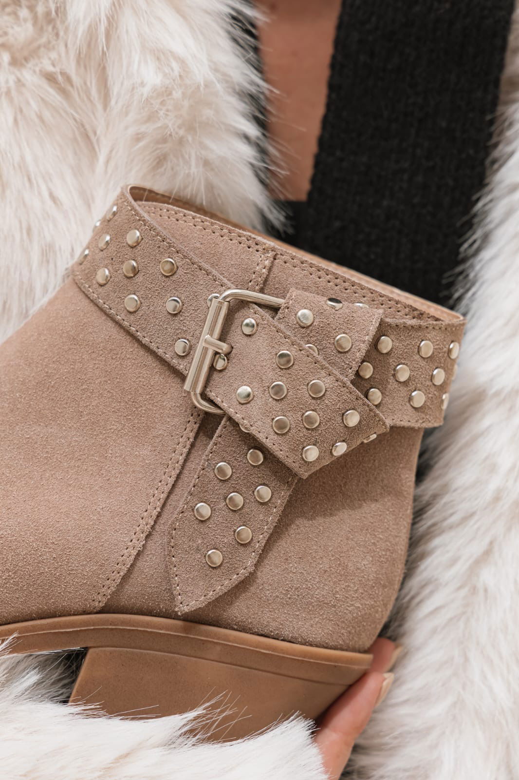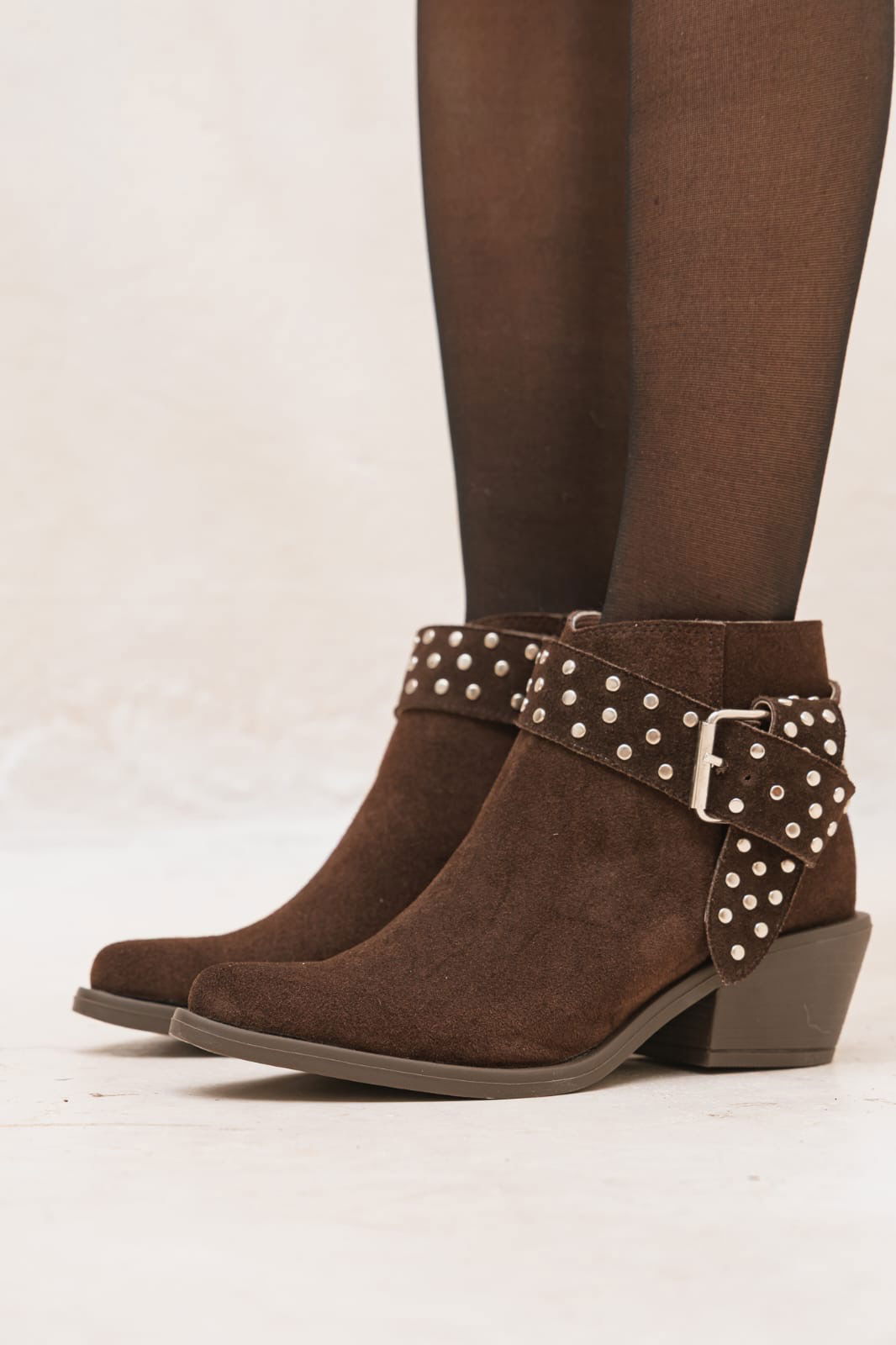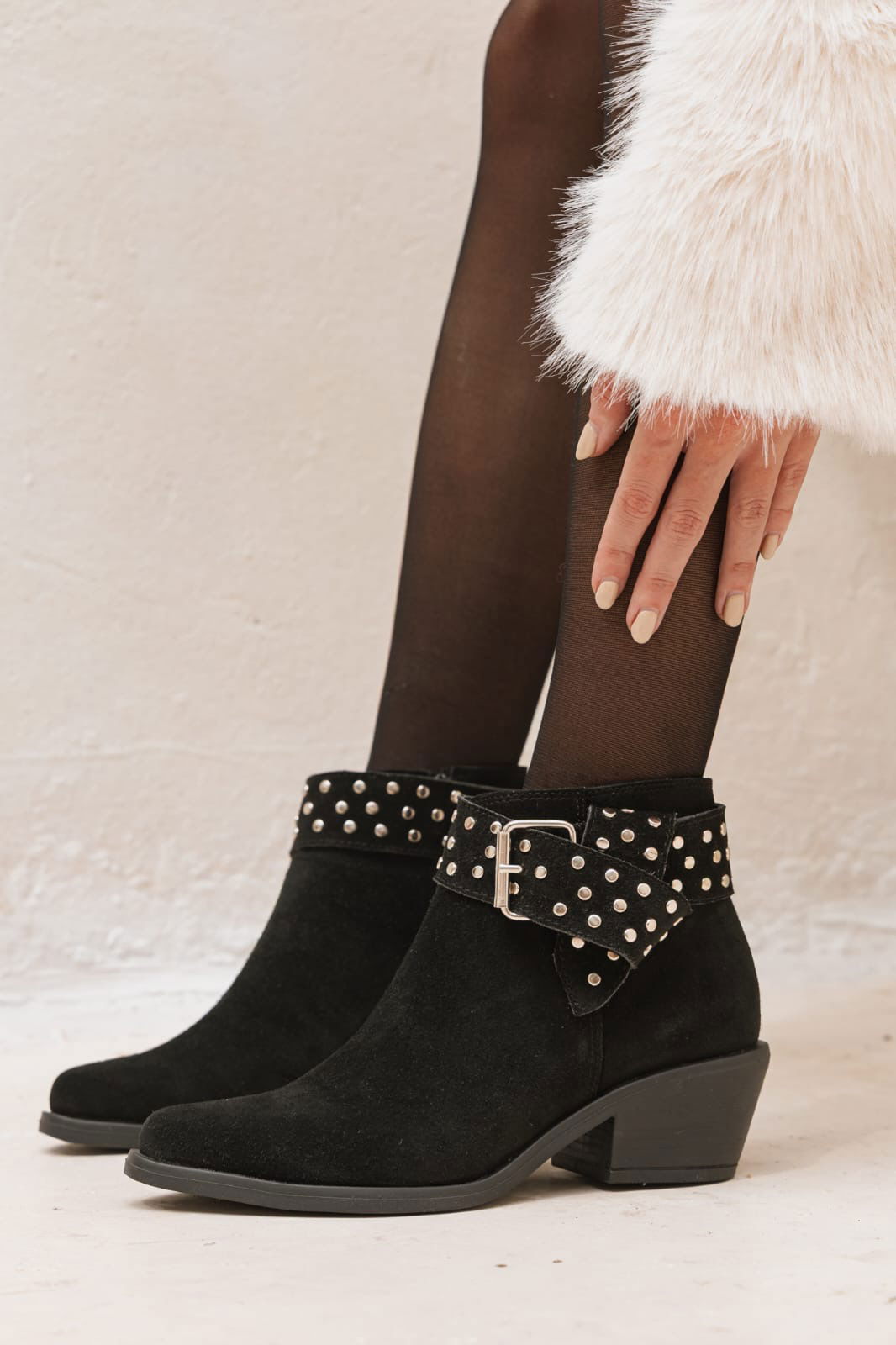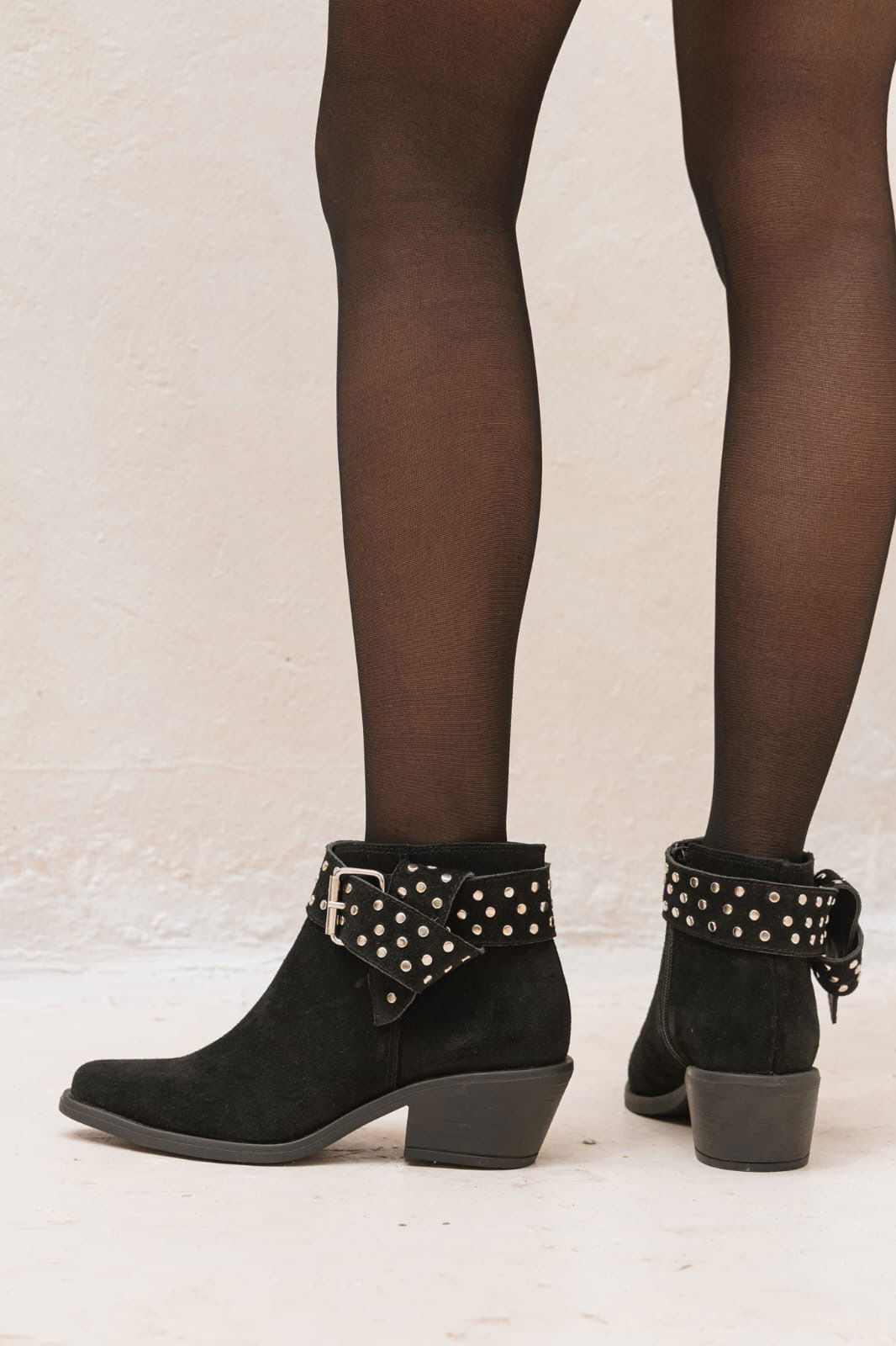 Botineta de estilo rocker con tachas y hebilla que le aportan un carácter único a cualquier look. Canchera, versátil y con ese detalle protagonista que levanta hasta el outfit más básico. Ideal para usar de día o de noche.