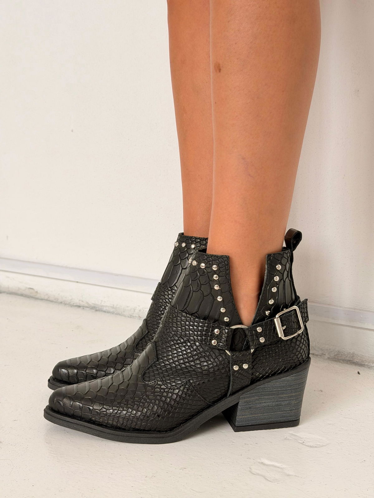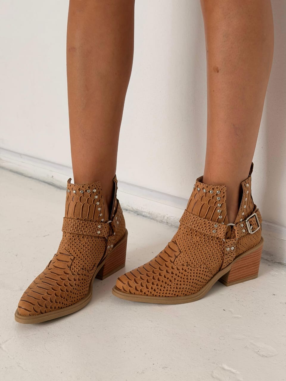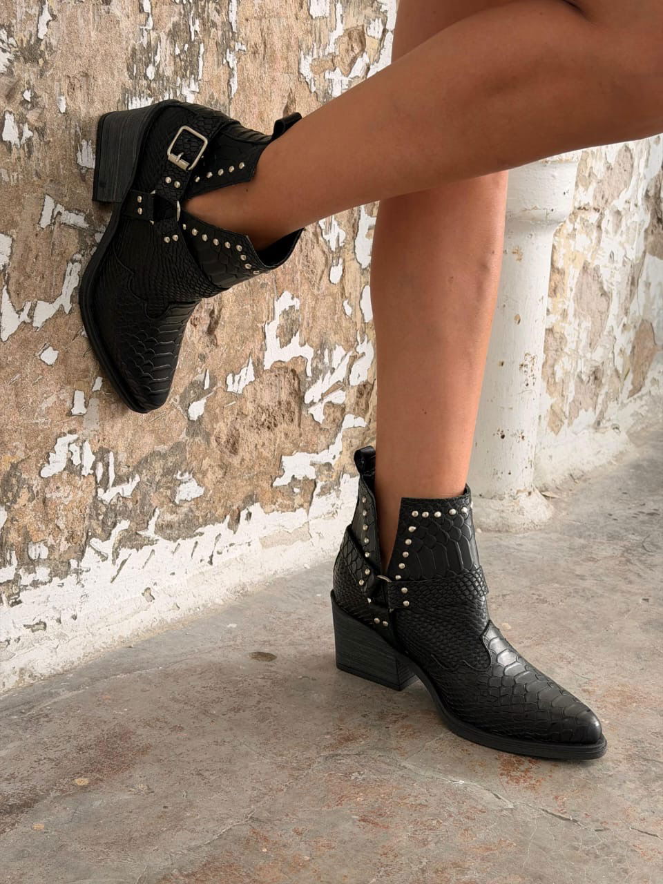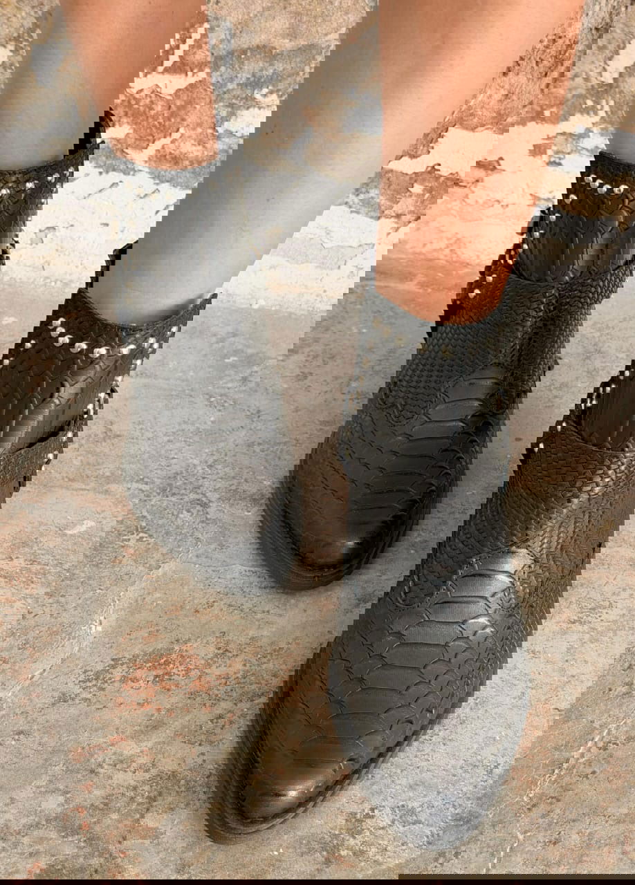 Botas confeccionadas en cuero grabado con textura tipo reptil, de diseño protagonista y estilo rock–boho. Se destacan por sus recortes laterales en "V" y tiras con hebillas metálicas y apliques de tachas plateadas que aportan carácter y personalidad. Presentan punta afinada y un taco madera súper estable, ideales para elevar looks urbanos y descontracturados, combinando fuerza y estilo en una sola pieza.
