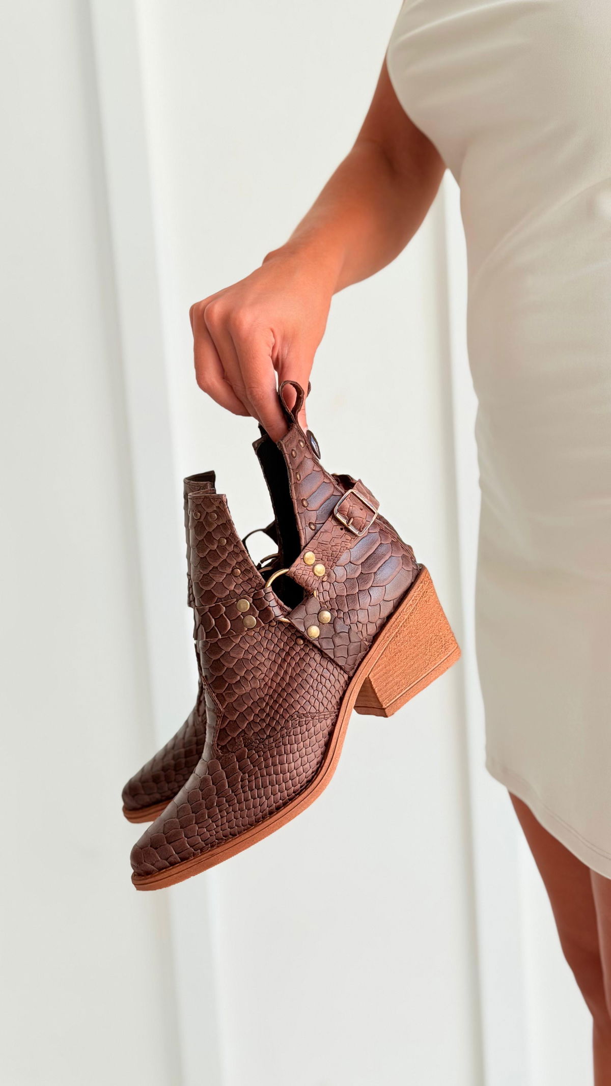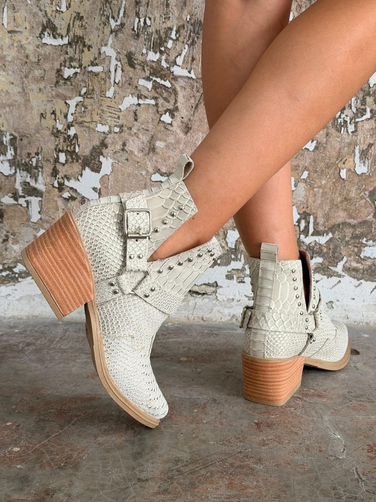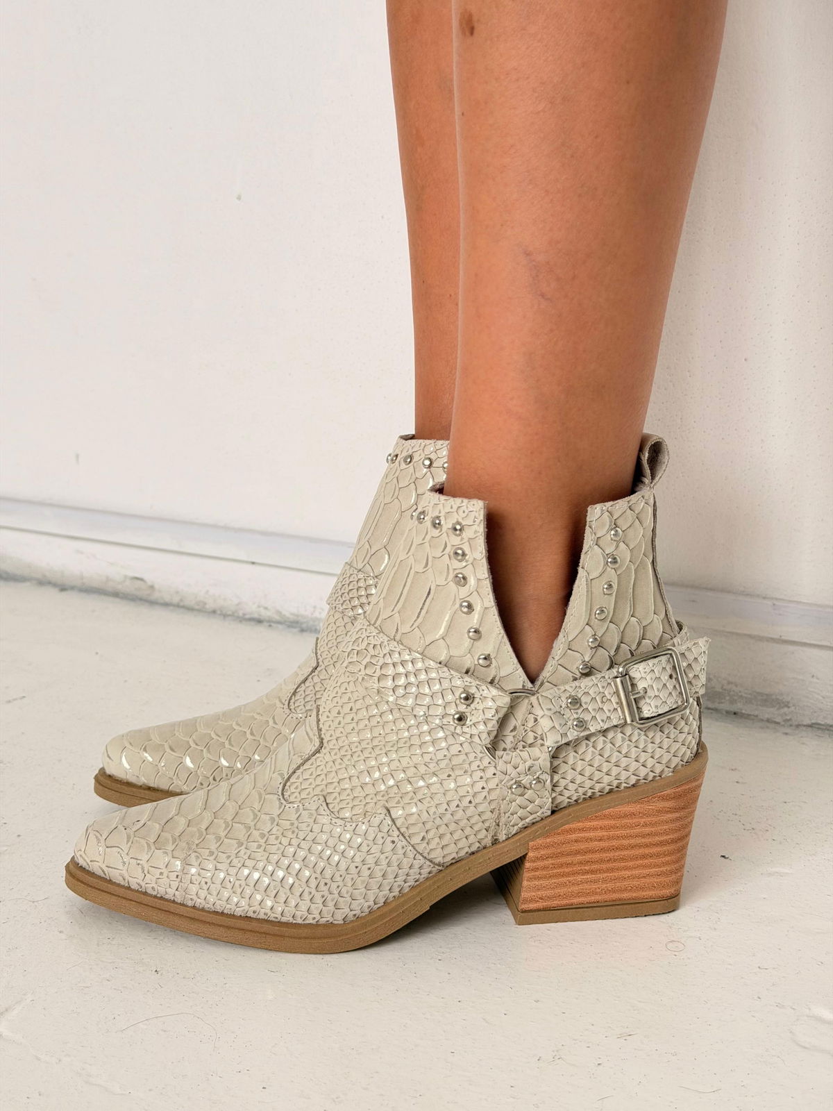 Botas confeccionadas en cuero grabado con textura tipo reptil, de diseño protagonista y estilo rock–boho. Se destacan por sus recortes laterales en "V" y tiras con hebillas metálicas y apliques de tachas plateadas que aportan carácter y personalidad. Presentan punta afinada y un taco madera súper estable, ideales para elevar looks urbanos y descontracturados, combinando fuerza y estilo en una sola pieza.
