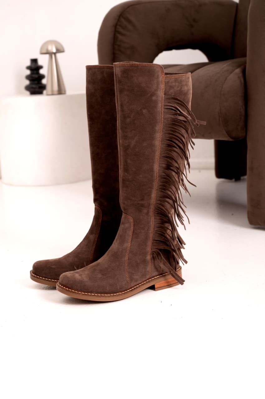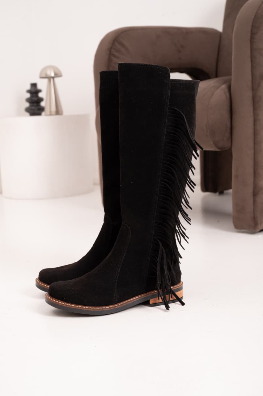 Bota caña alta estilo boho con flecos laterales que le dan movimiento y un toque súper canchero. Un modelo protagonista que levanta cualquier outfit y suma personalidad al look, ideal para usar con vestidos, jeans o faldas.