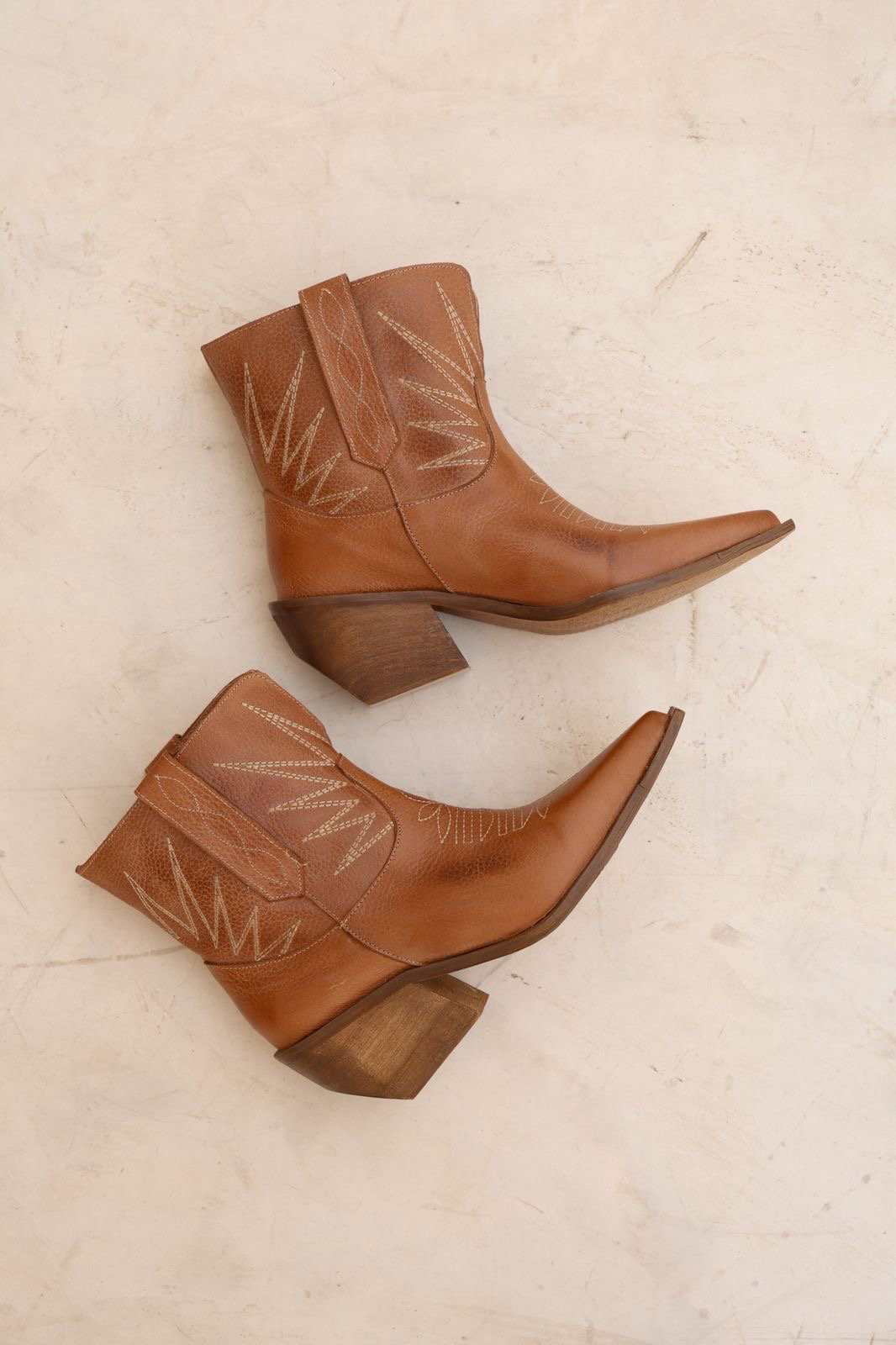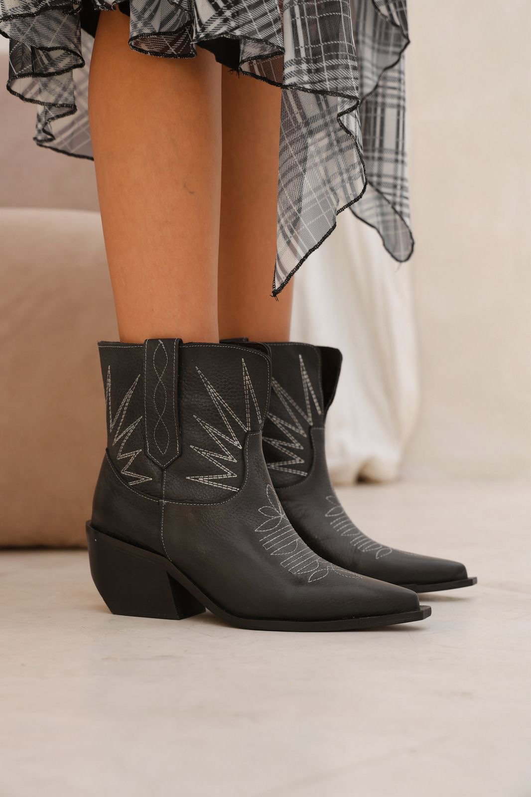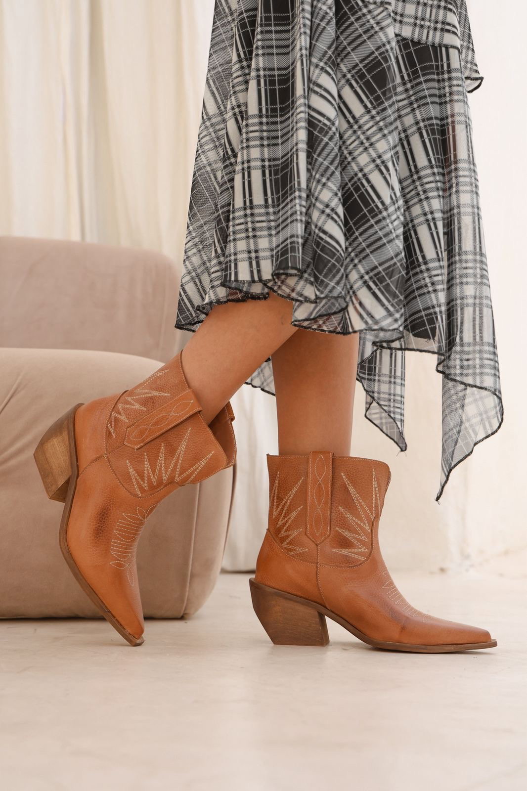 Bota estilo texana de cuero con bordados que marcan tendencia. Su diseño de caña corta y taco medio aporta ese toque canchero que eleva cualquier look, combinando actitud y comodidad para usar todo el día.