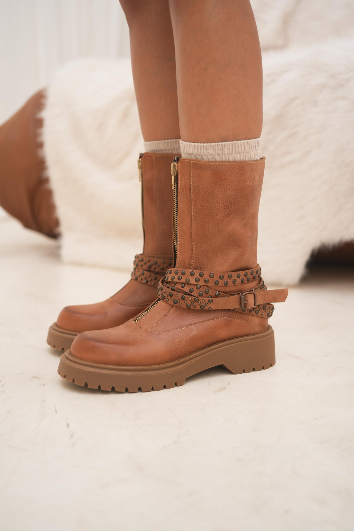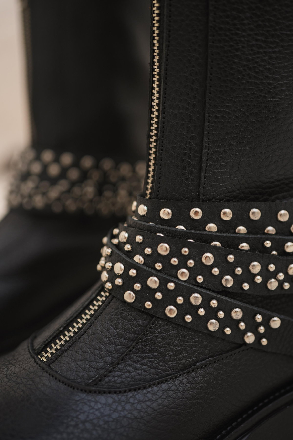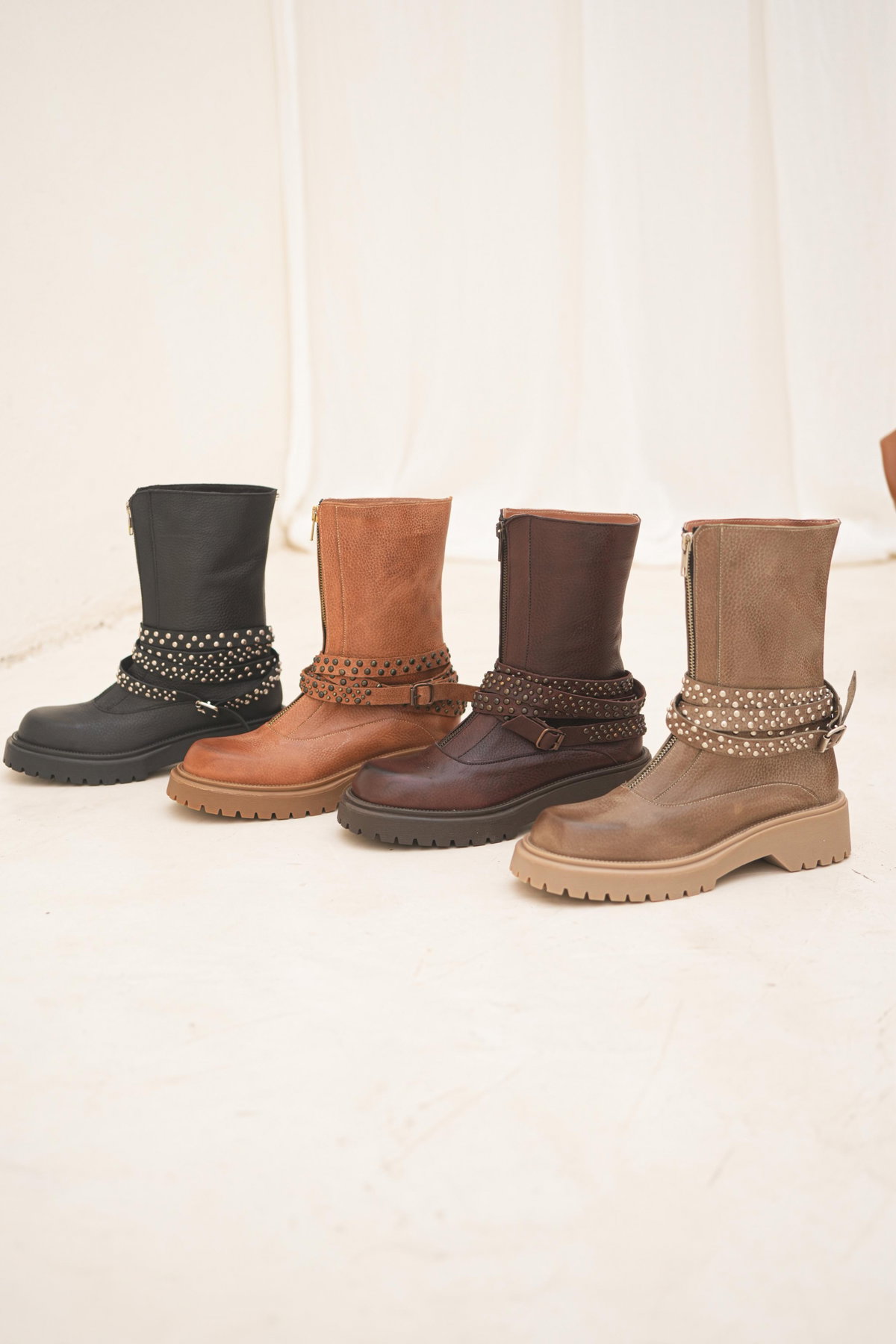 Bota de caña media con base chunky y detalle de pulsera con tachas que le da un toque rocker y canchero. La pulsera es desmontable, lo que te permite usarla de dos formas y adaptarla a distintos looks. Un modelo versátil que combina comodidad y estilo.