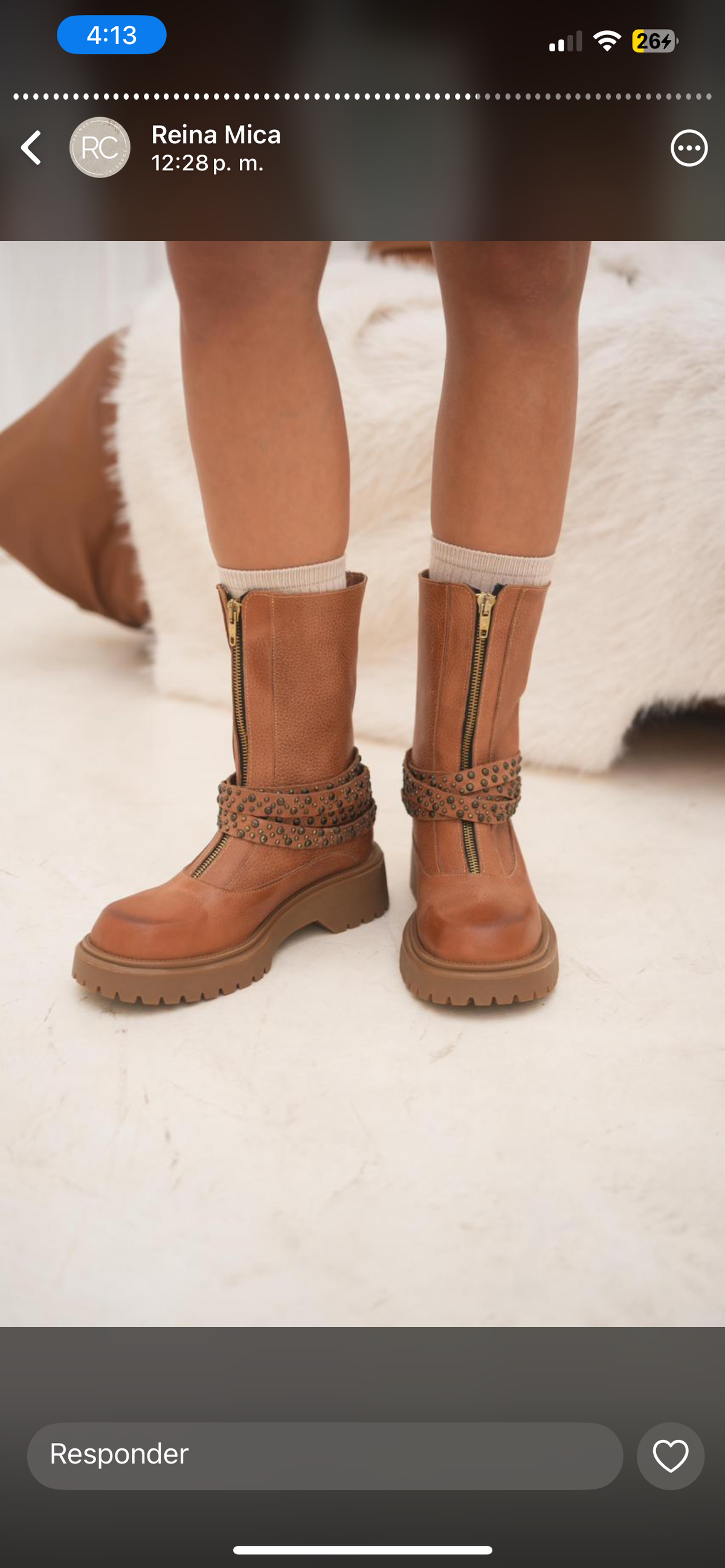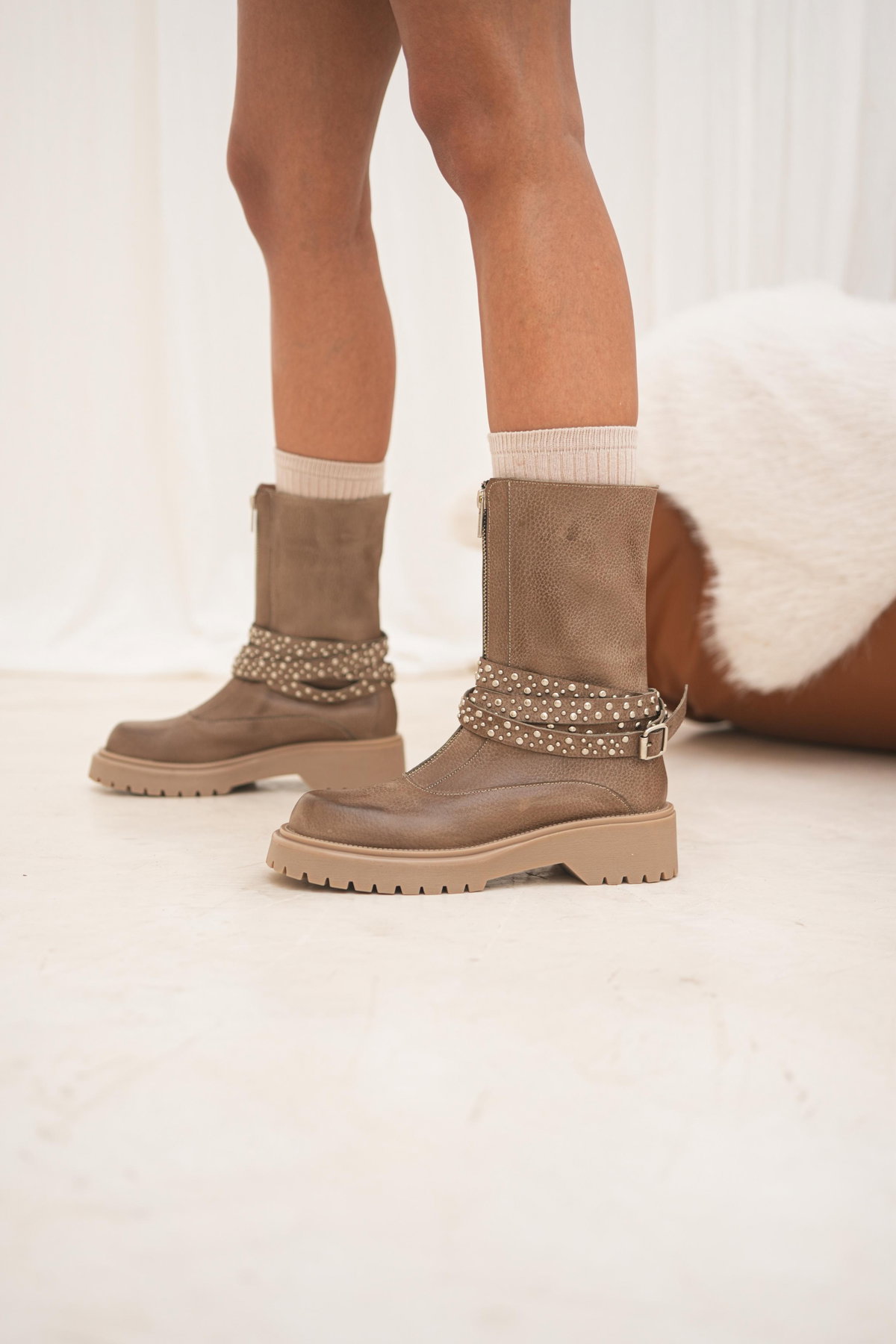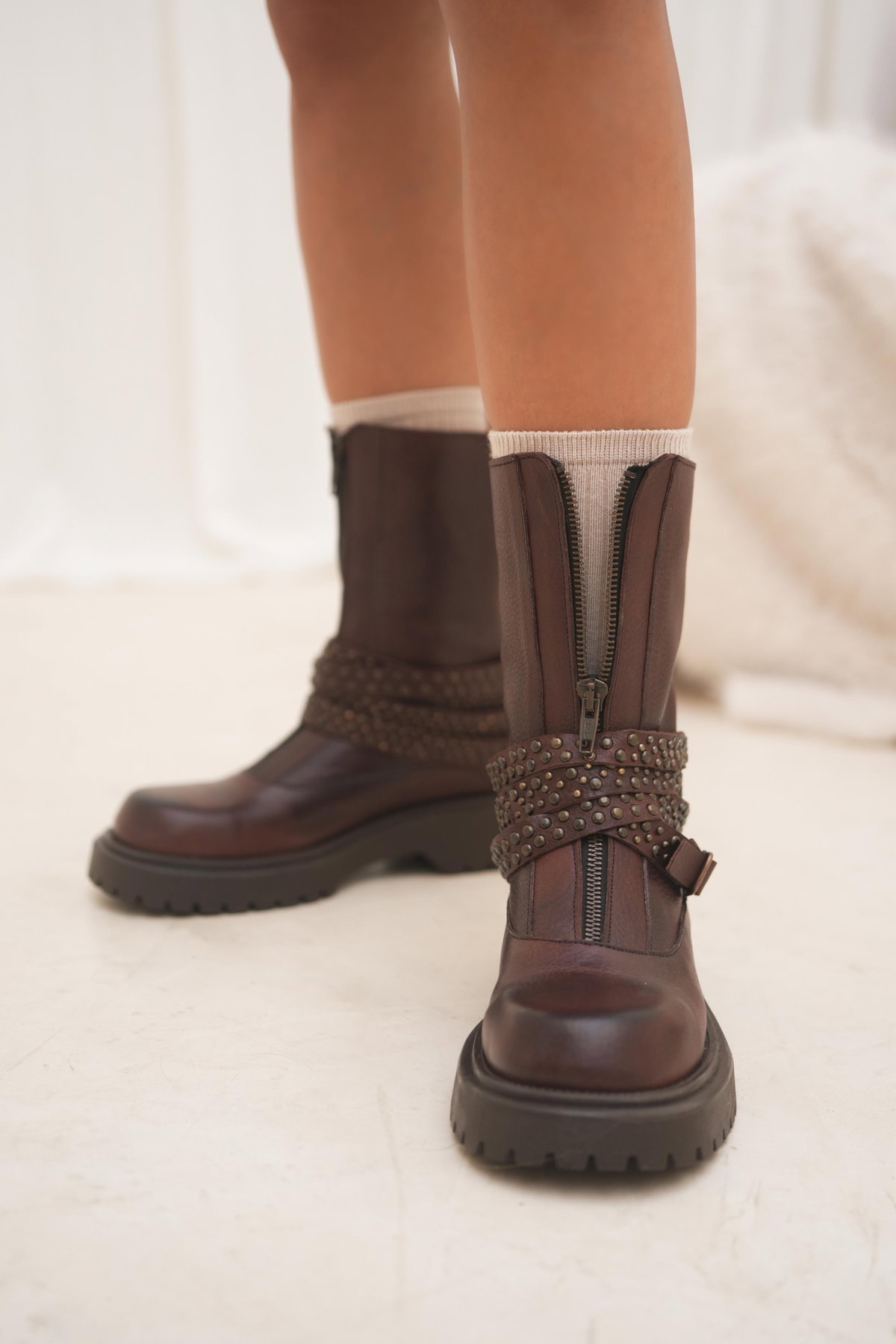 Bota de caña media con base chunky y detalle de pulsera con tachas que le da un toque rocker y canchero. La pulsera es desmontable, lo que te permite usarla de dos formas y adaptarla a distintos looks. Un modelo versátil que combina comodidad y estilo.