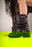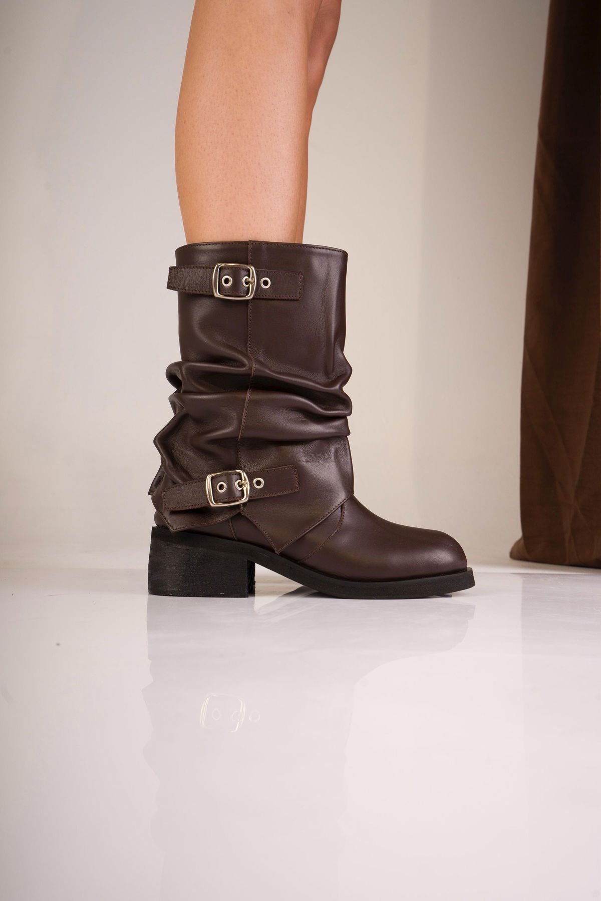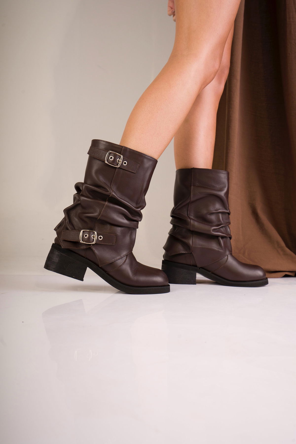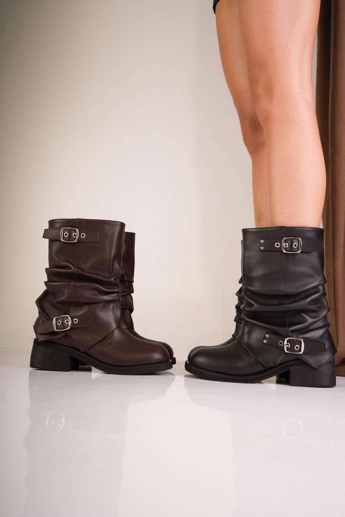 Botas confeccionadas en cuero liso de alta calidad, con un diseño de caña media texturizada y arrugada que aporta un estilo relajado y vanguardista. Se destacan por sus tiras con hebillas metálicas plateadas en la parte superior e inferior de la caña, brindando un toque rebelde y sofisticado. Presentan punta redondeada y una base robusta con taco bajo, ideales para un uso diario intensivo sin perder el estilo.