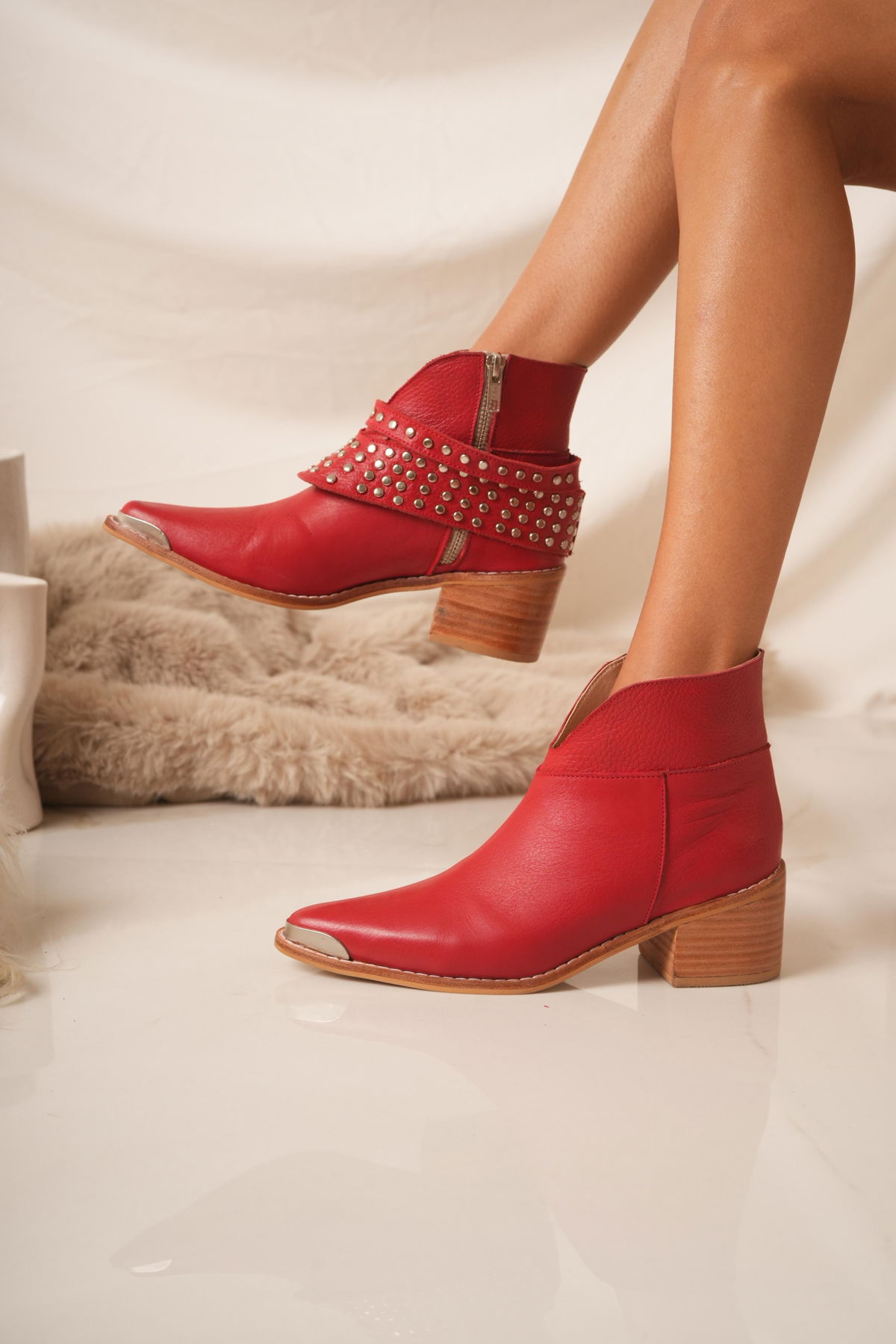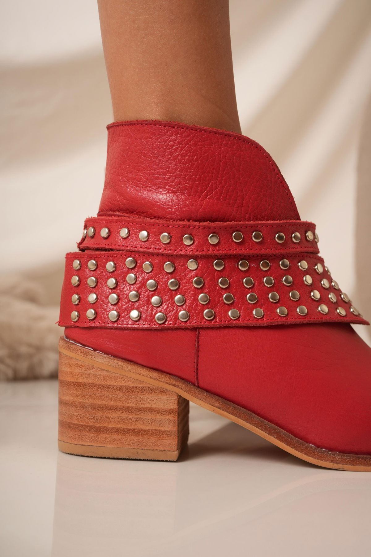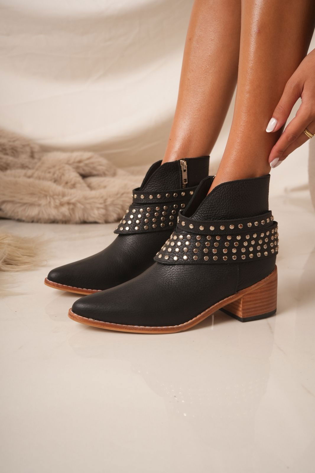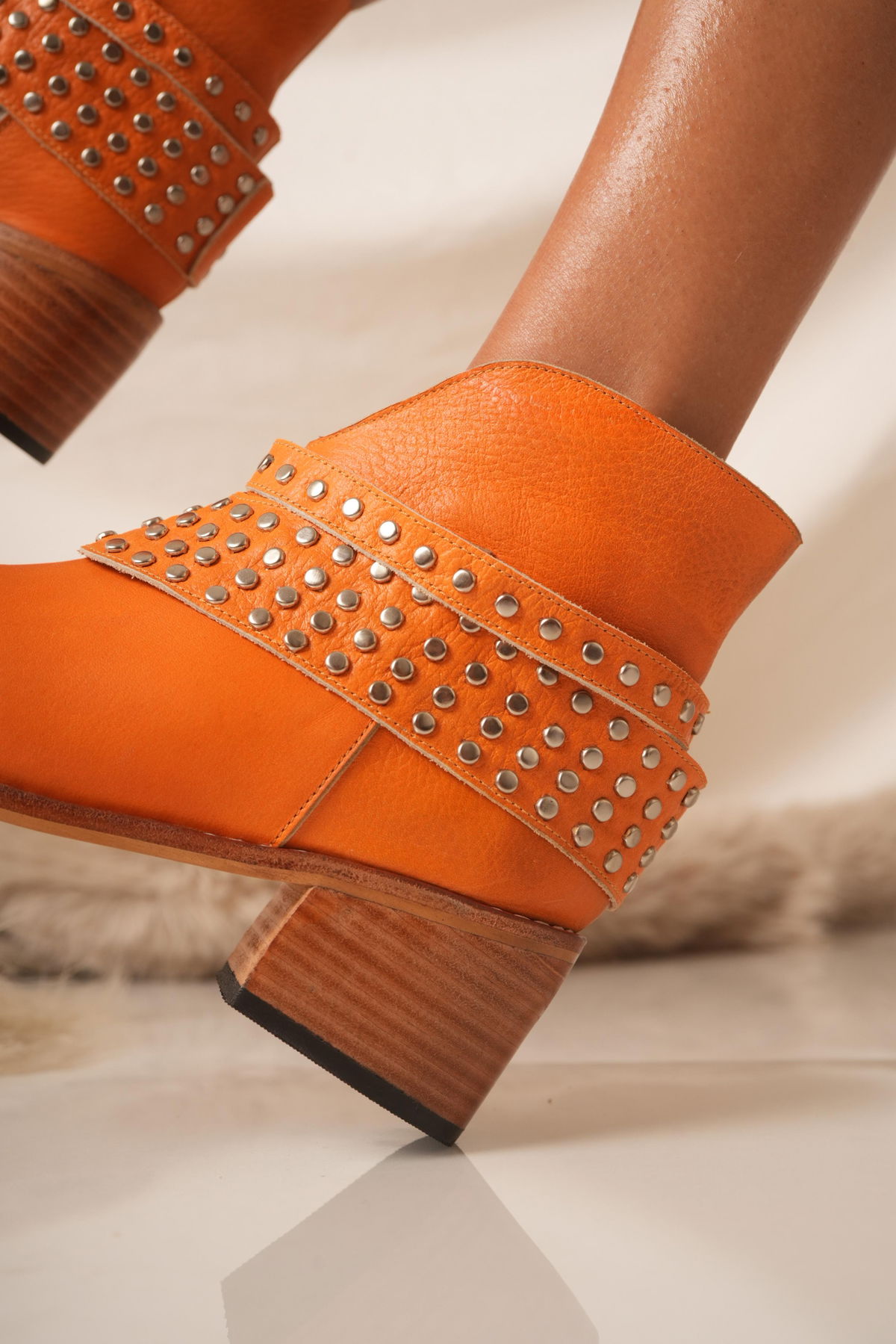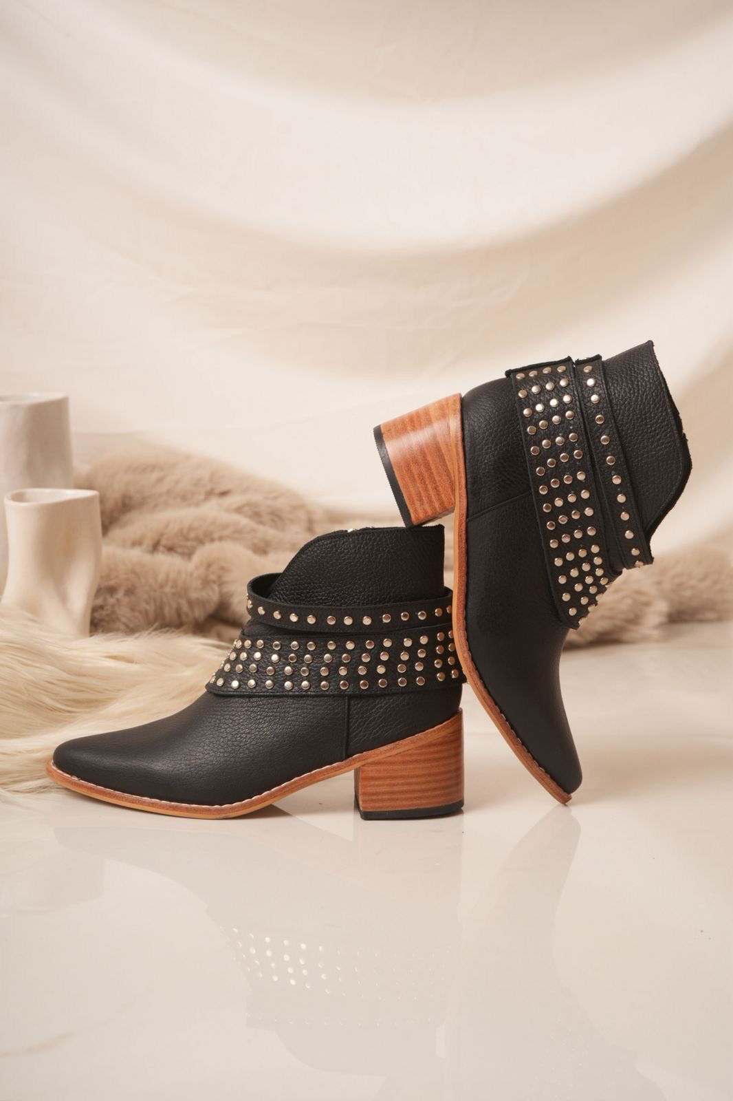 Botinetas confeccionadas en cuero, con diseño moderno y carácter urbano. Detalles de tachas metálicas y taco de madera de 7 cm aprox.