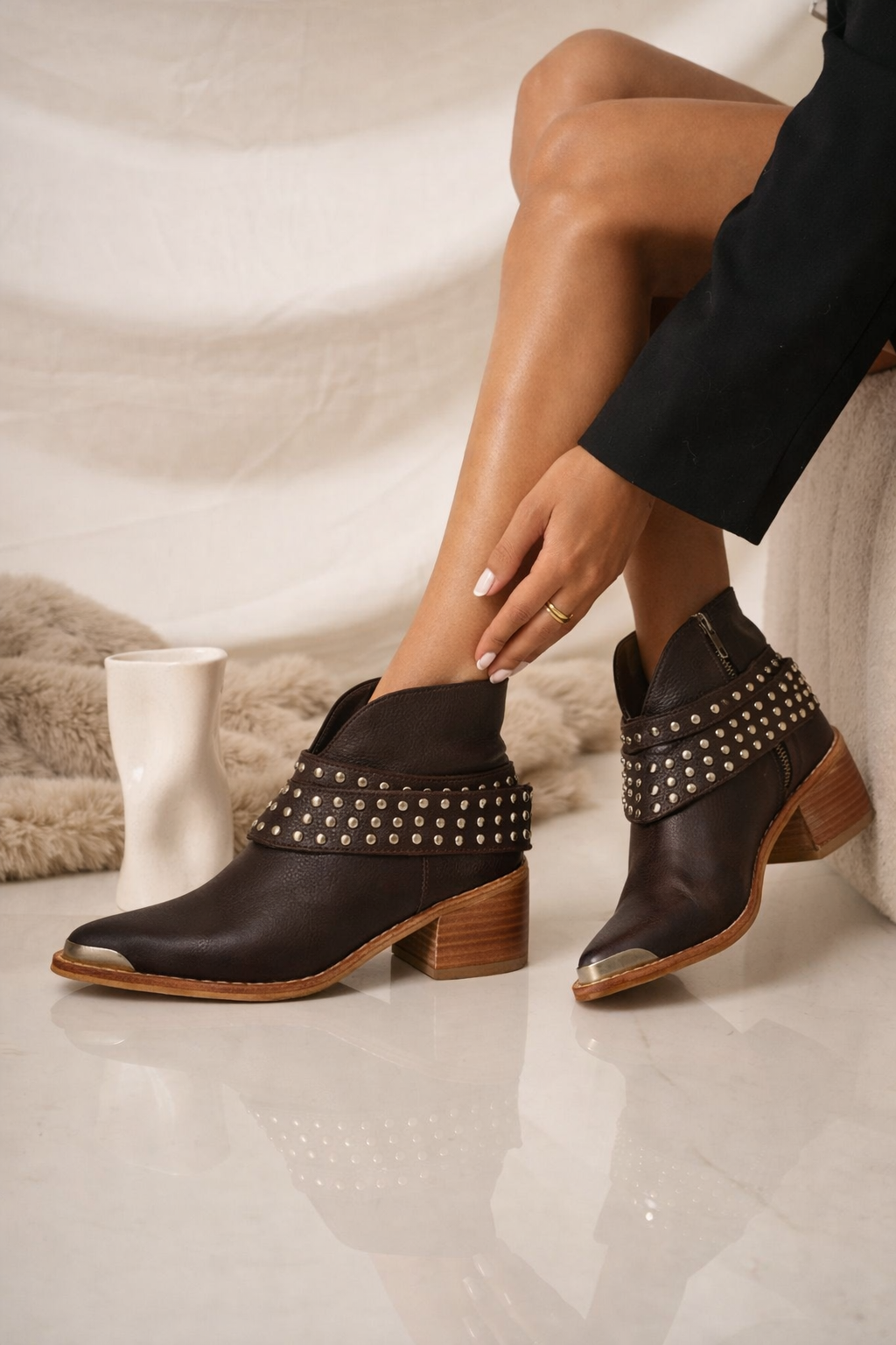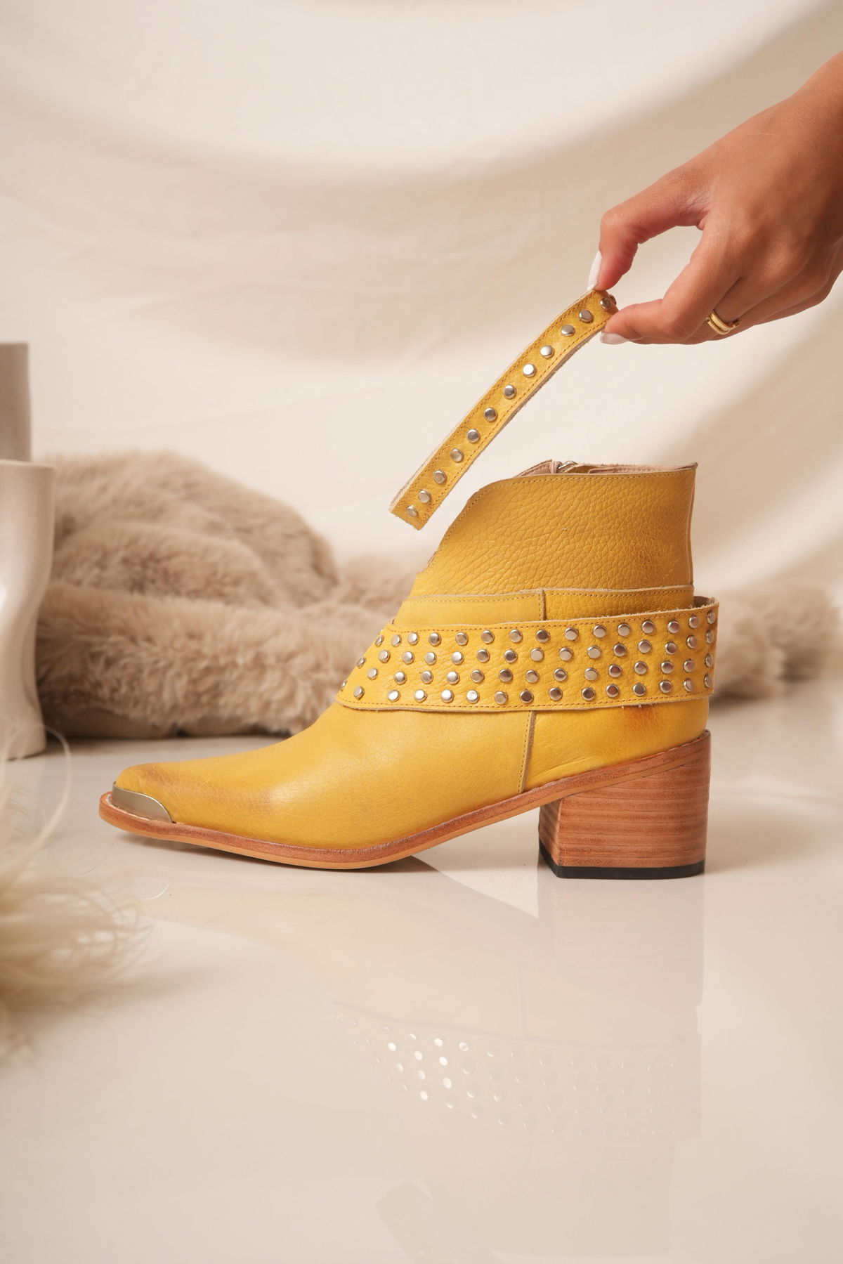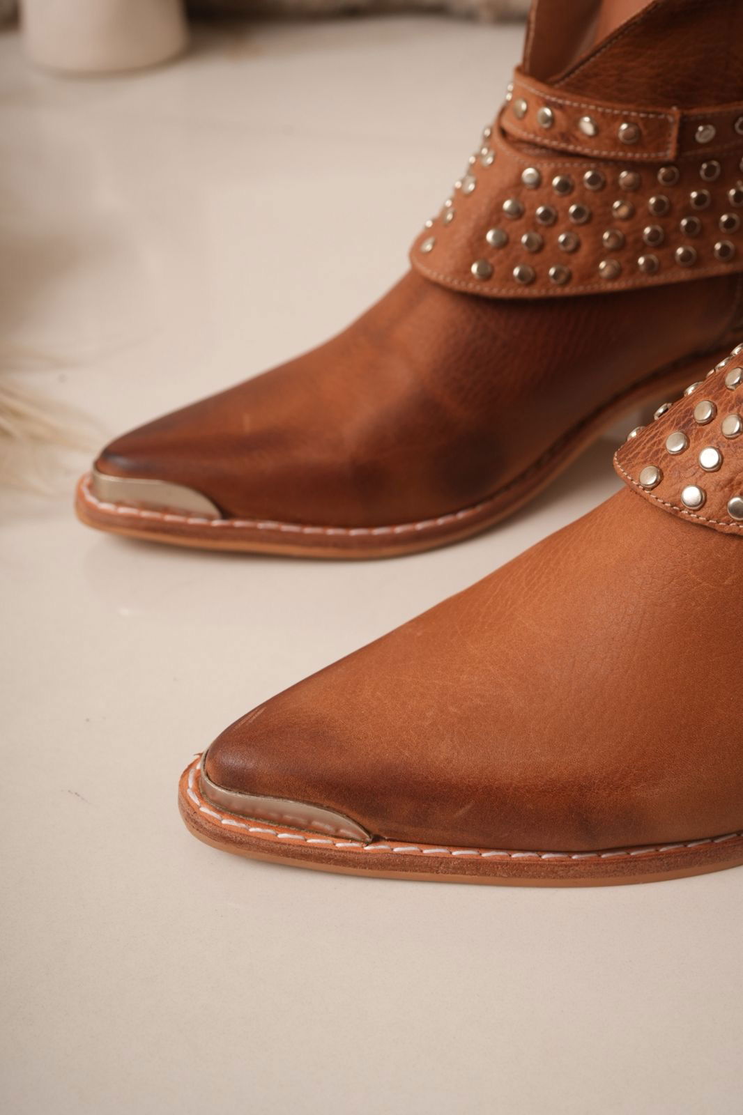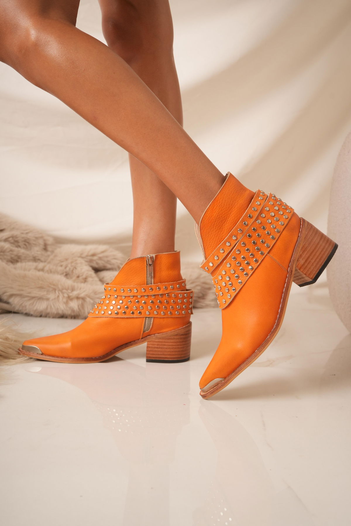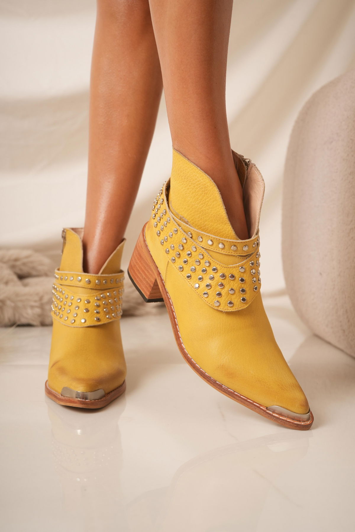 Botinetas confeccionadas en cuero, con diseño moderno y carácter urbano. Detalles de tachas metálicas y taco de madera de 7 cm aprox.