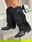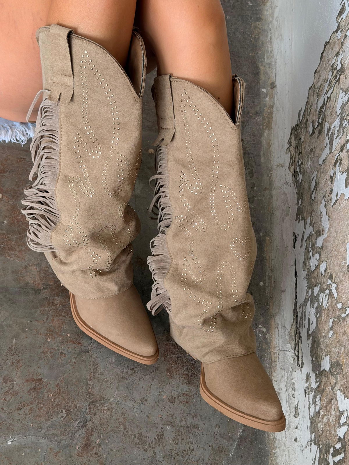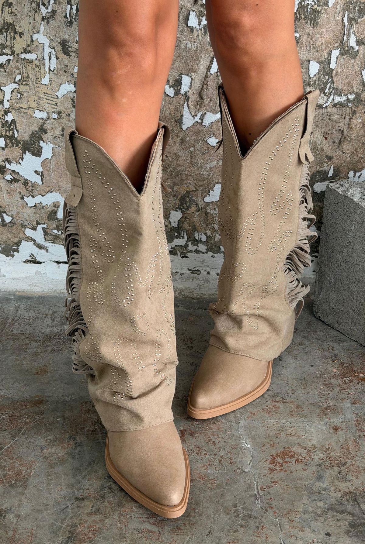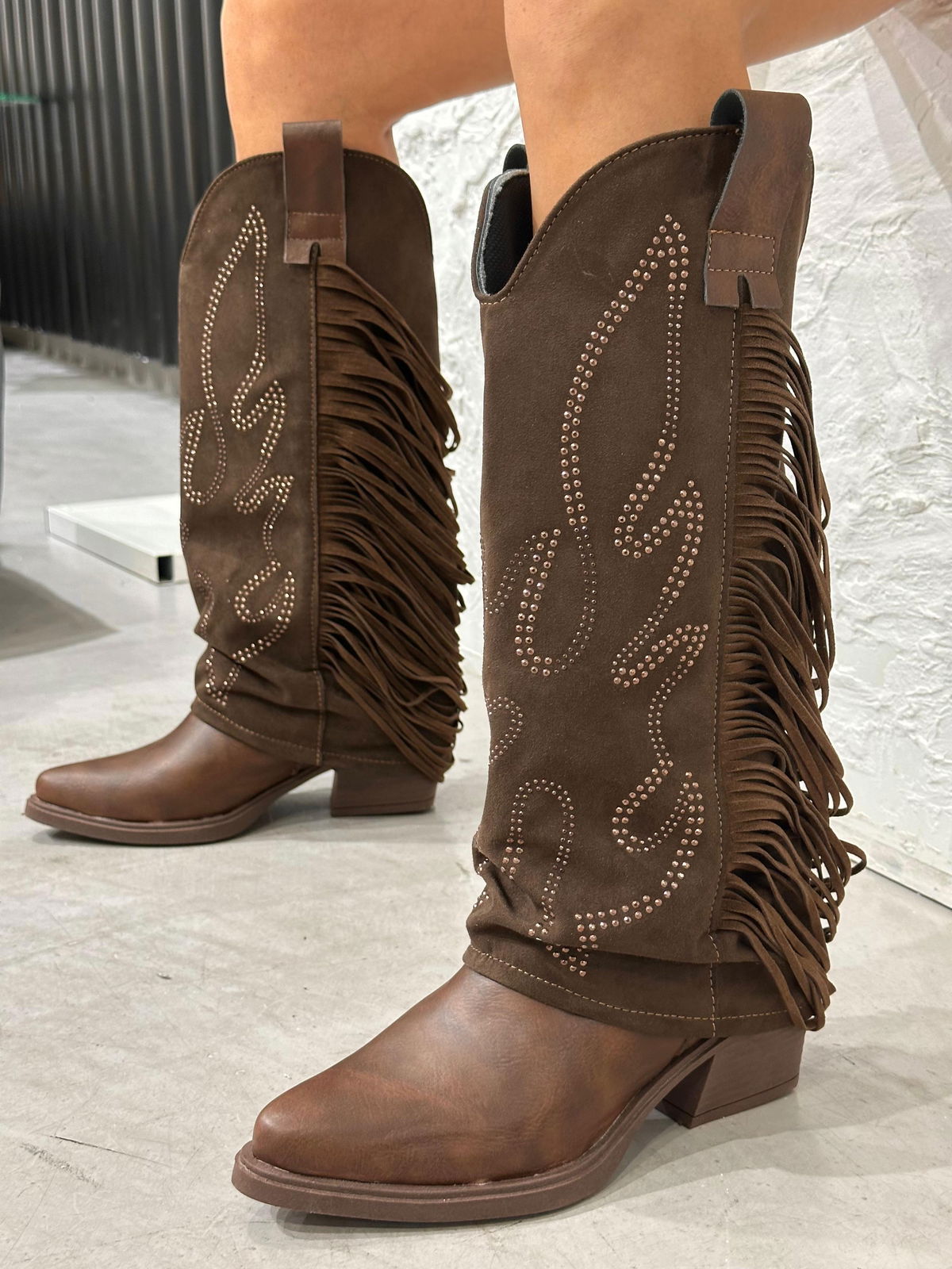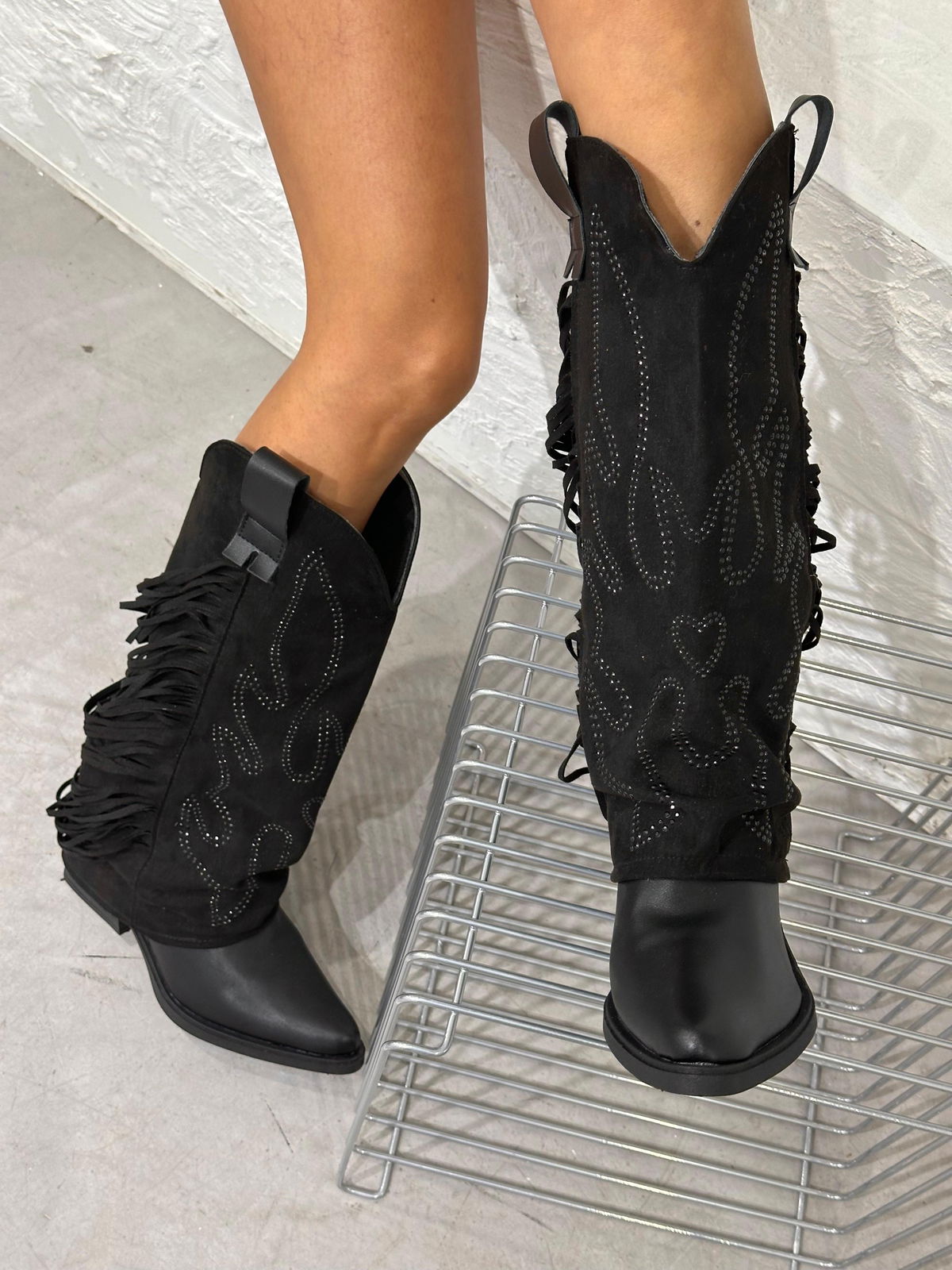 Botas de caña media con diseño western y flecos laterales que aportan movimiento y carácter. Presentan detalle de strass formando guardas en la caña, logrando un estilo protagonista ideal para elevar cualquier look. Cómodas, cancheras y con personalidad.