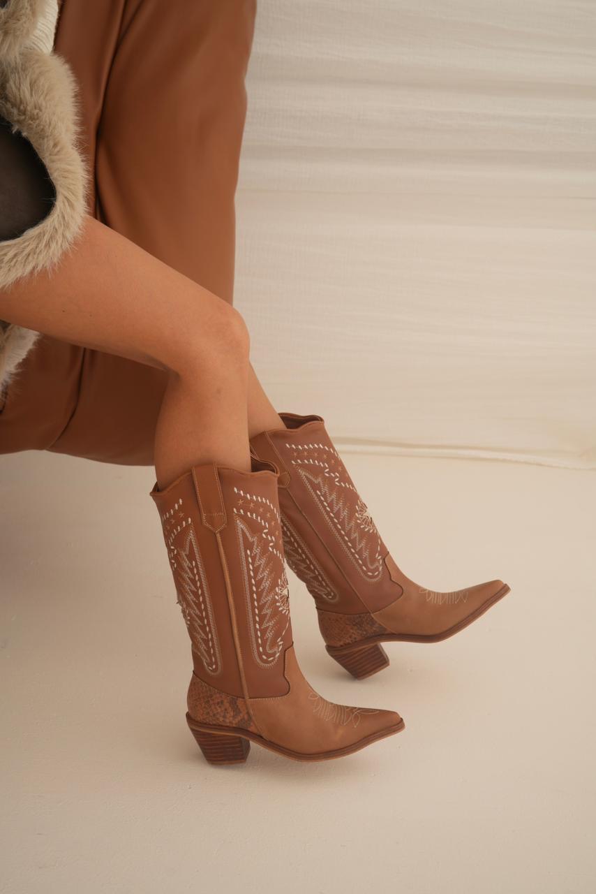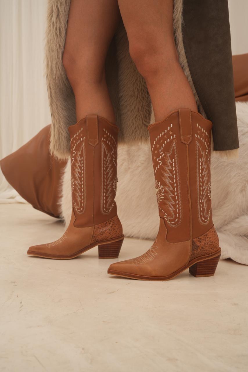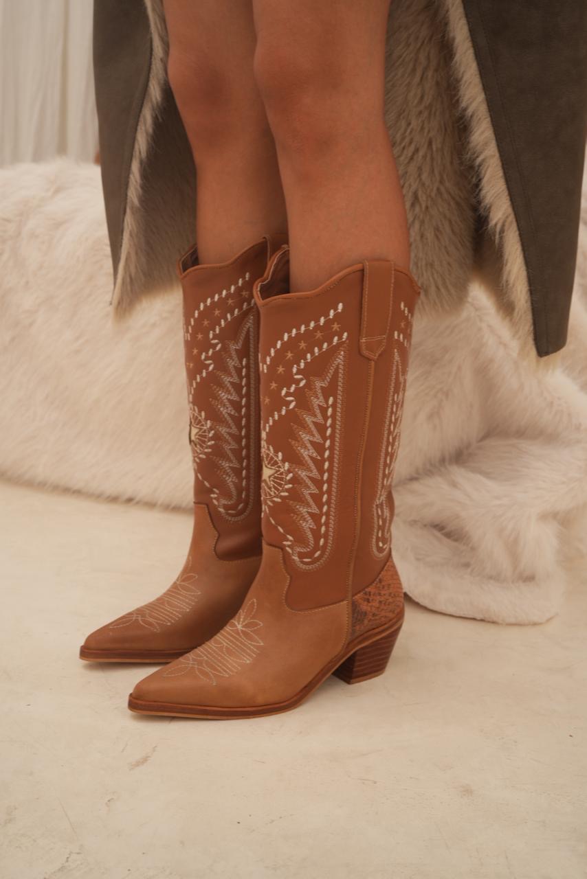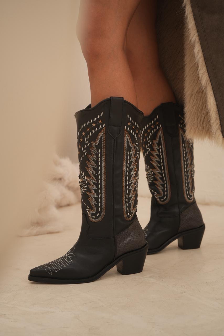 Bota caña alta estilo texana con impronta artesanal que la hace única. Sus bordados y detalles en cuero reptil elevan el diseño y le dan ese toque especial que transforma cualquier look. Un modelo con personalidad, cómodo y súper canchero para usar todo el día.