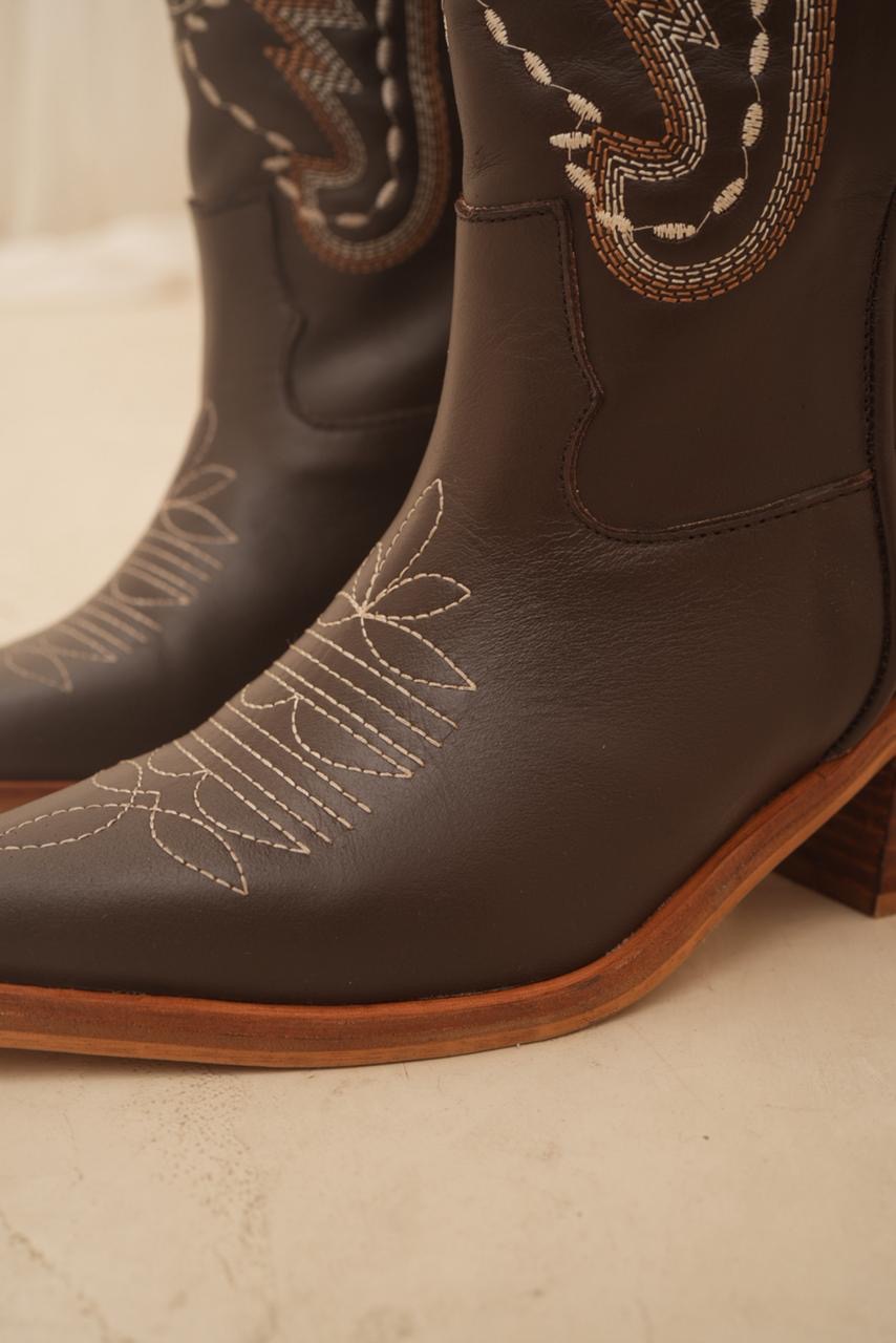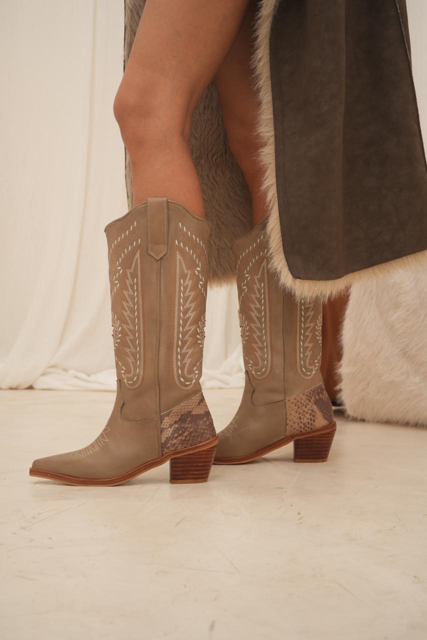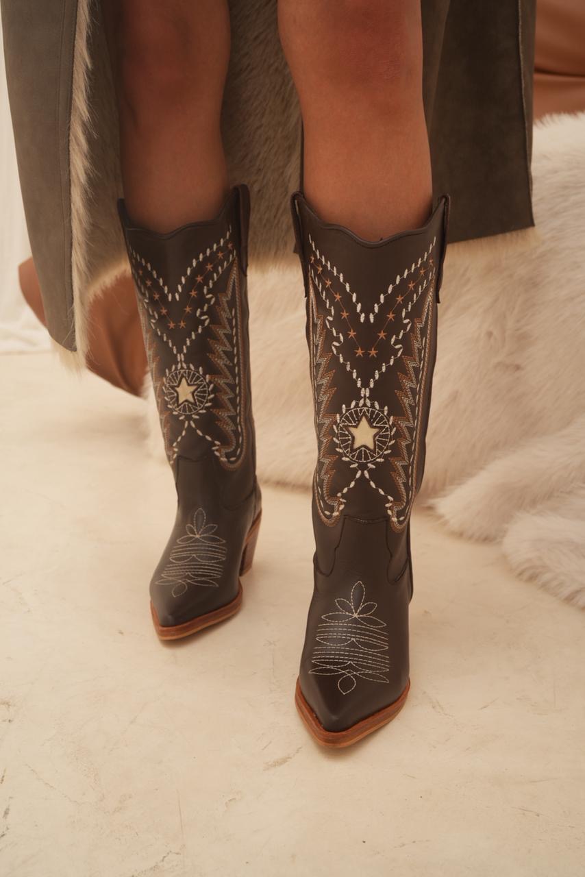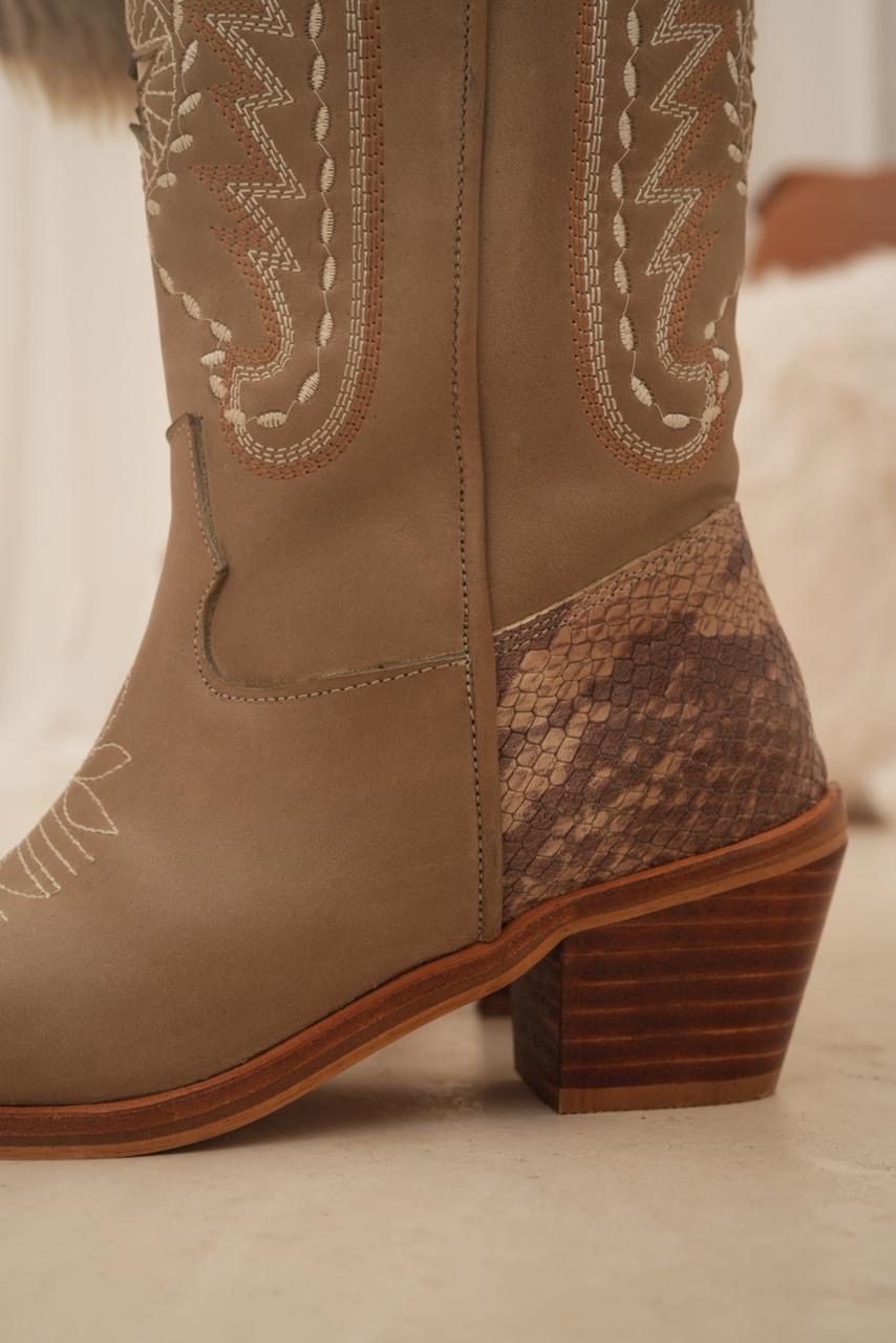 Bota caña alta estilo texana con impronta artesanal que la hace única. Sus bordados y detalles en cuero reptil elevan el diseño y le dan ese toque especial que transforma cualquier look. Un modelo con personalidad, cómodo y súper canchero para usar todo el día.