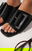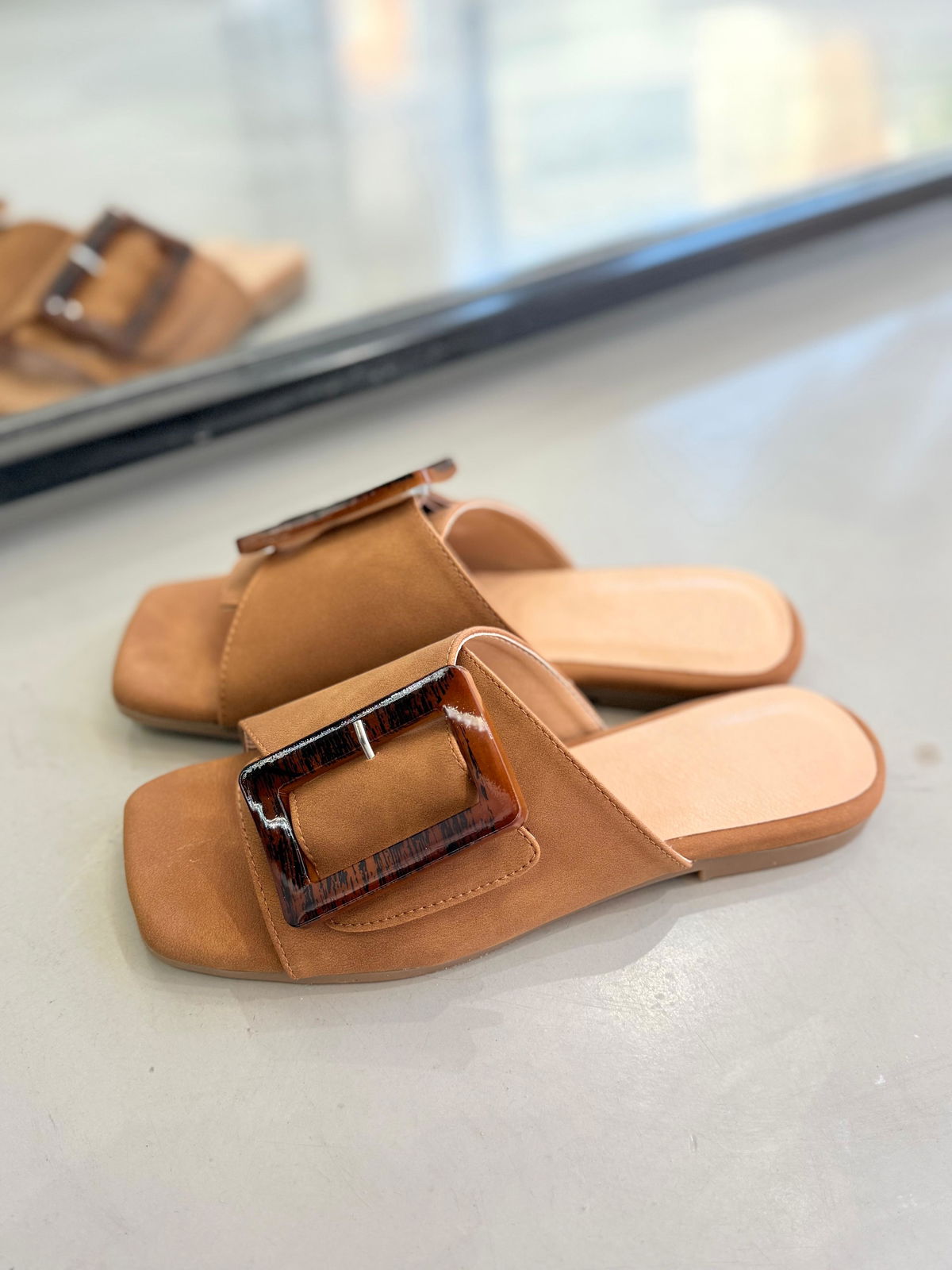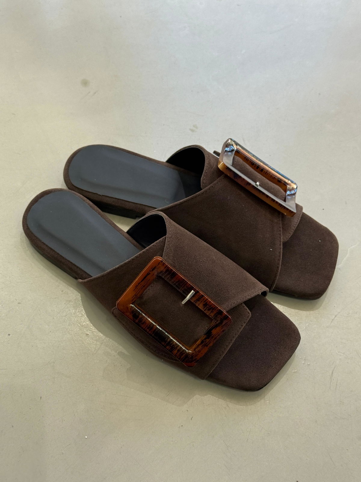 Sandalias confeccionadas en gamuza, de diseño moderno y carácter protagonista. Presentan capellada amplia que aporta sujeción y confort, combinada con una hebilla de gran tamaño que suma un detalle distintivo y elegante. La base baja y la silueta minimalista las convierten en una opción versátil, ideal para looks urbanos, relajados o más sofisticados.