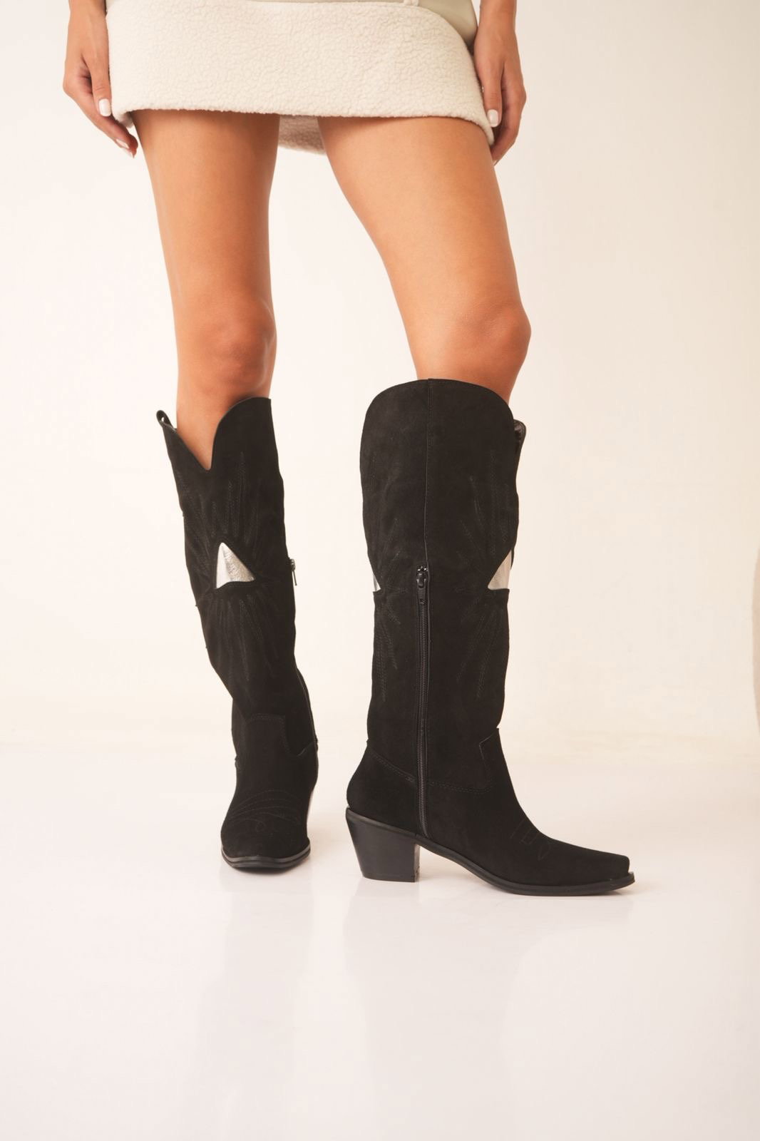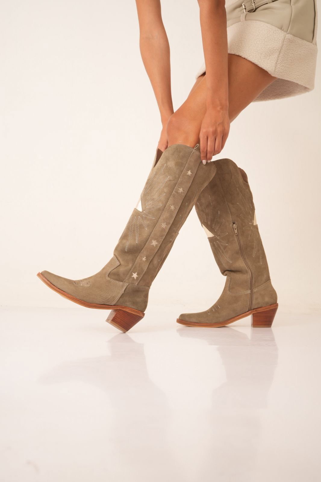 Bota caña alta de gamuza con impronta western y detalles que la hacen única. Su diseño con estrellas bordadas le aporta un toque distintivo y original, mientras que el taco medio brinda altura y comodidad para el uso diario. Un modelo protagonista que eleva cualquier look.