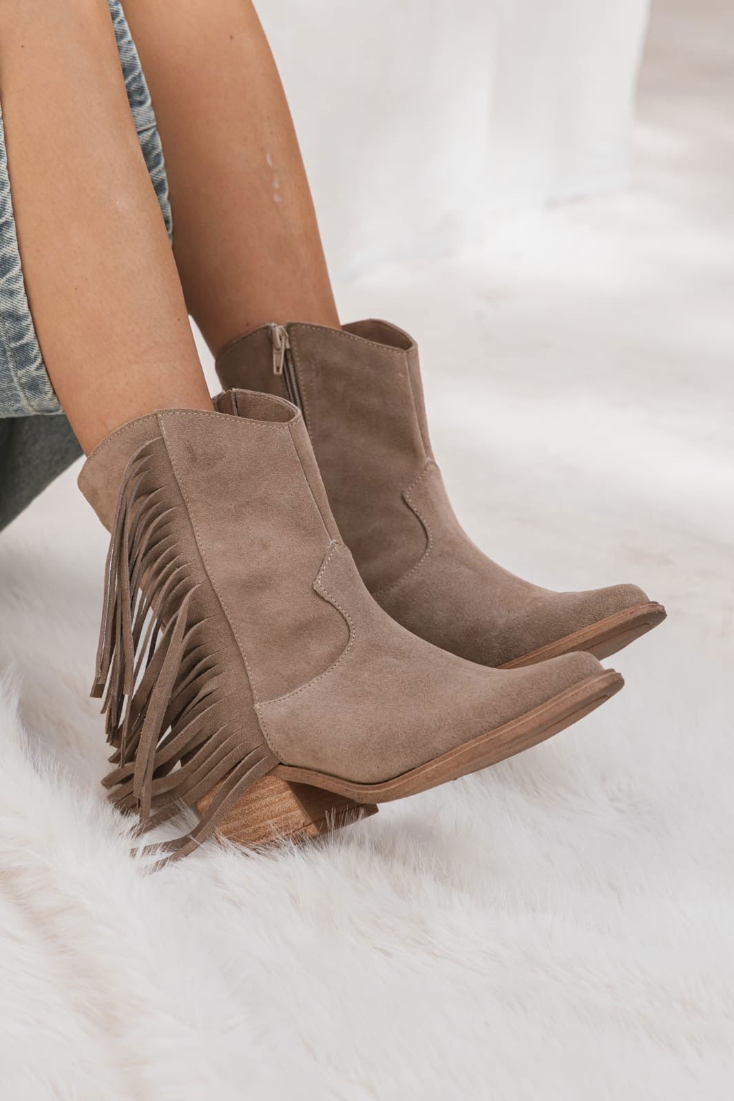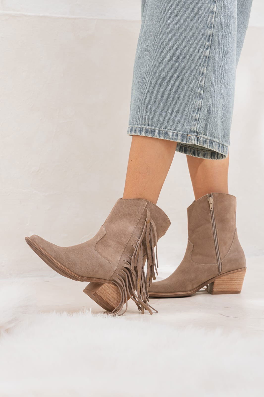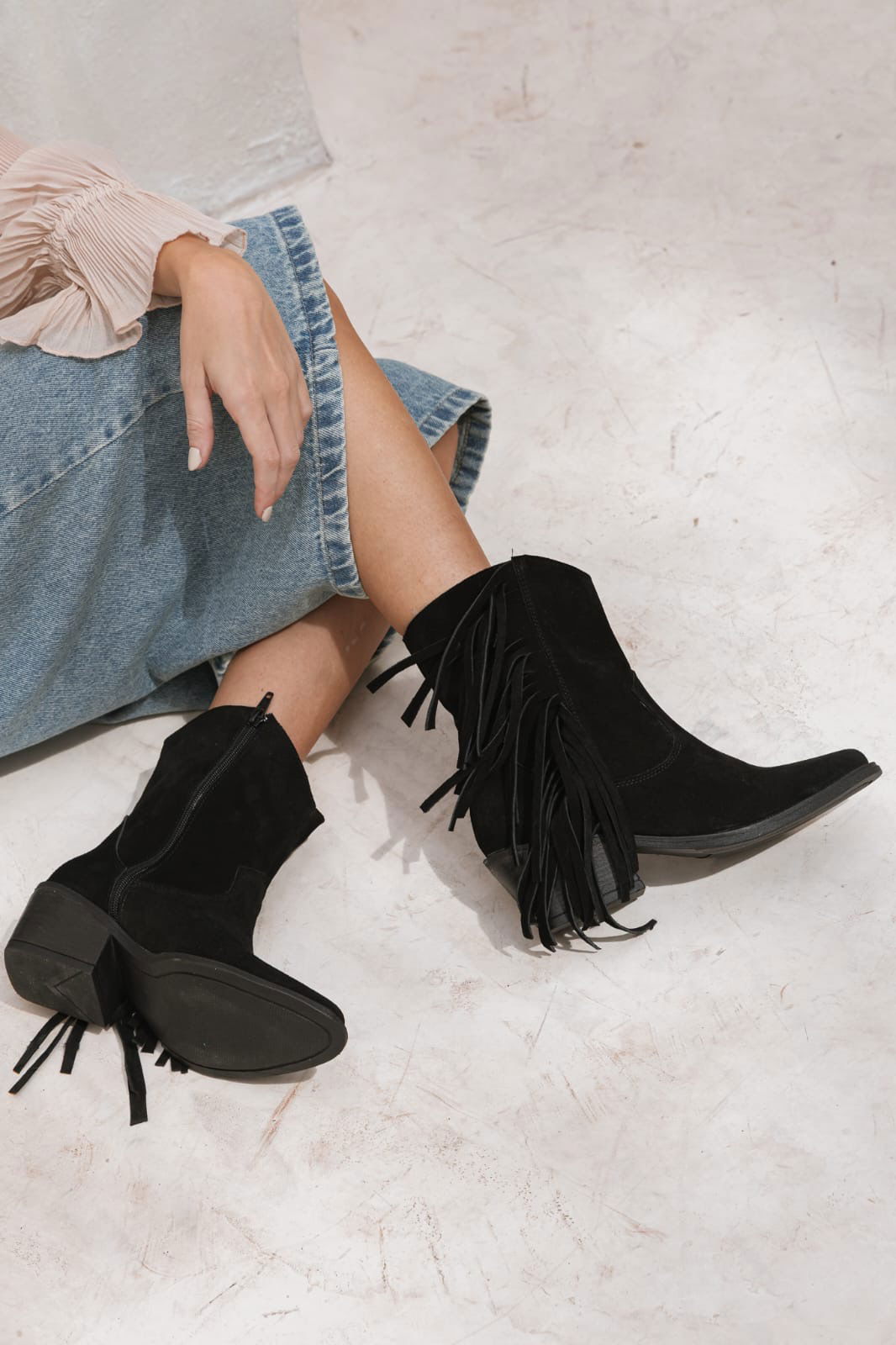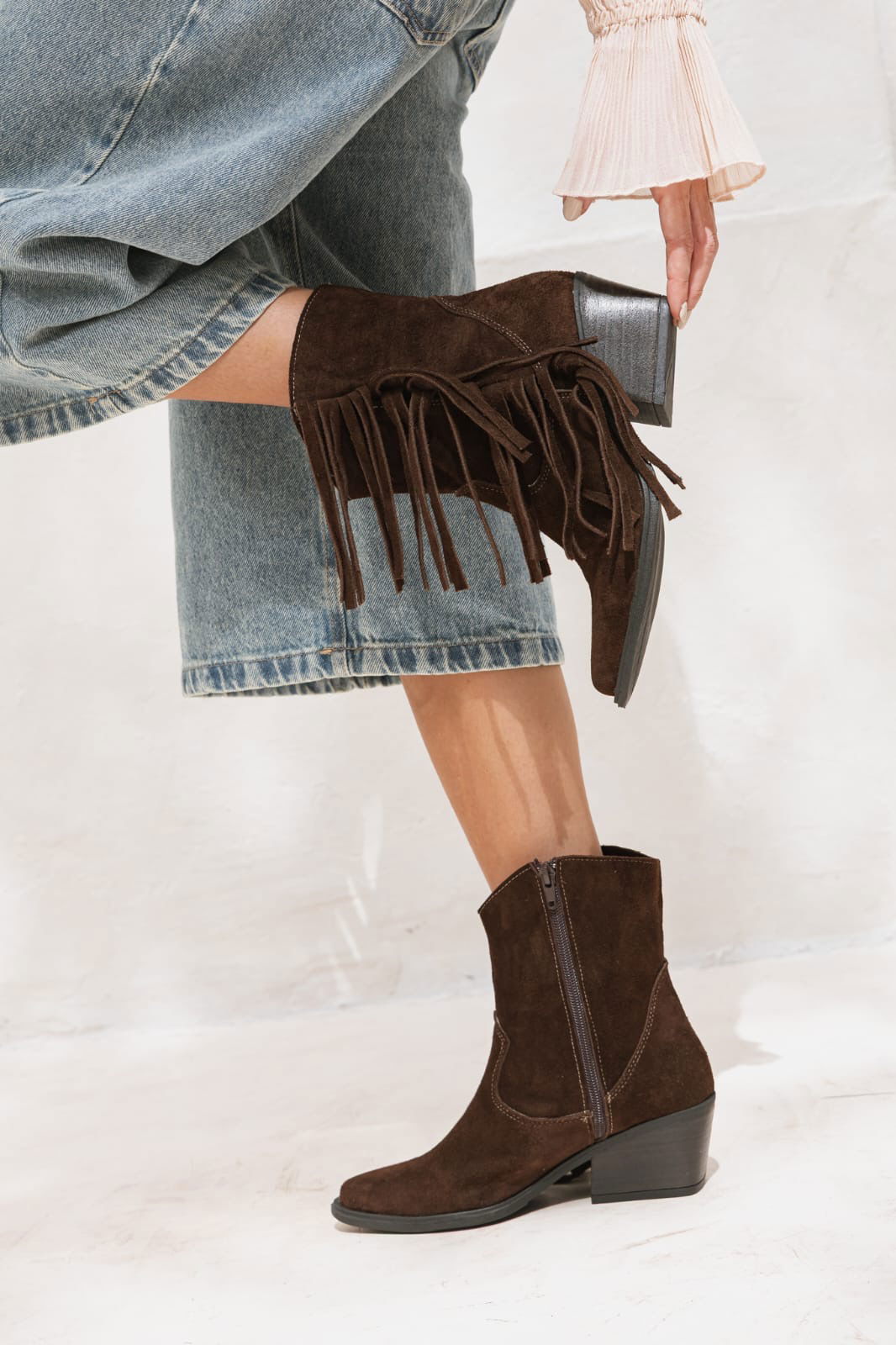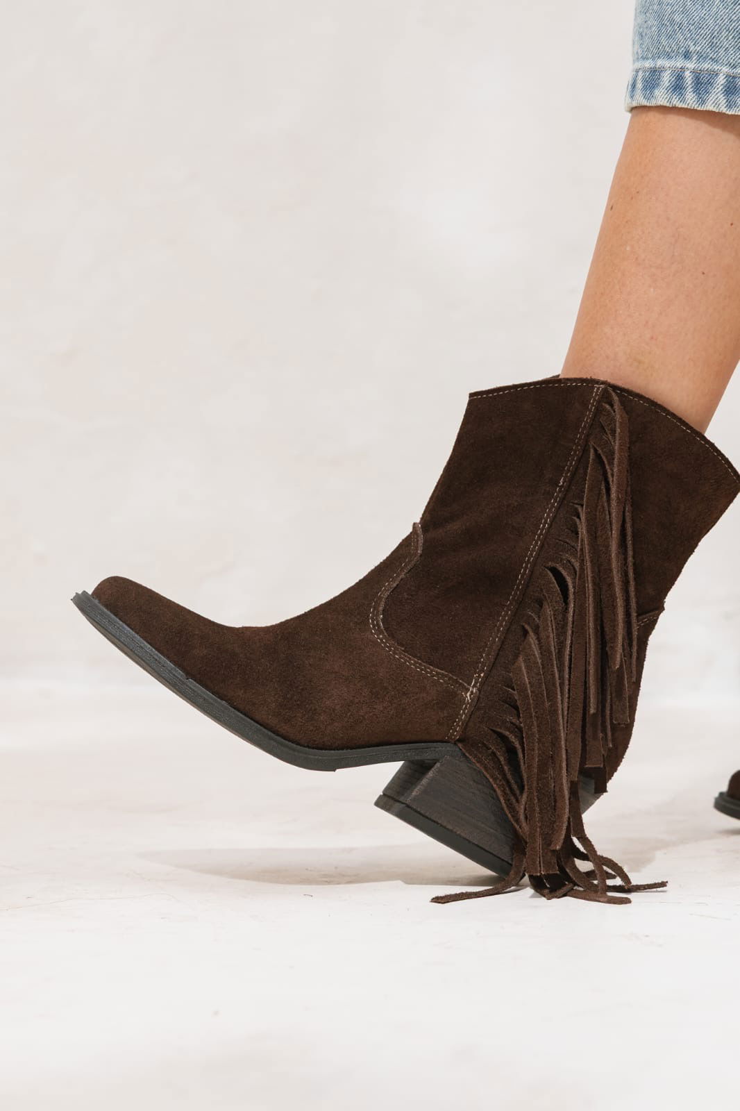 Botineta estilo texana con flecos que suman movimiento y un toque boho canchero. Un modelo versátil que levanta cualquier outfit y acompaña perfecto del día a la noche.