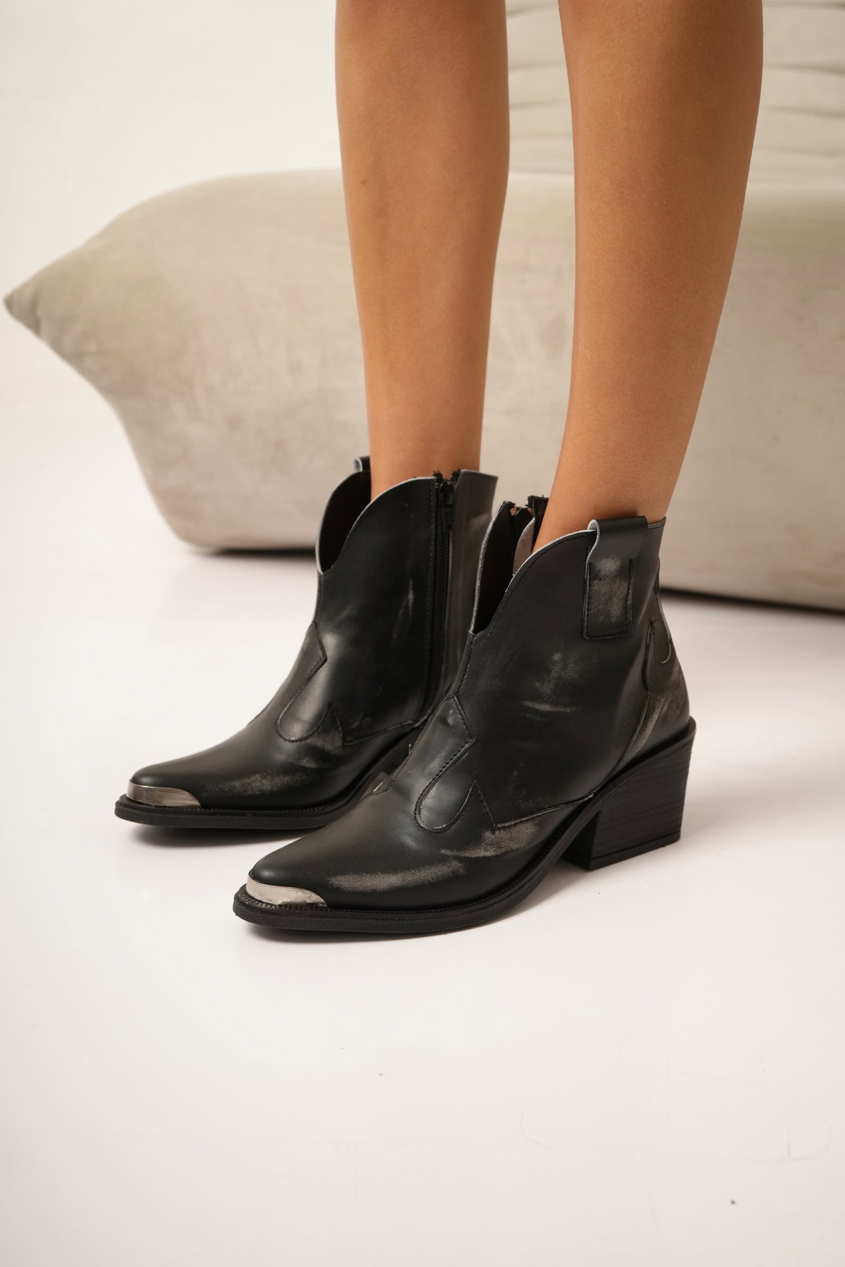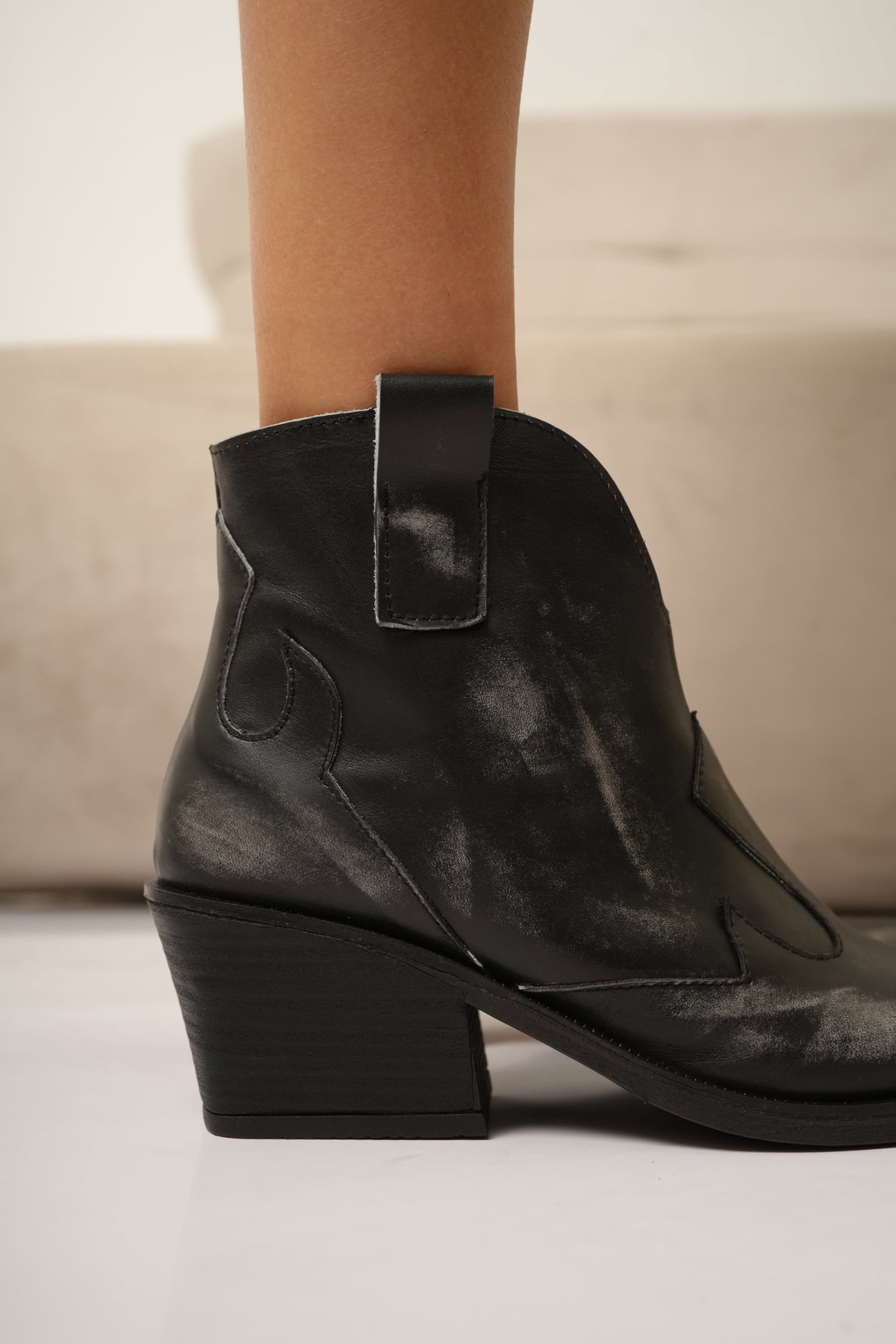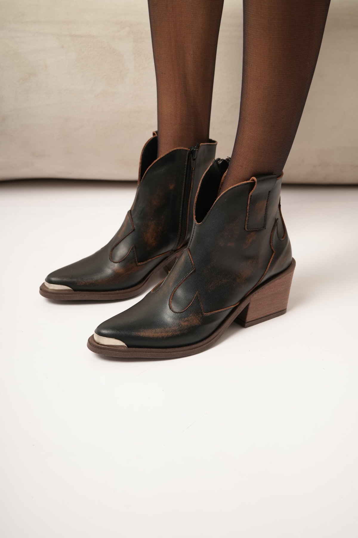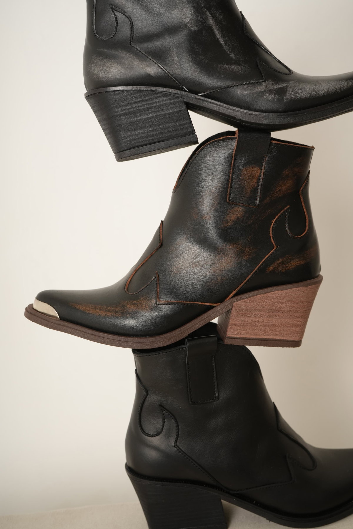 Bota texana corta de cuero con efecto gastado que le da ese aire canchero y auténtico. La punta con detalle metálico suma personalidad, mientras que el taco medio aporta altura y comodidad para el día a día. Un clásico renovado que levanta cualquier look.