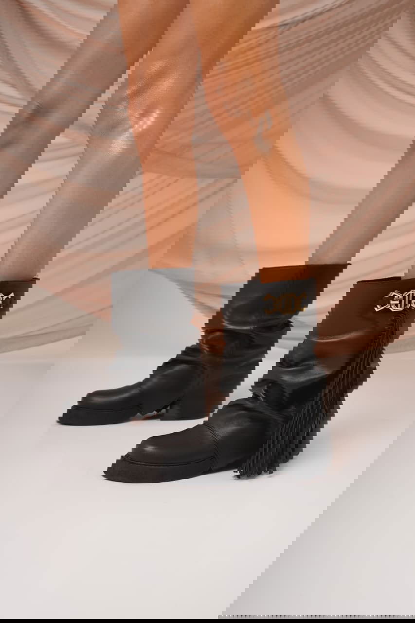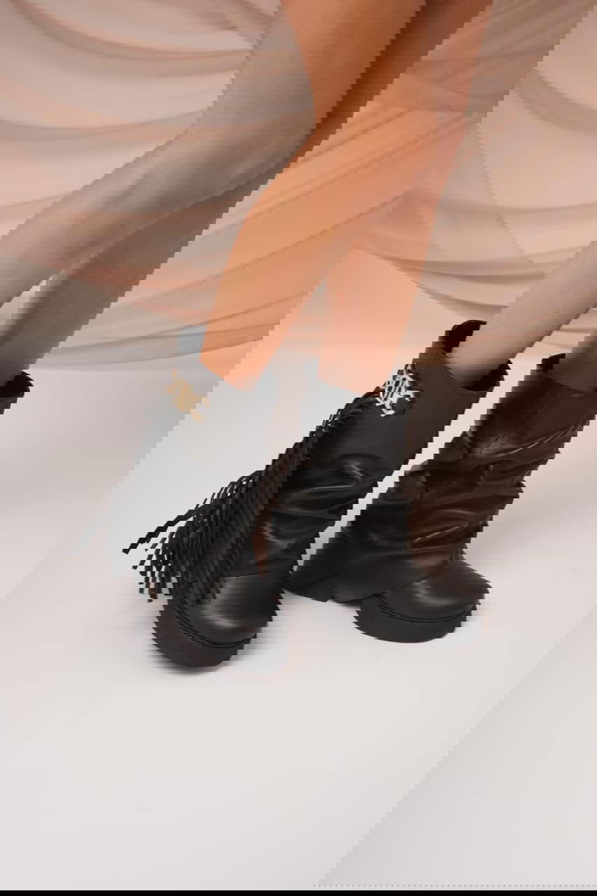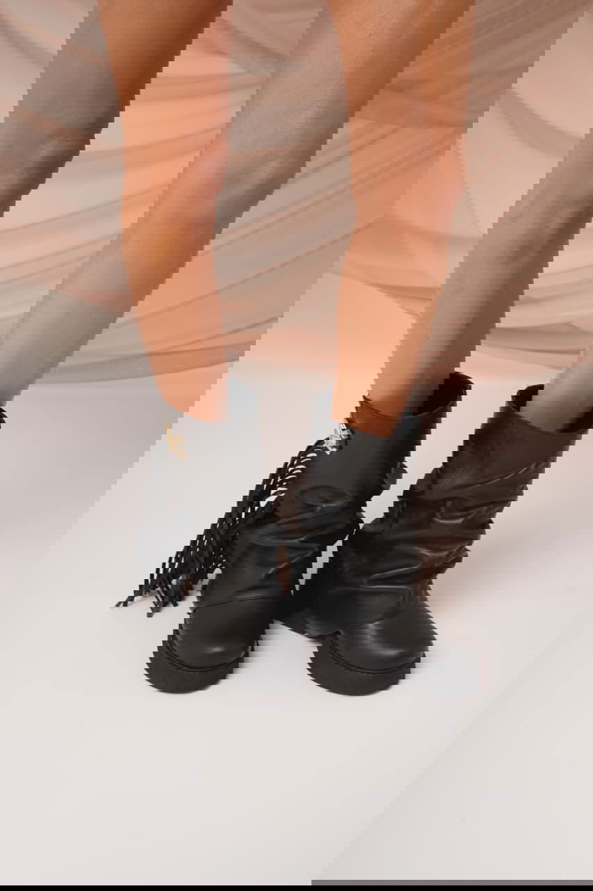 Botas de caña media con diseño fruncido y estilo western. Incorporan flecos laterales y aplique metálico decorativo que suma personalidad. Cómodas, cancheras y versátiles, ideales para elevar cualquier look urbano o boho.