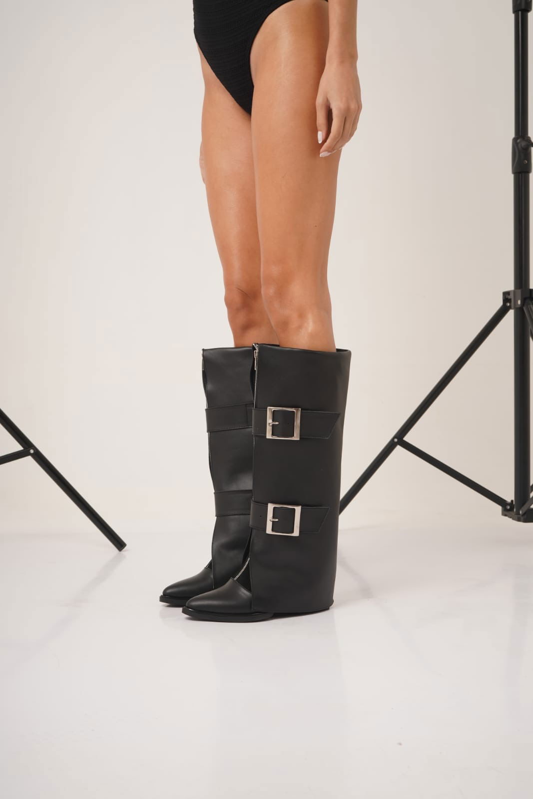 Botas caña alta de 37 cm con detalles de hebillas metálicas regulables que aportan carácter y estilo. De diseño moderno y canchero, con punta redondeada suave y calce cómodo, ideales para sumar personalidad a looks urbanos y versátiles, tanto de día como de noche.
