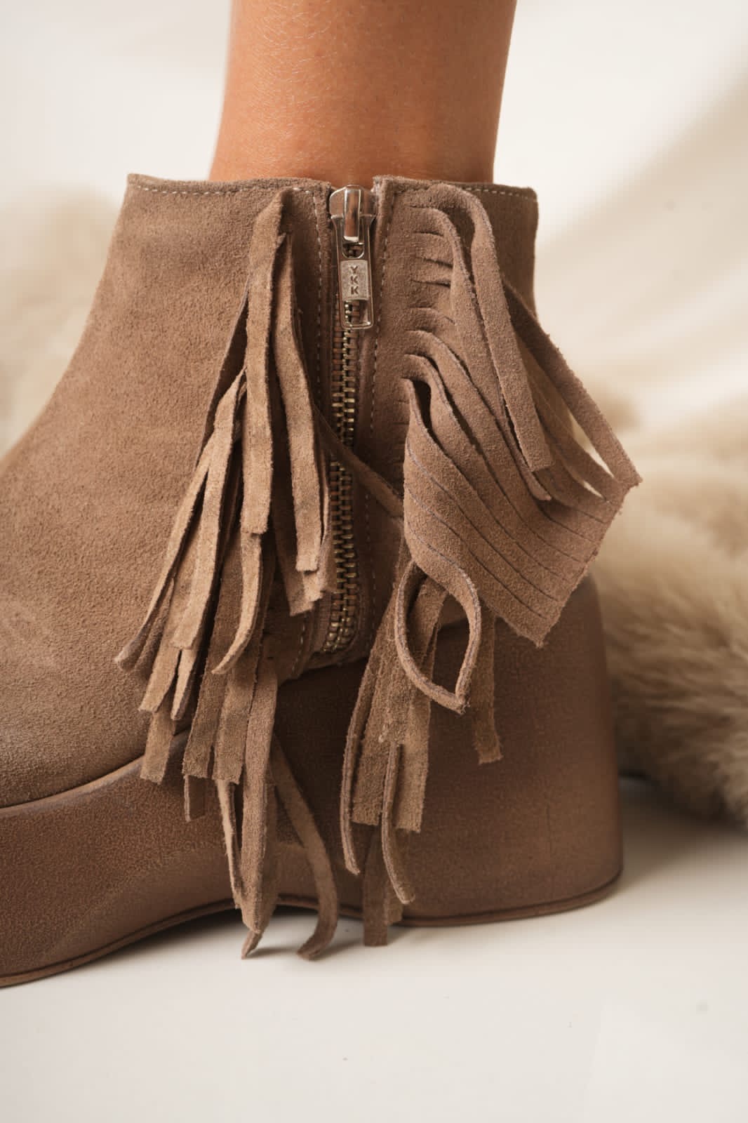 Botas de diseño bohemio confeccionadas en gamuzón de alta calidad, ideales para quienes buscan un calzado con movimiento y altura. Se destacan por sus flecos laterales largos y un cierre metálico funcional que facilita el calce, montadas sobre una plataforma entera y robusta que garantiza comodidad durante todo el día. Su estructura minimalista en la punta equilibra perfectamente el detalle de los flecos, creando una pieza versátil para looks de día o noche.