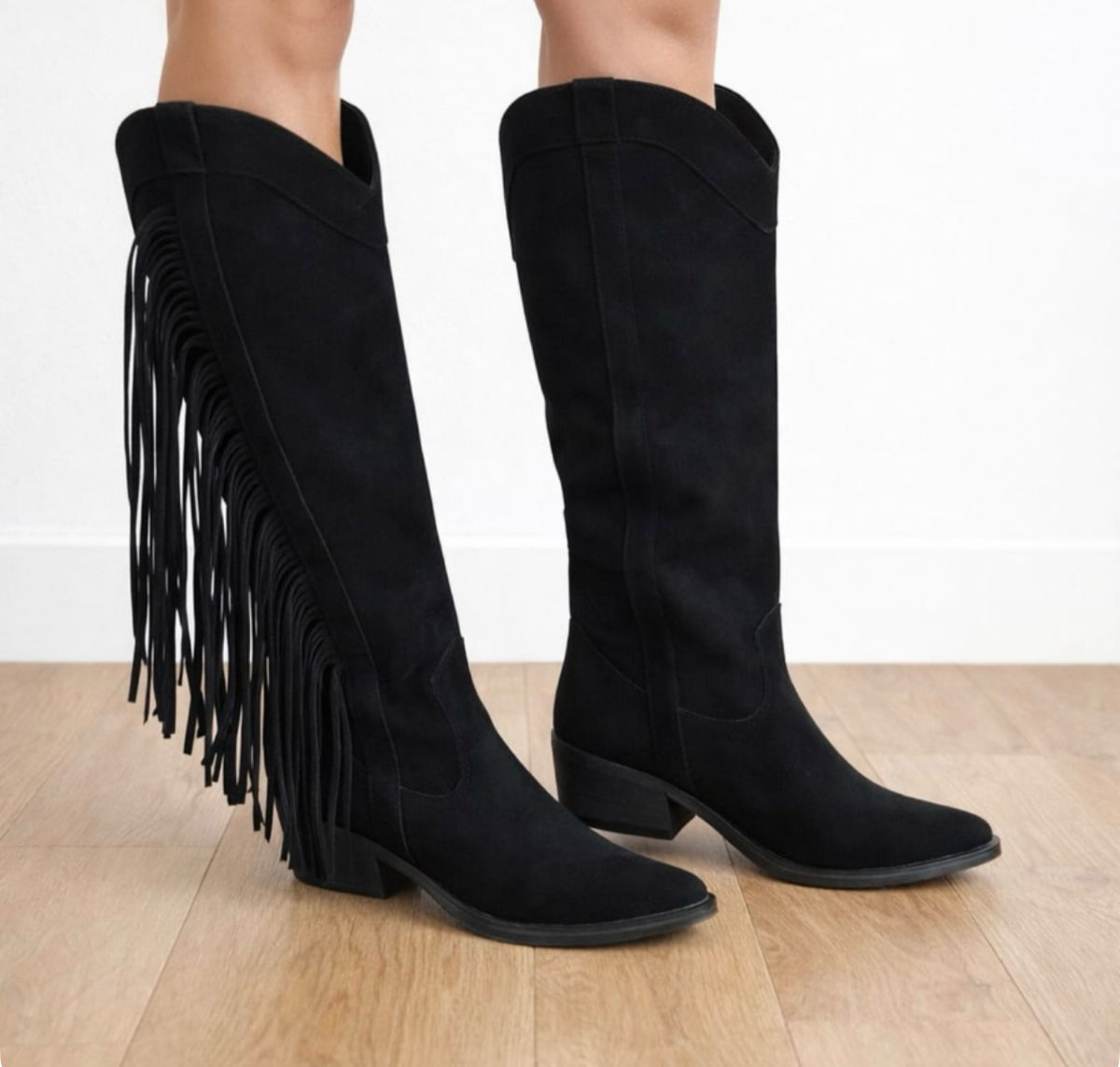 Botas confeccionadas con detalles de flecos laterales. Taco ancho de 5 cm aprox