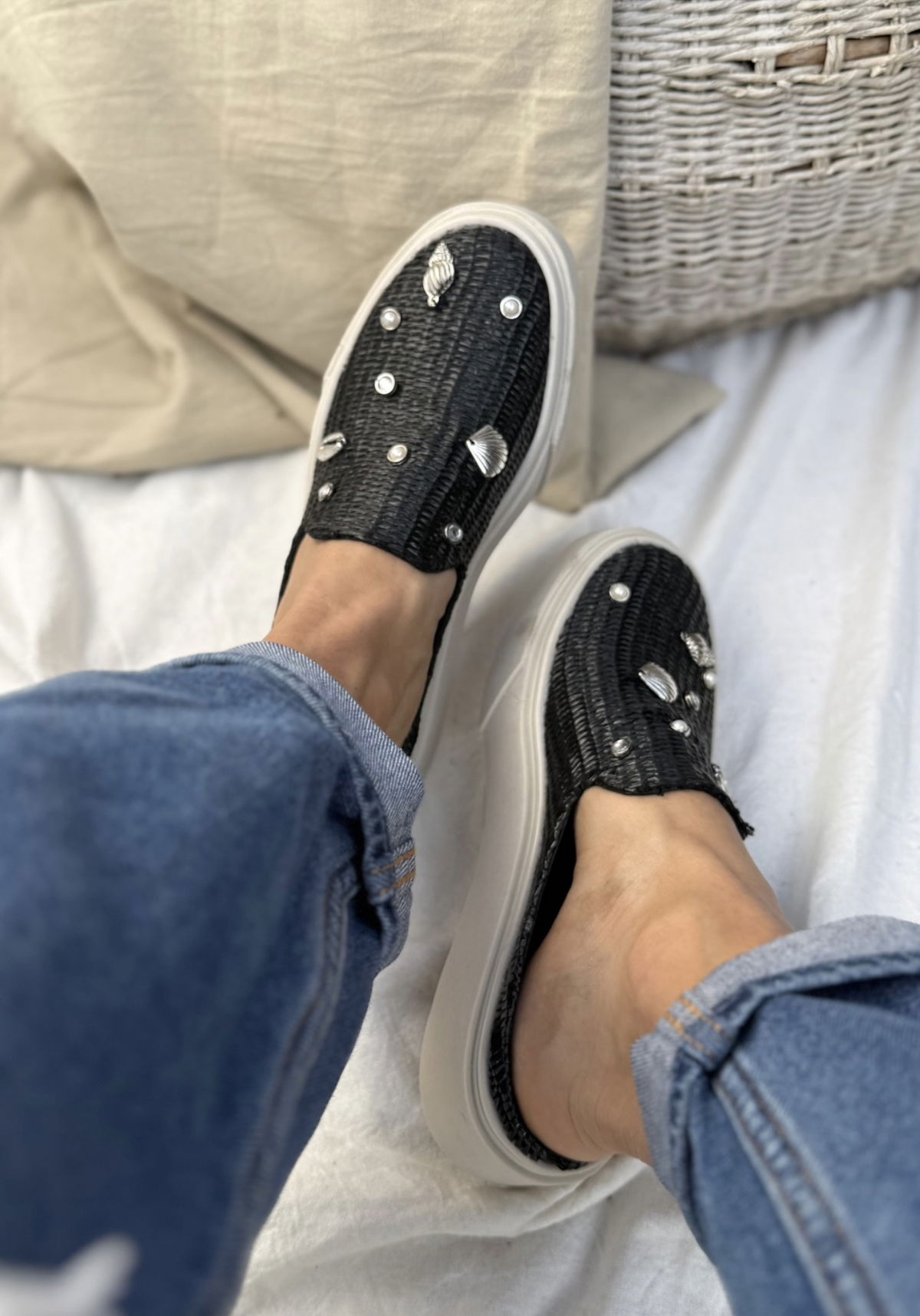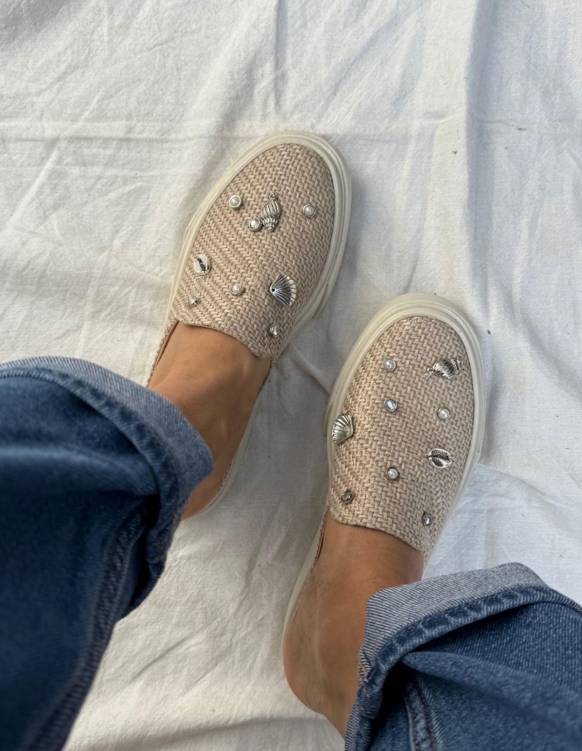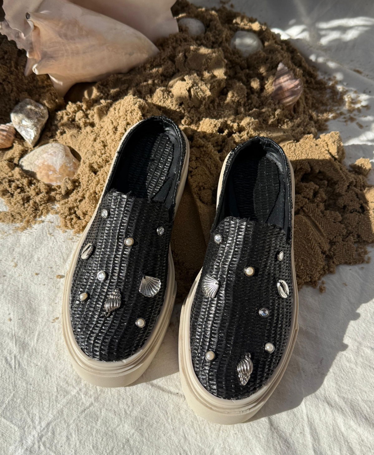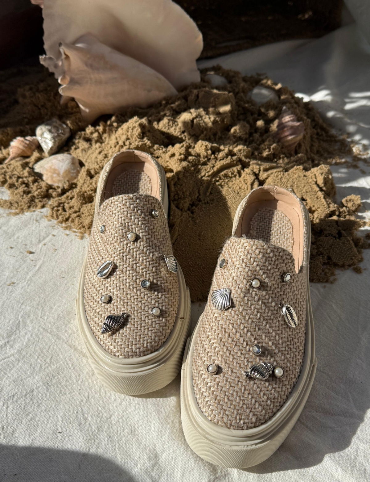 Zuecos tejidos con detalle de caracoles, perlas y strass. Livianas, frescas y con ese toque playero que levanta cualquier look. Base Tr.