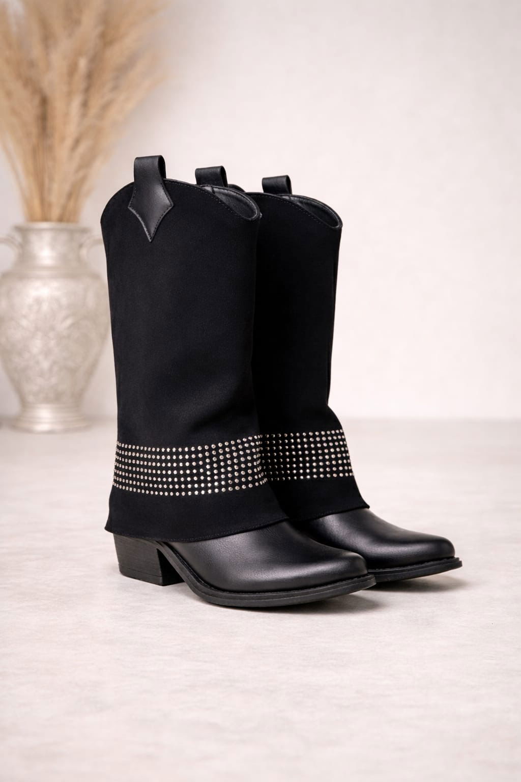 Botas con caña efecto pollera y detalle en strass. Taco aprox 5 cm