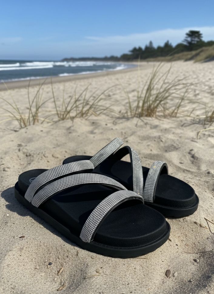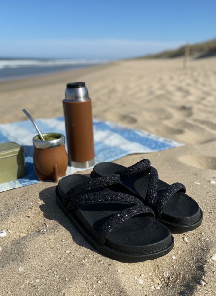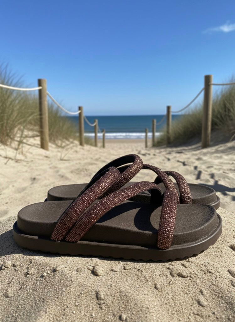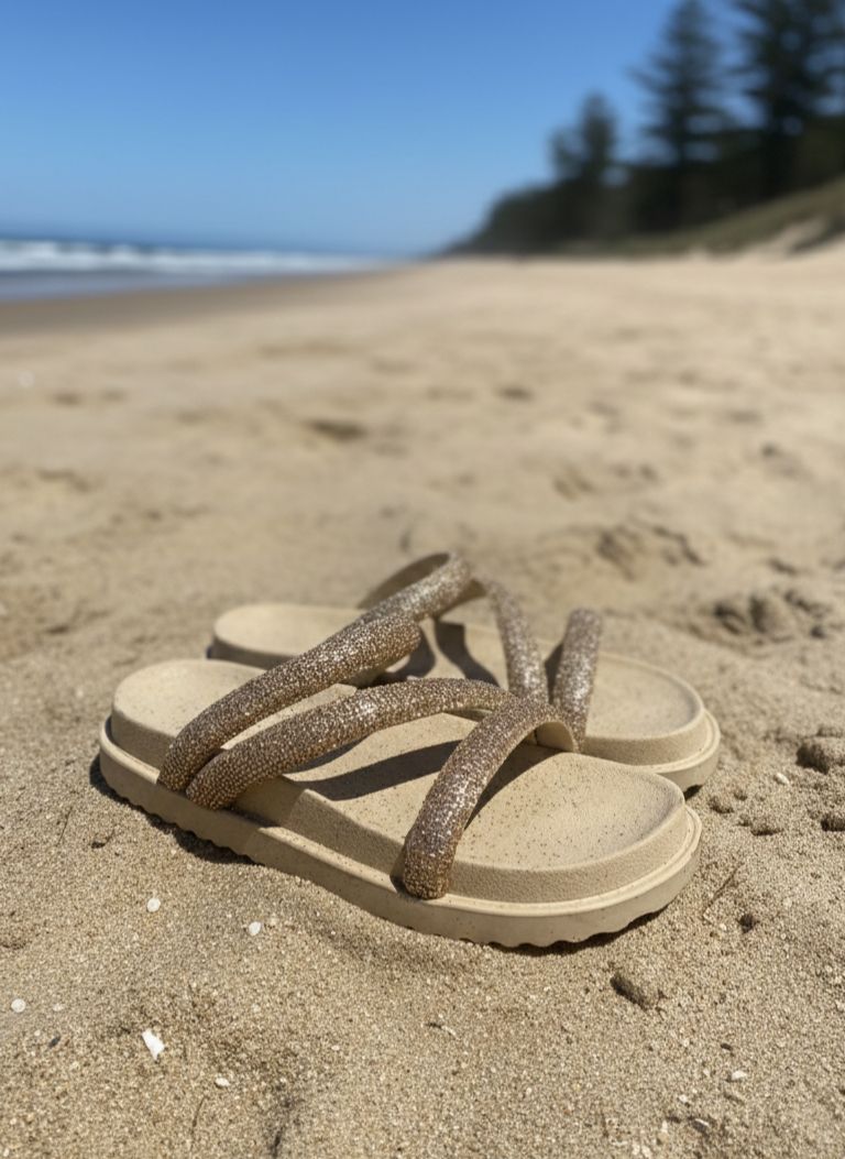 Sandalia con triple tira glitter súper flexible, liviana y cómoda.
