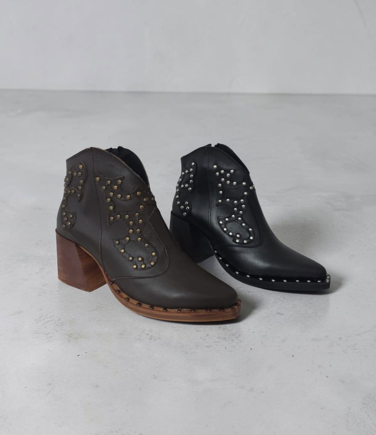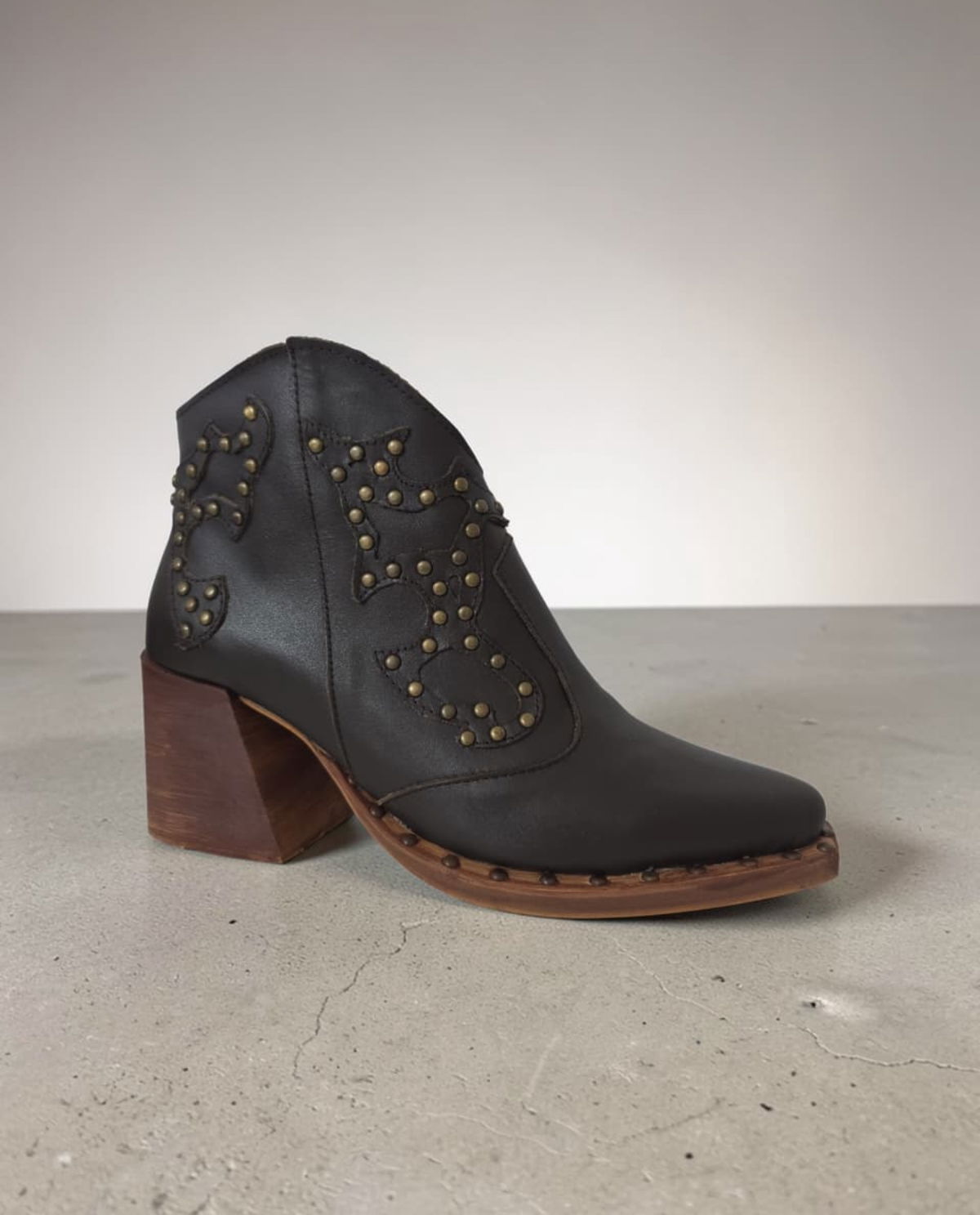 Botas con detalle en tachas y taco de madera Taco ancho que aporta mayor comodidad y estabilidad.
