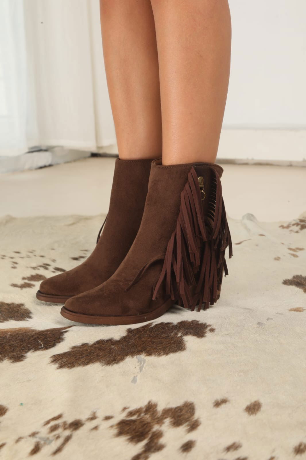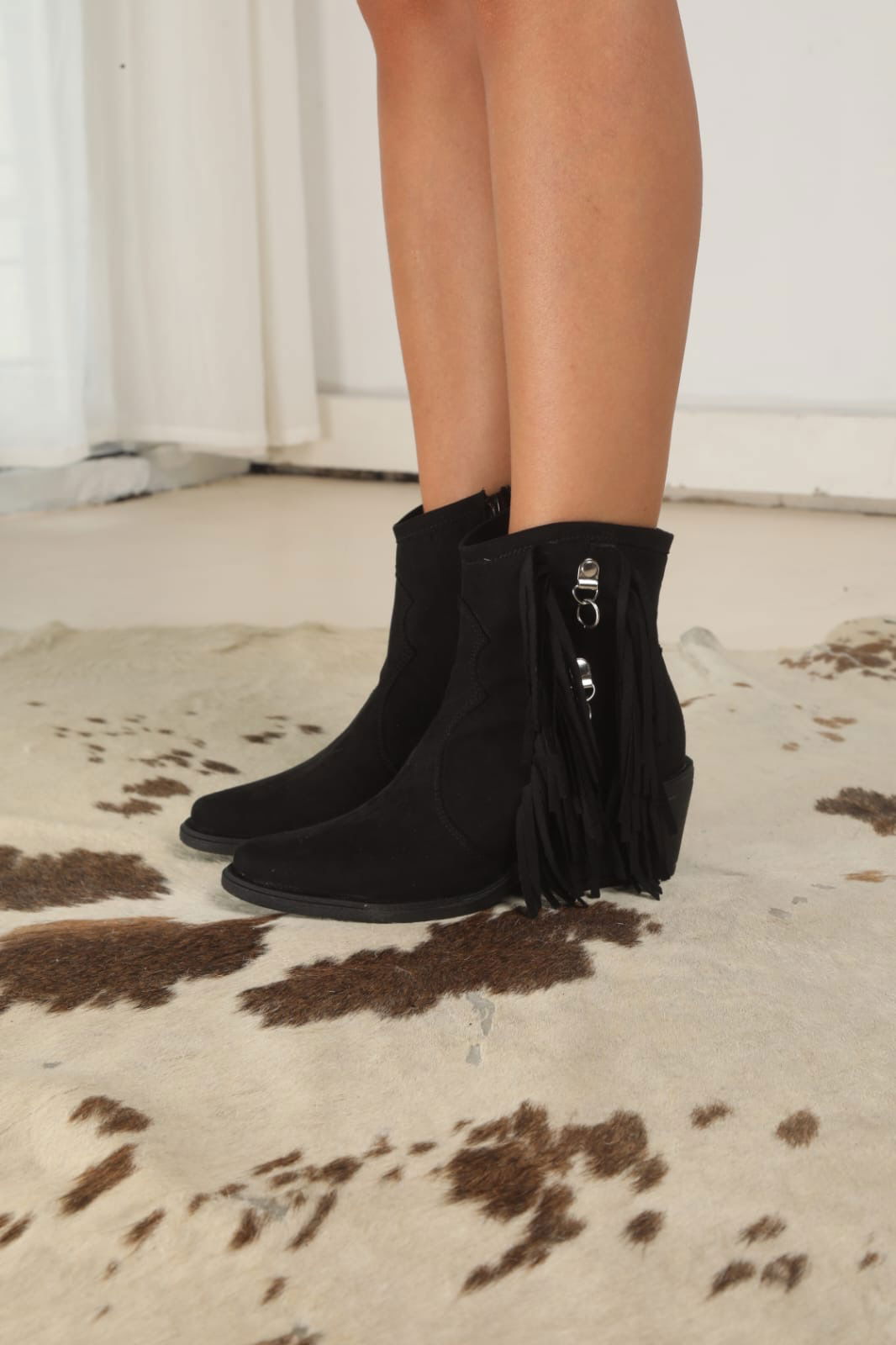Bota de caña corta con inspiración western, que combina un diseño clásico con detalles que marcan la diferencia. Presenta cierre lateral para un mejor calce, taco ancho que aporta comodidad y estabilidad, y un aplique lateral con flecos y herrajes metálicos que suman movimiento y personalidad al modelo.