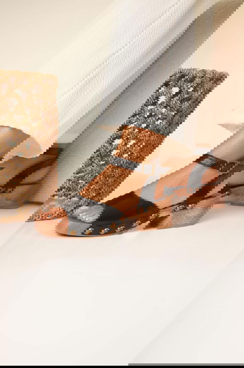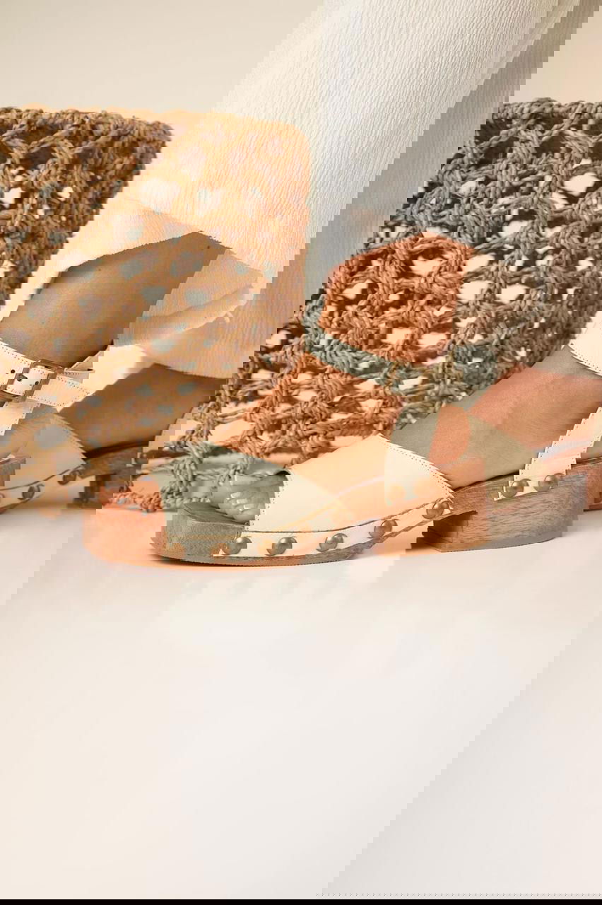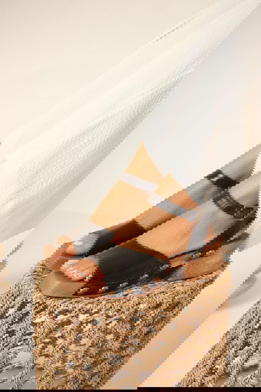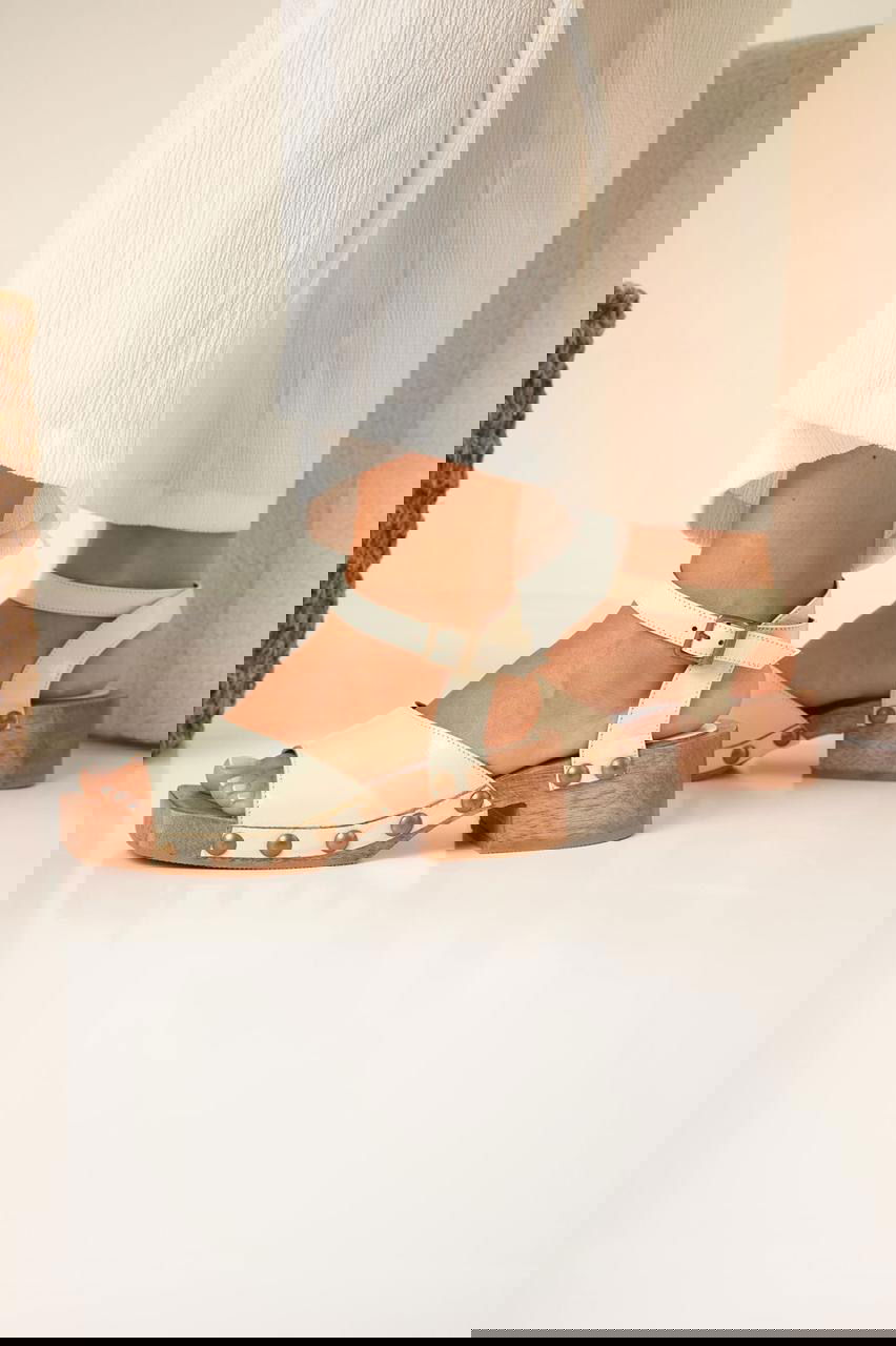 Sandalias de plataforma baja con base de madera y capellada ancha. Detalle de tachas metálicas que le aportan un estilo rústico, canchero y súper combinable para todos los días.