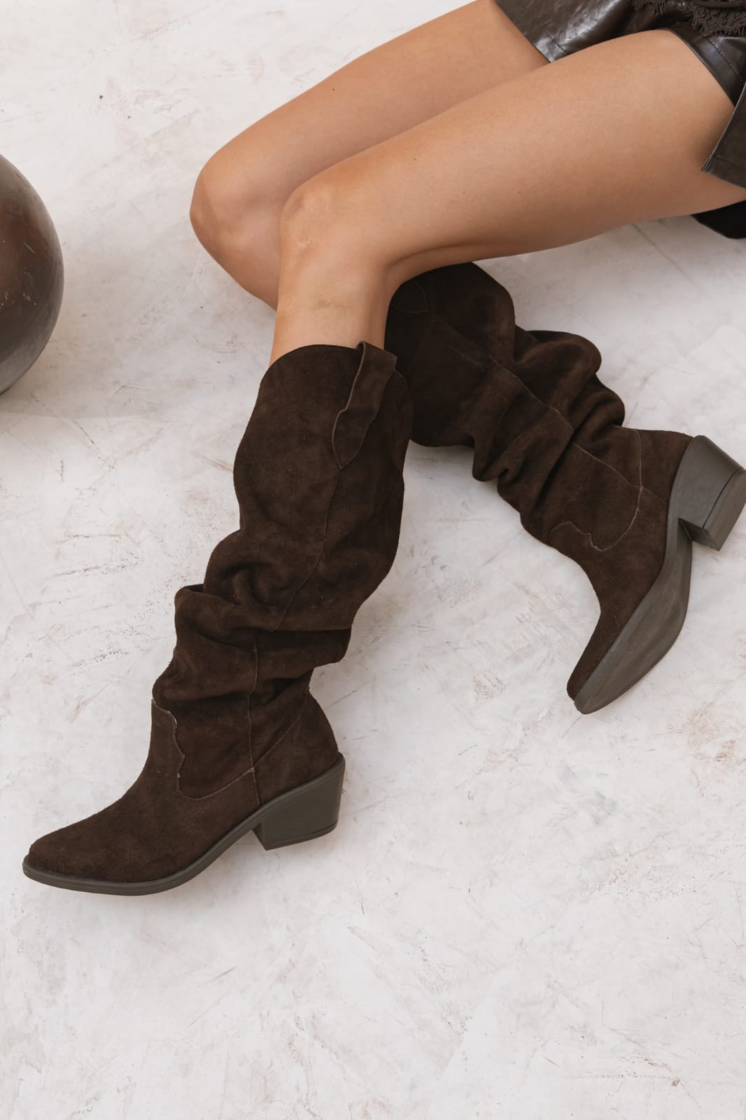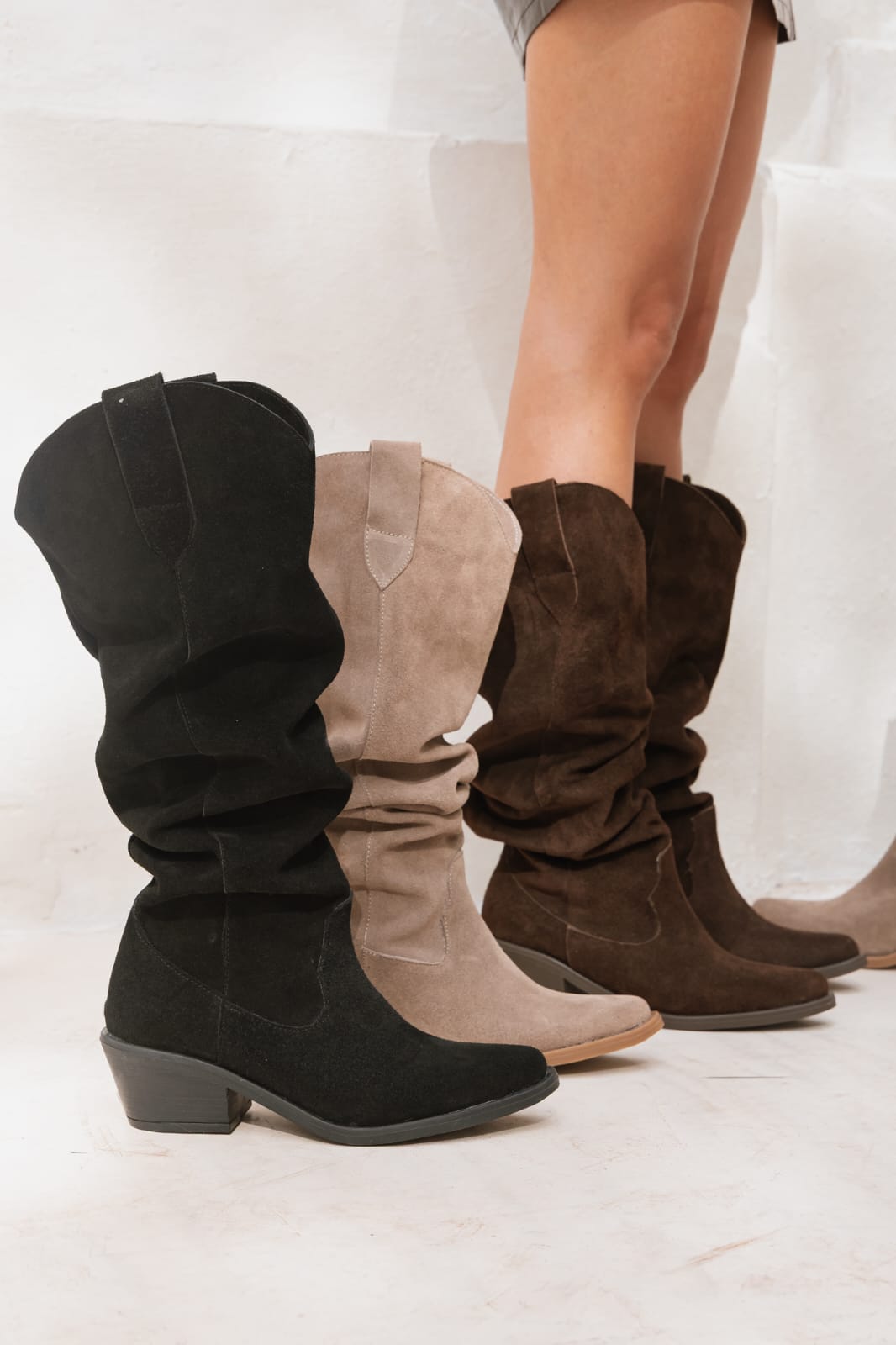 Bota de estilo texano con caña alta y caída suave que le da un look moderno y relajado. 2 estilos en una bota.Su diseño estiliza la pierna y el taco ancho aporta estabilidad y comodidad para usarla durante todo el día. Taco aprox 6 xm.