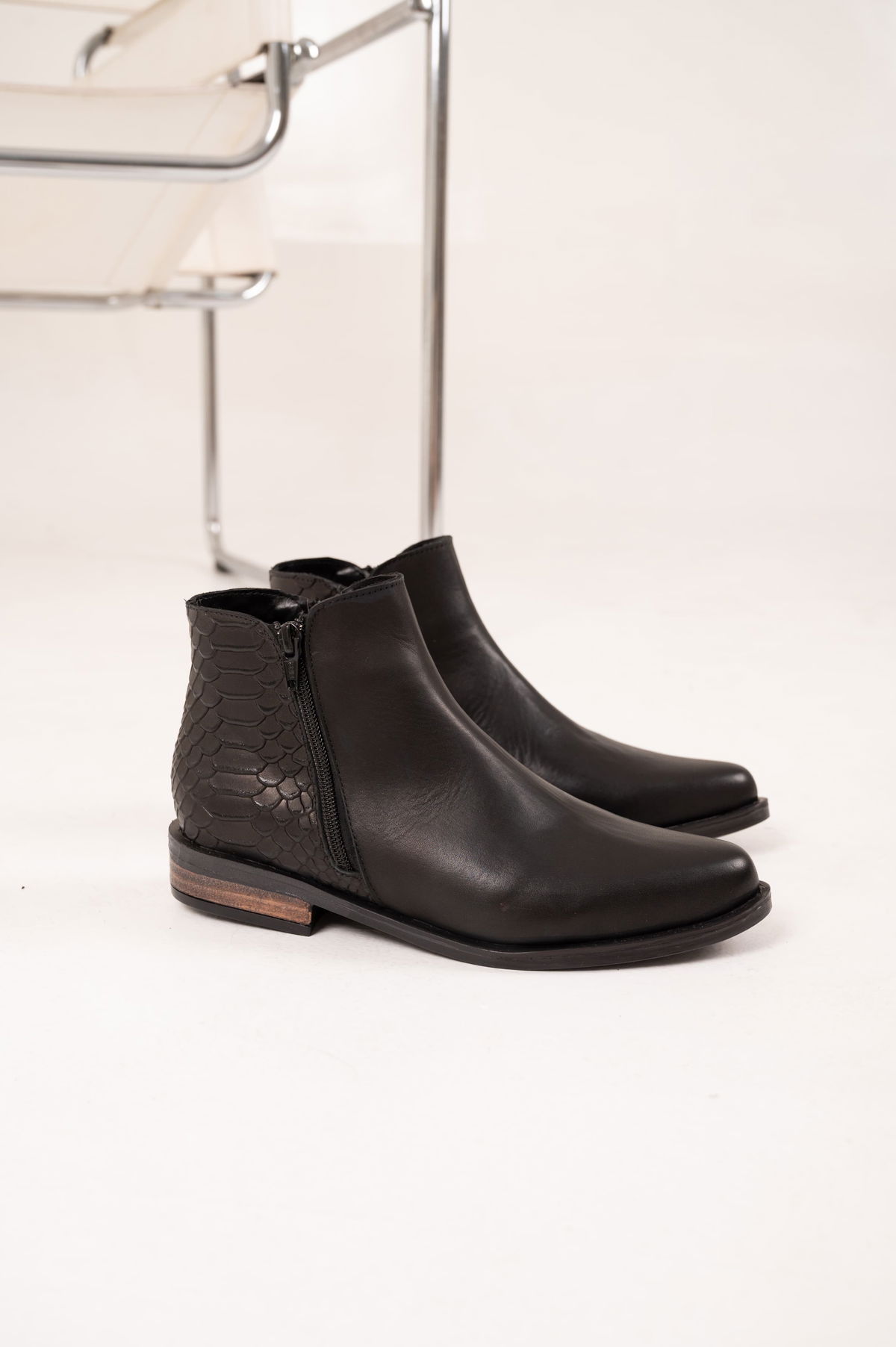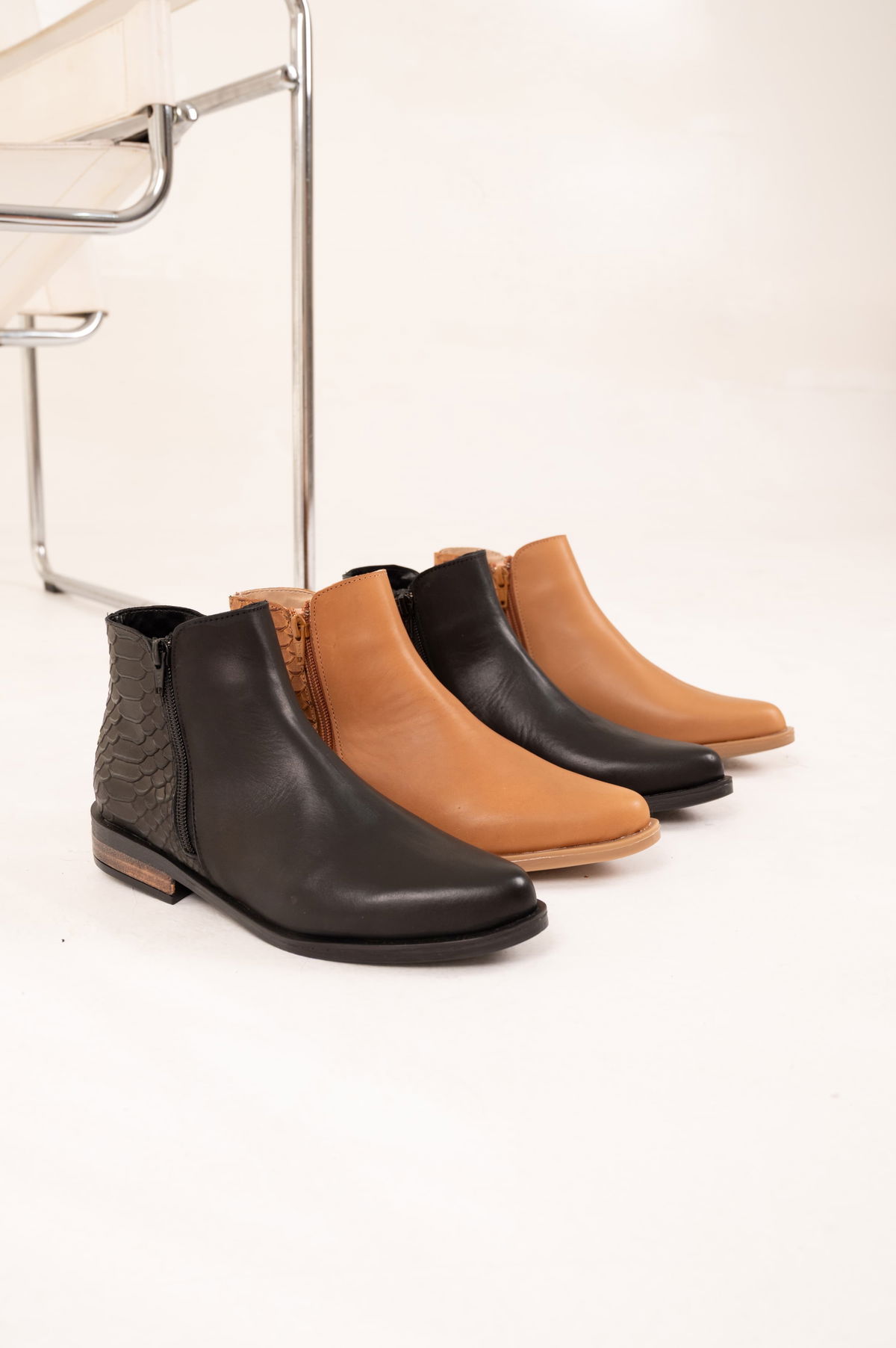 Botineta clásica y versátil, confeccionada en cuero, ideal para acompañar cualquier look de todos los días. Su diseño simple y atemporal, con cierre lateral que facilita el calce, la convierte en un básico infaltable para la temporada.