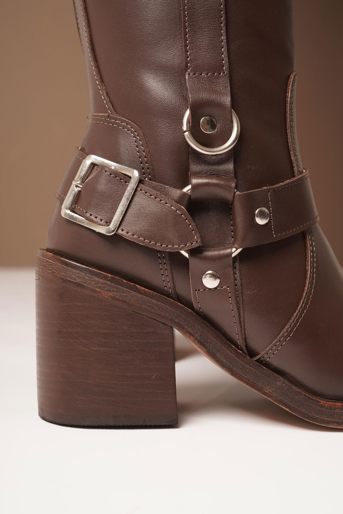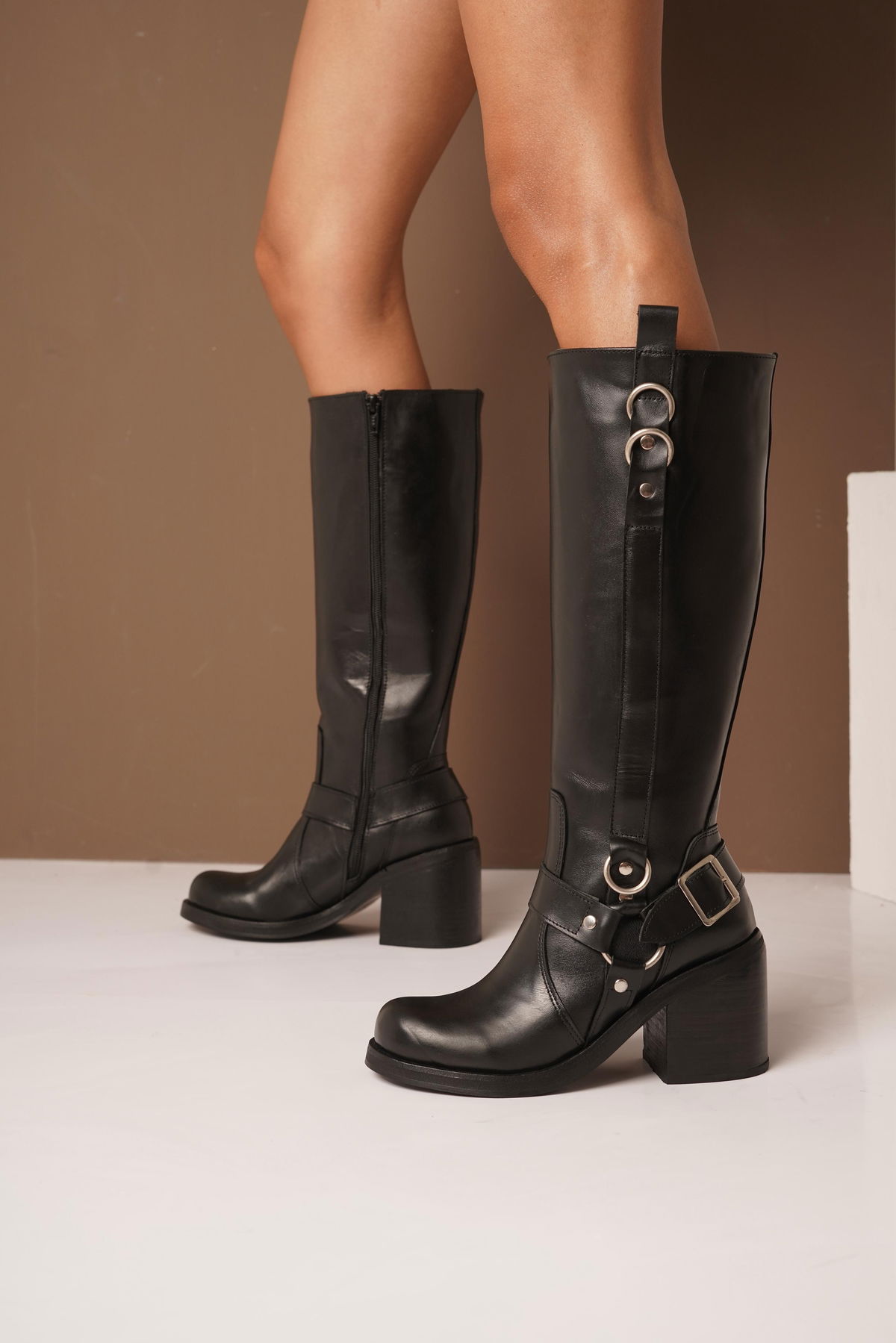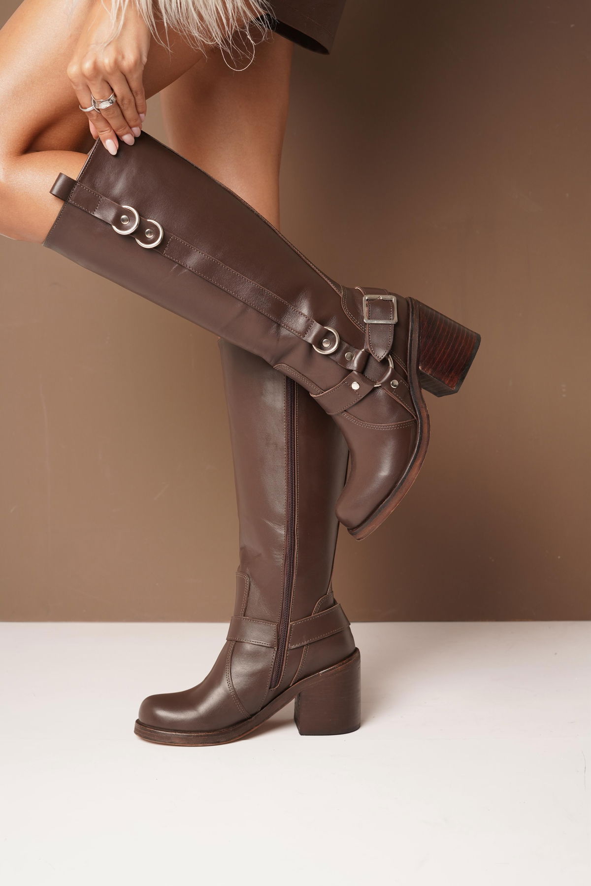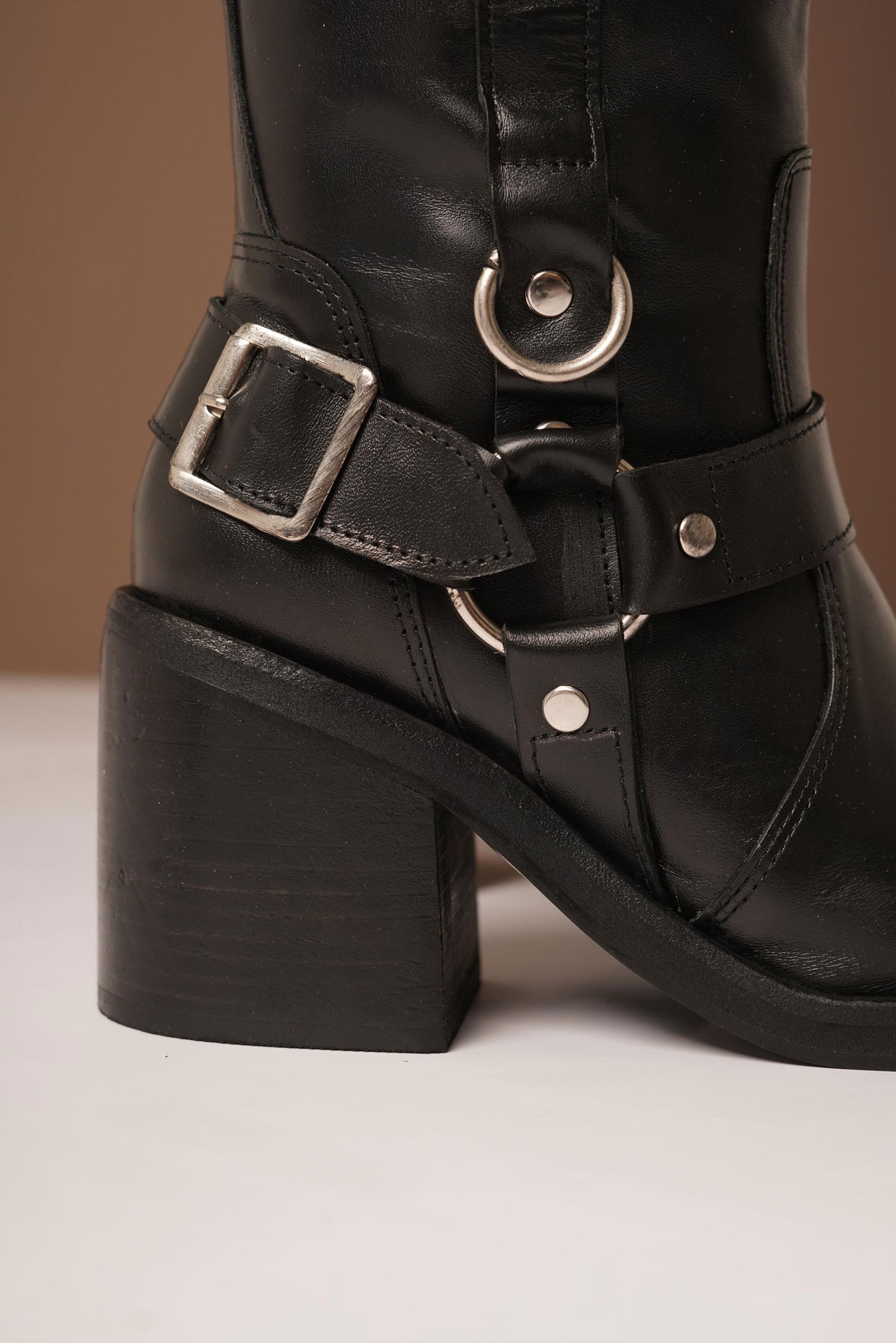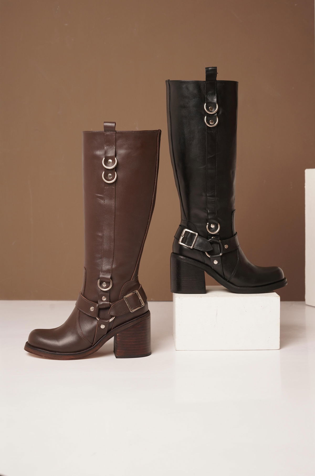 Bota de caña alta con un diseño moderno y con carácter. Confeccionada en cuero, combina detalles de hebillas y herrajes que le dan un estilo único. Su taco ancho de 6.5 cm aporta estabilidad y comodidad, ideal para usar todo el día y elevar cualquier look de temporada.