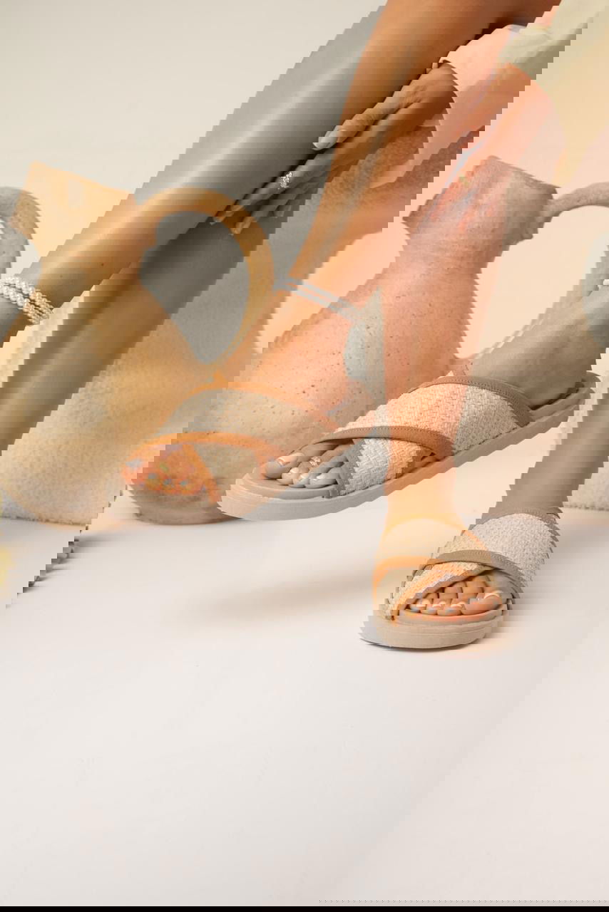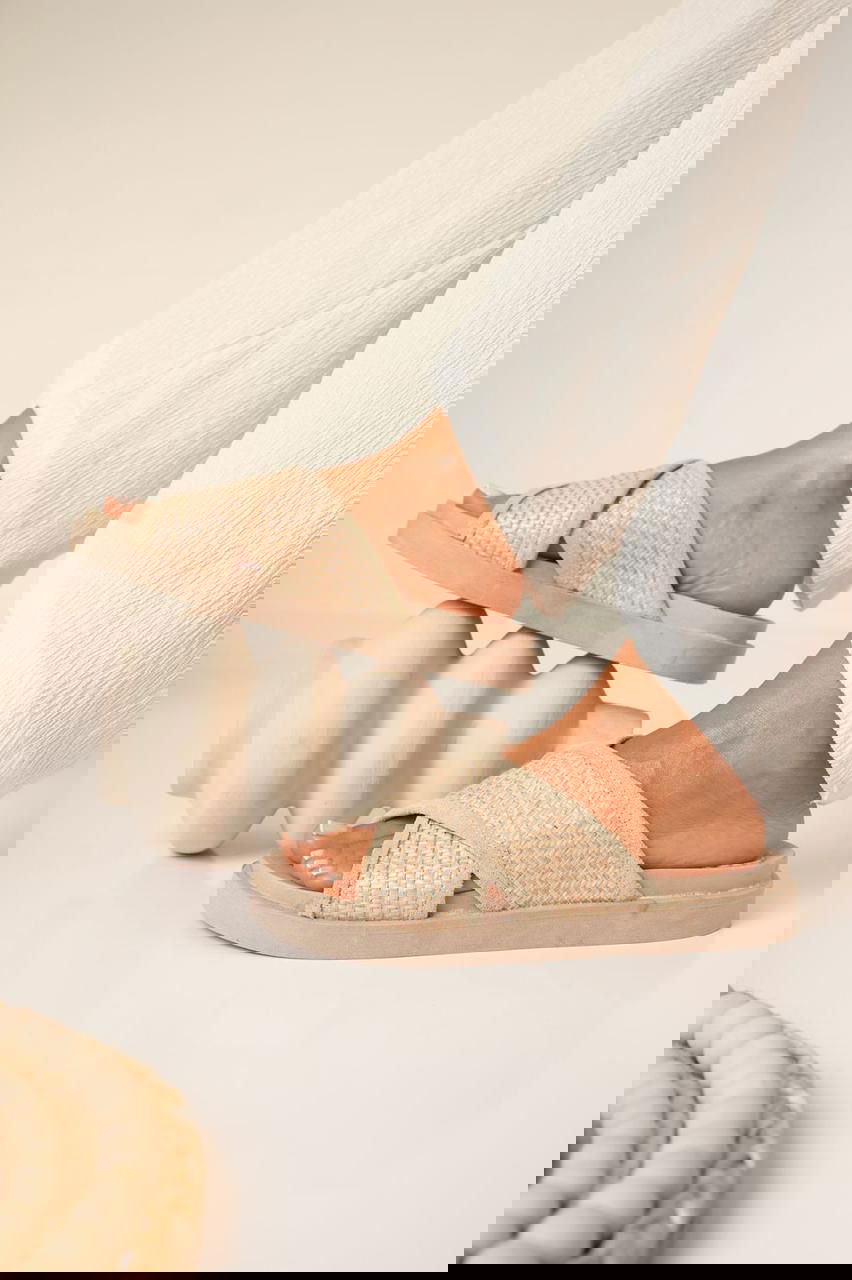 Sandalias de rafia con tiras cruzadas y terminaciones en tono suela. Diseño simple y canchero, súper livianas y cómodas, ideales para el día a día y para acompañar looks relajados de verano con un toque natural y moderno.