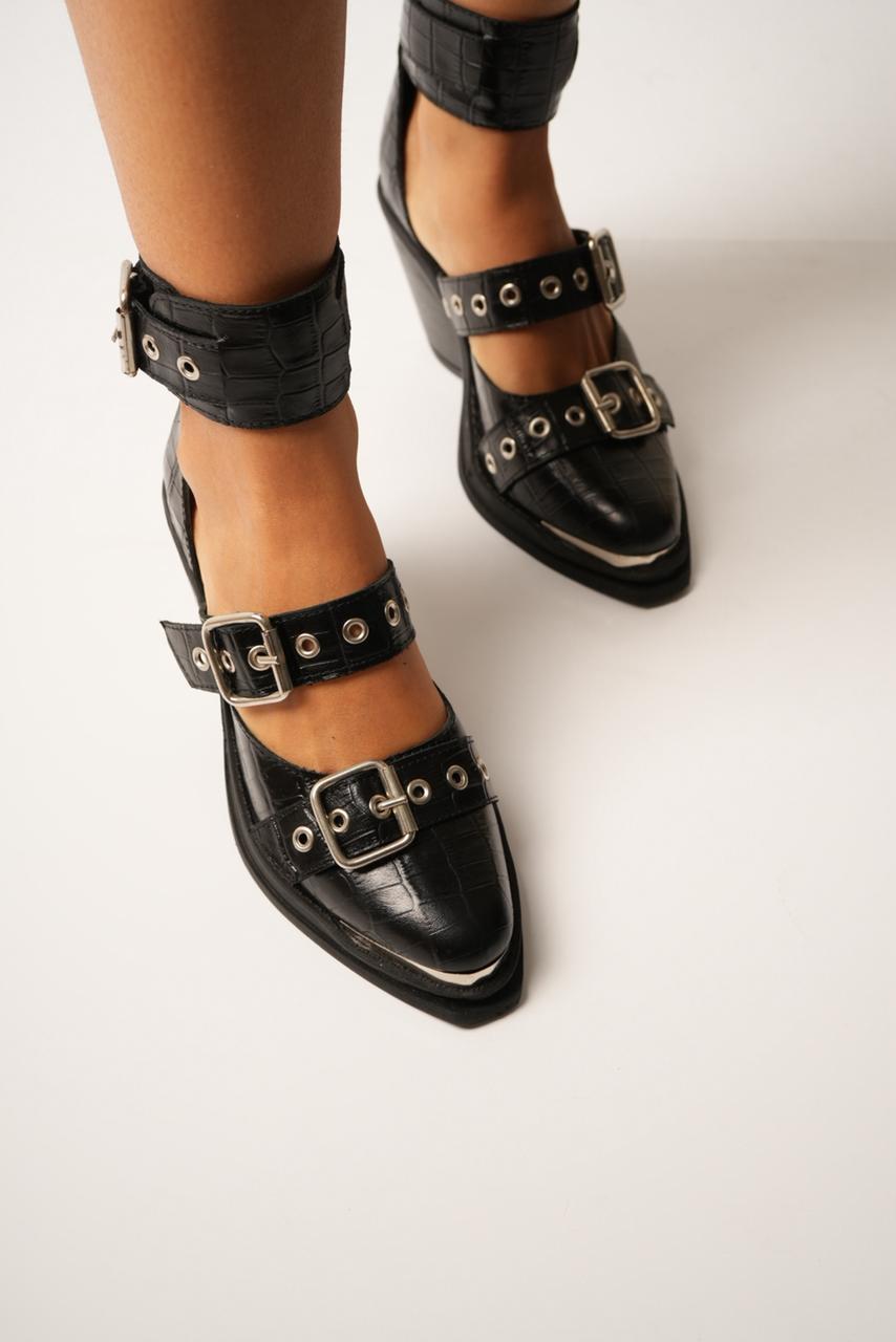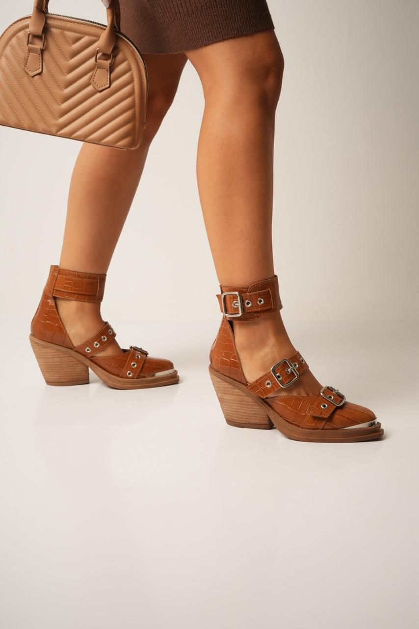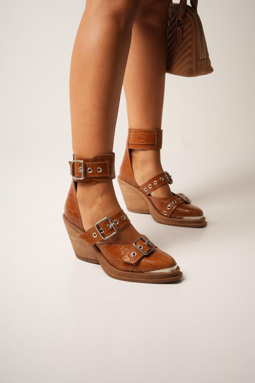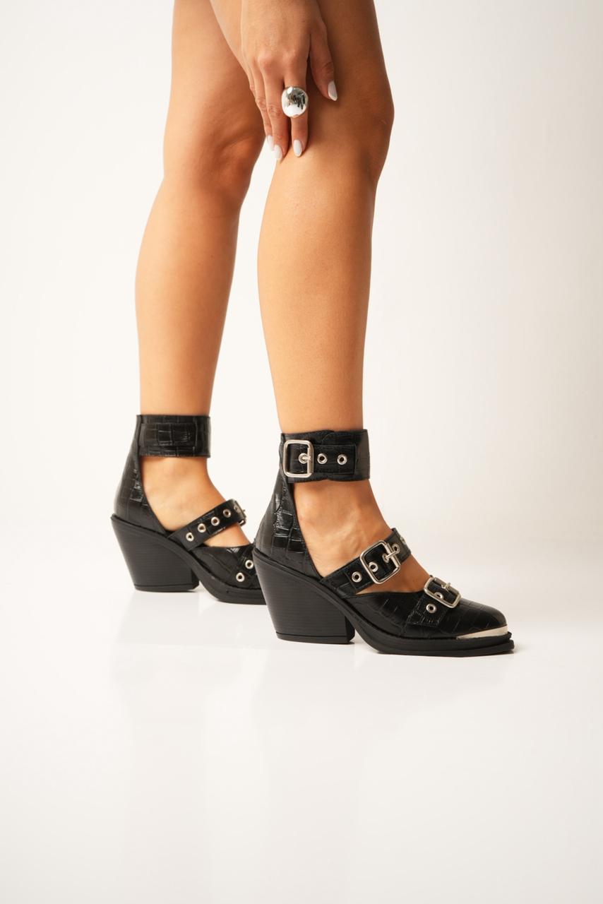 Zapatos con pulsera y triple hebilla. Taco de 8 cm aprox más base de 2 cm.